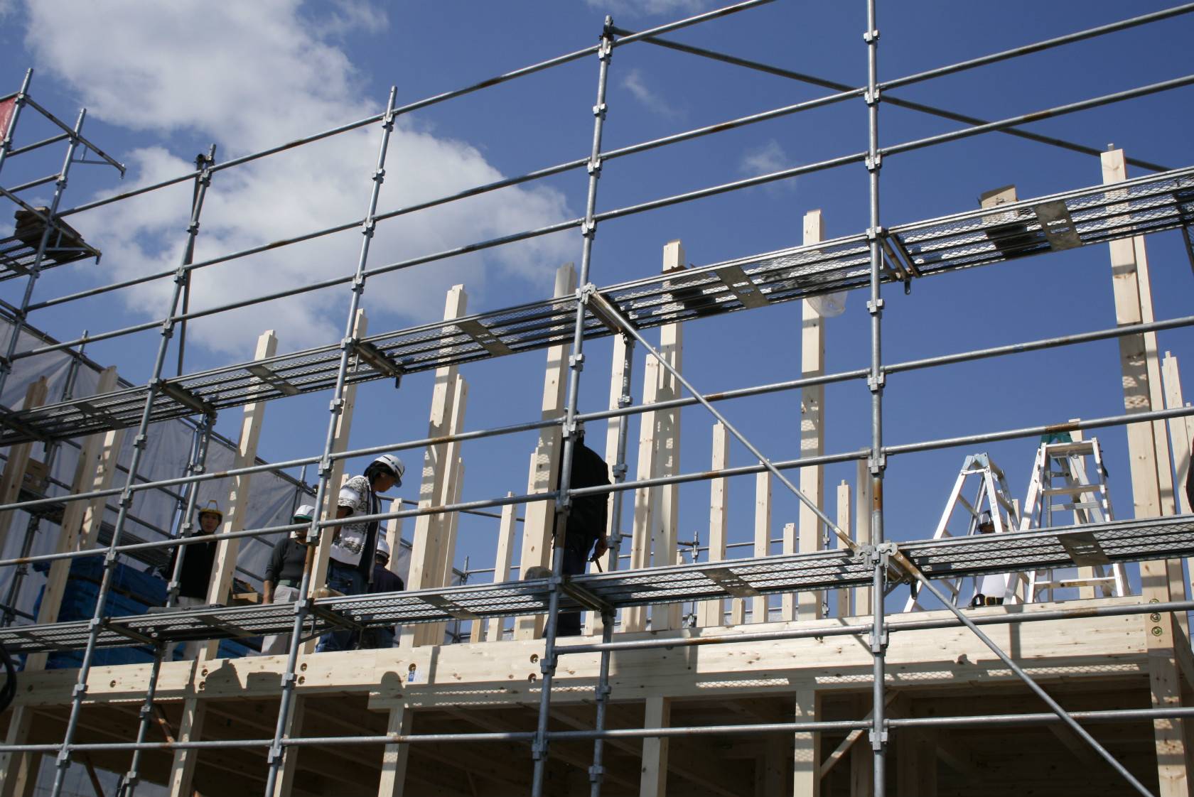 柱や梁を2階の屋根部分まで組み上げたら、