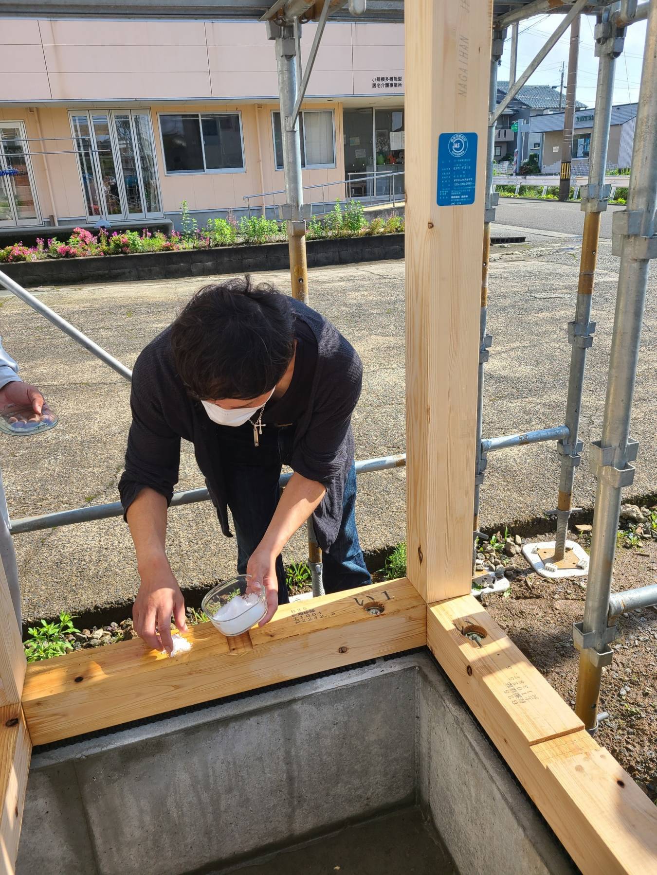 お施主さまには、建物の四隅に塩を盛り、お清めして頂きました。