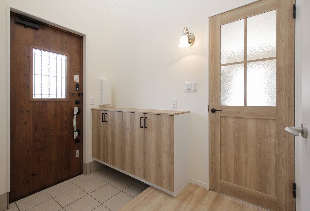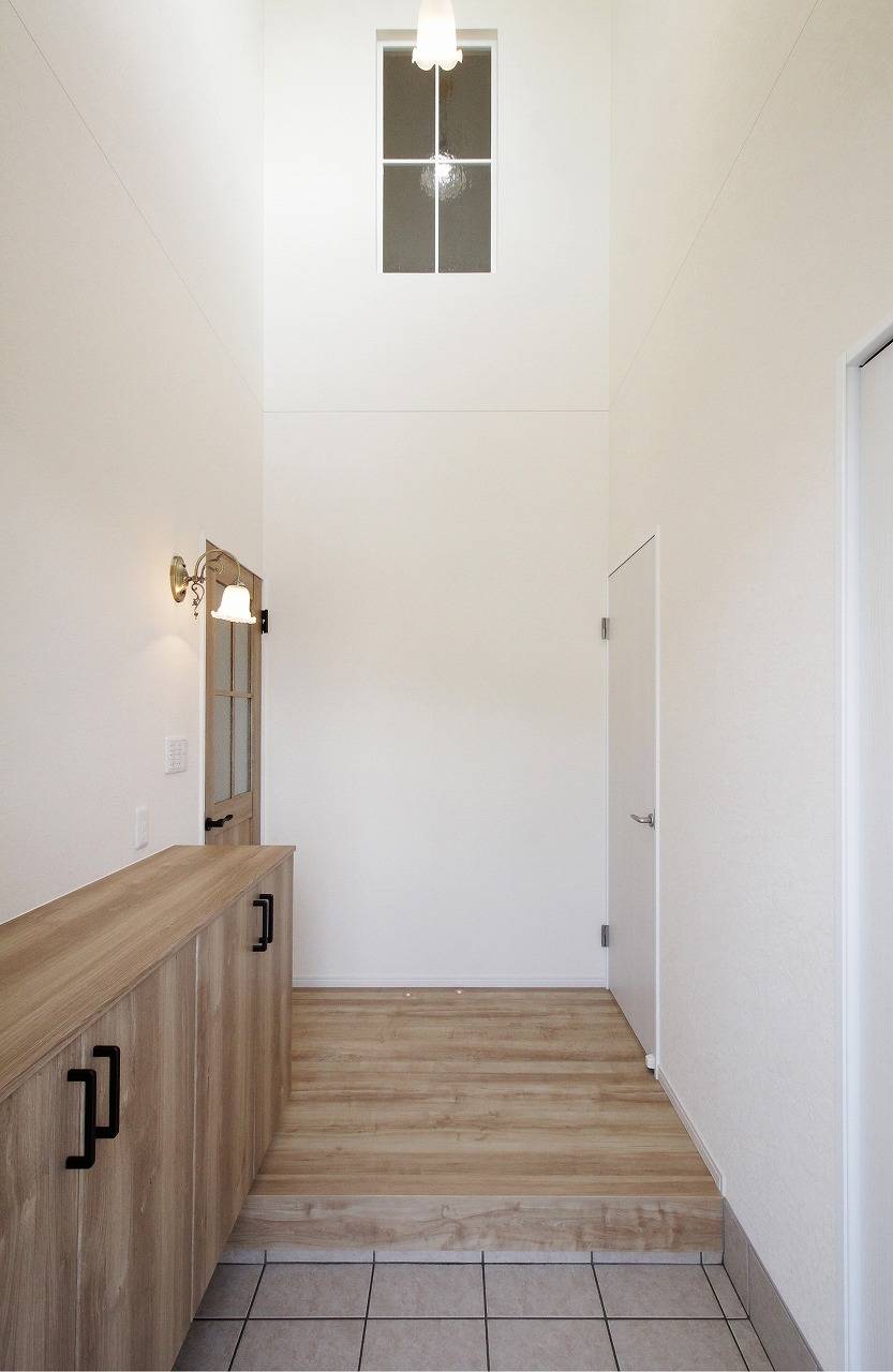 吹き抜けのある玄関ホールは便利な玄関収納も。可愛らしい照明がポイントです。