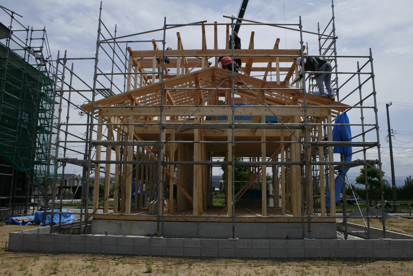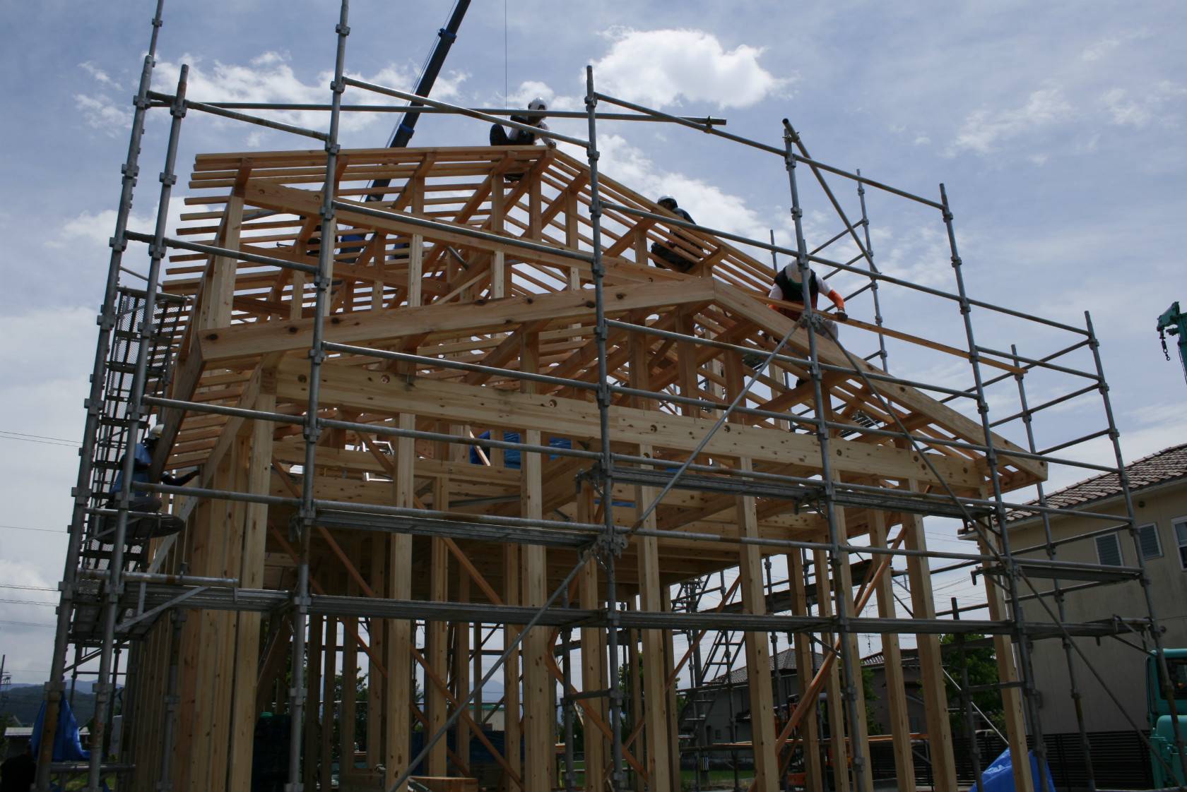 柱や梁を2階の屋根部分まで組み上げたら、職人さん達が垂木を掛けていきます。