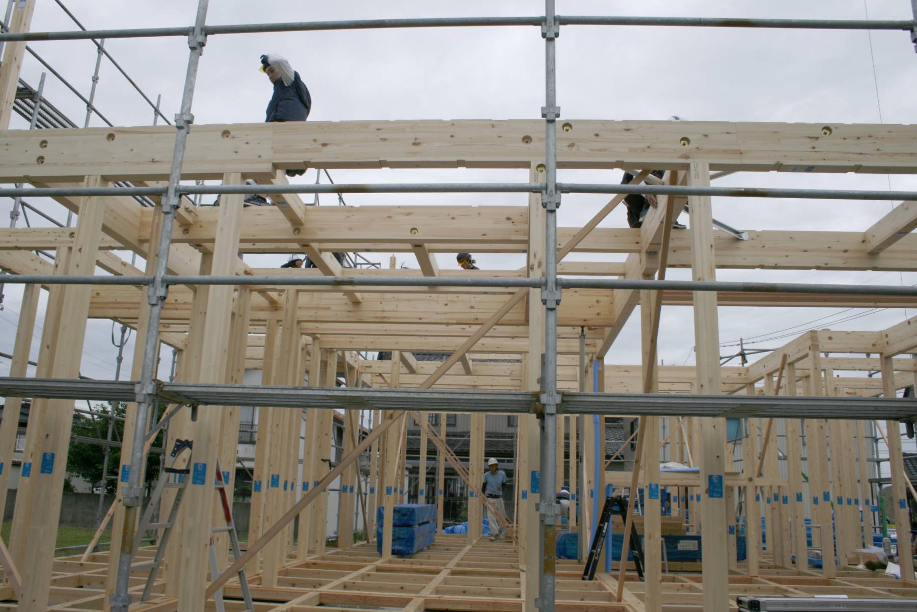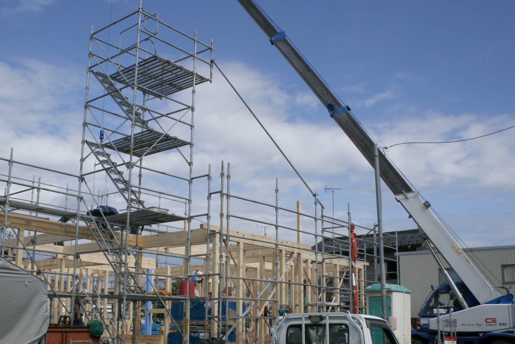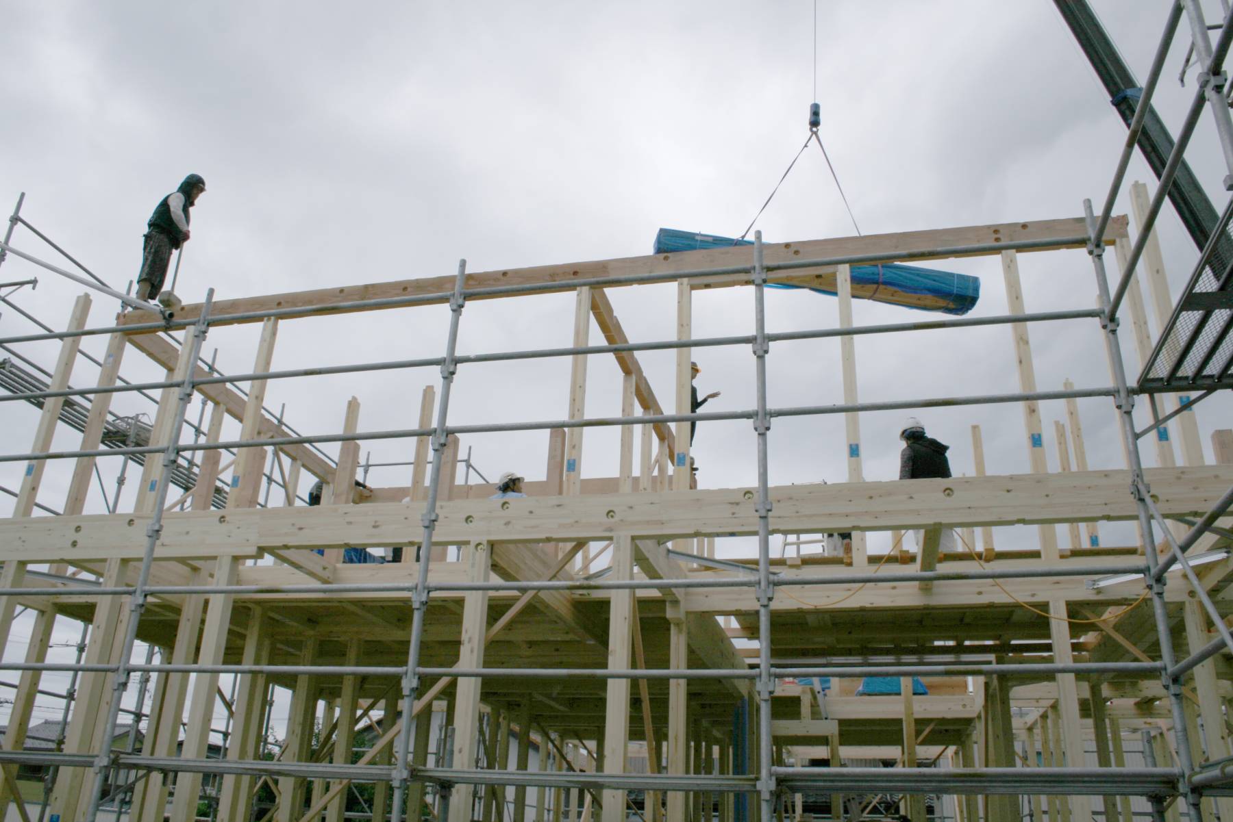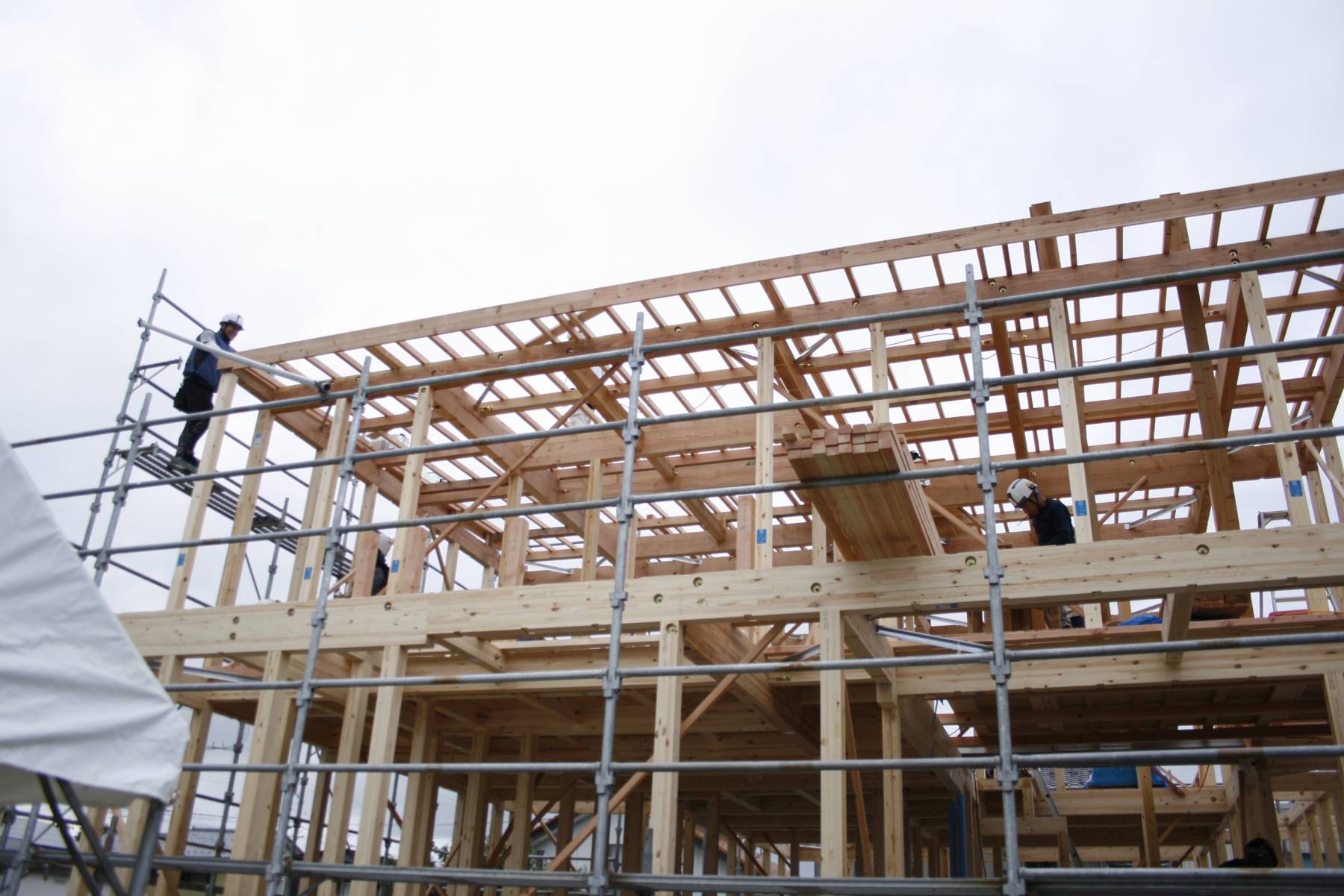 柱や梁を2階の屋根部分まで組み上げたら、職人さん達が垂木を掛けていきます。