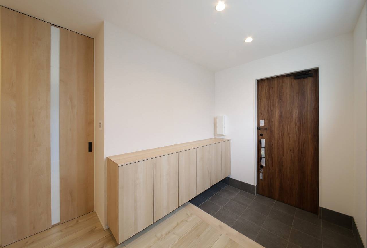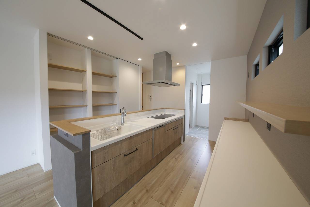 サンルーム、ファミリークローク、浴室等への動線を短くしたキッチン。引き戸で隠せる収納やハイドアでスタイリッシュに。