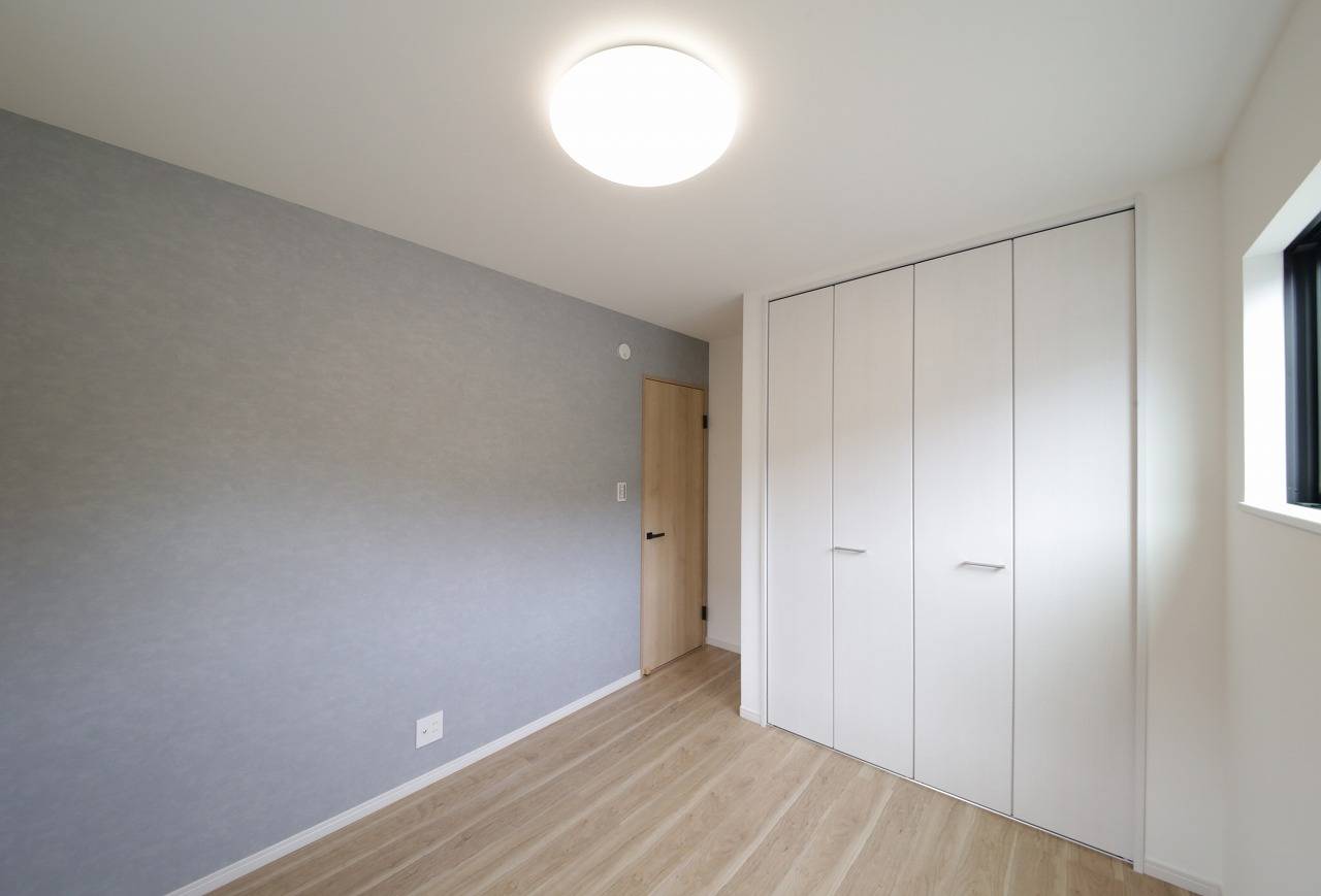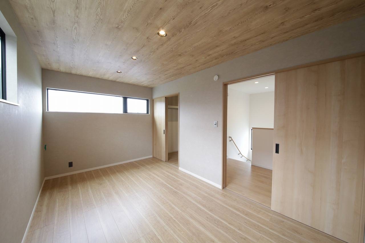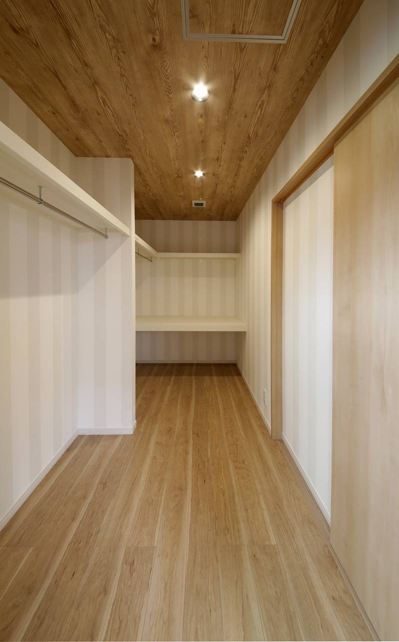 木目調の天井が温かみある主寝室。ウォークインクローゼットはストライプ柄でおしゃれに。