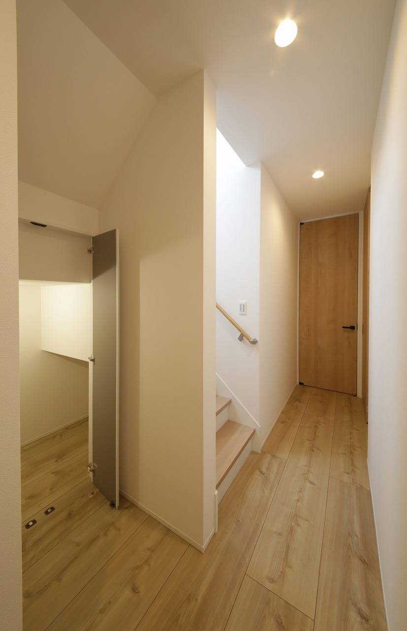 スペースを有効活用した階段下収納。掃除道具などをすっきりと収納できます。