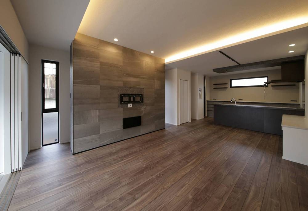 【1F】シックなデザインの子世帯LDK。壁掛テレビの裏には大きな収納スペース。隠す収納が可能なので、リビングはいつでもスッキリです。