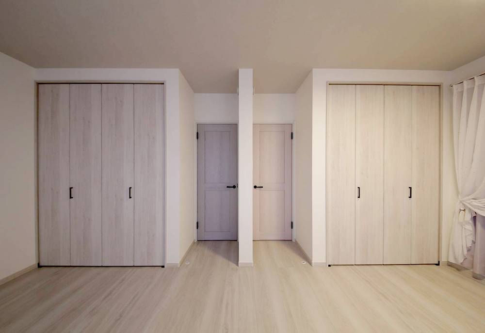 【2F】将来、間仕切可能な子供部屋。ブルーとピンクの色違いのドアがとってもキュートです。