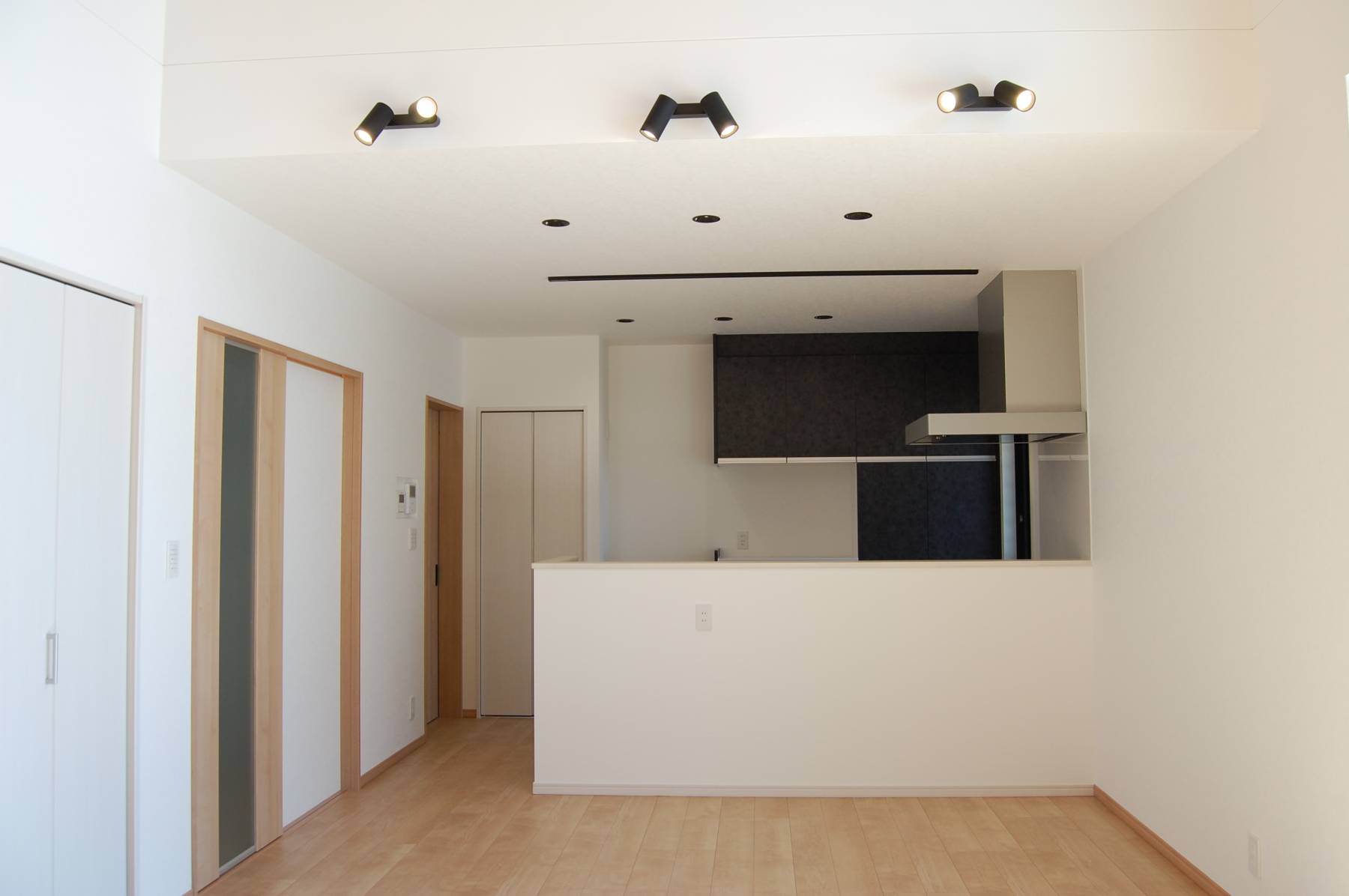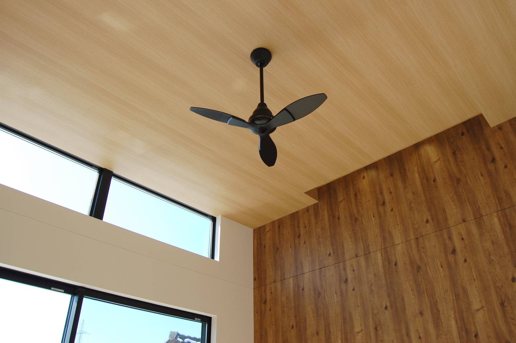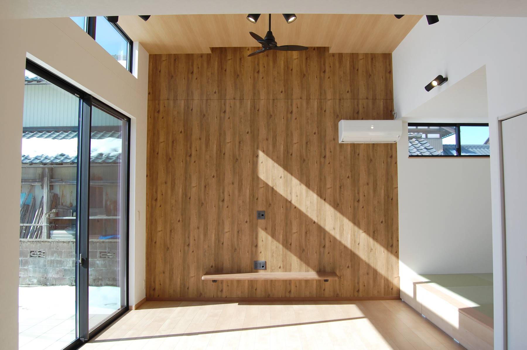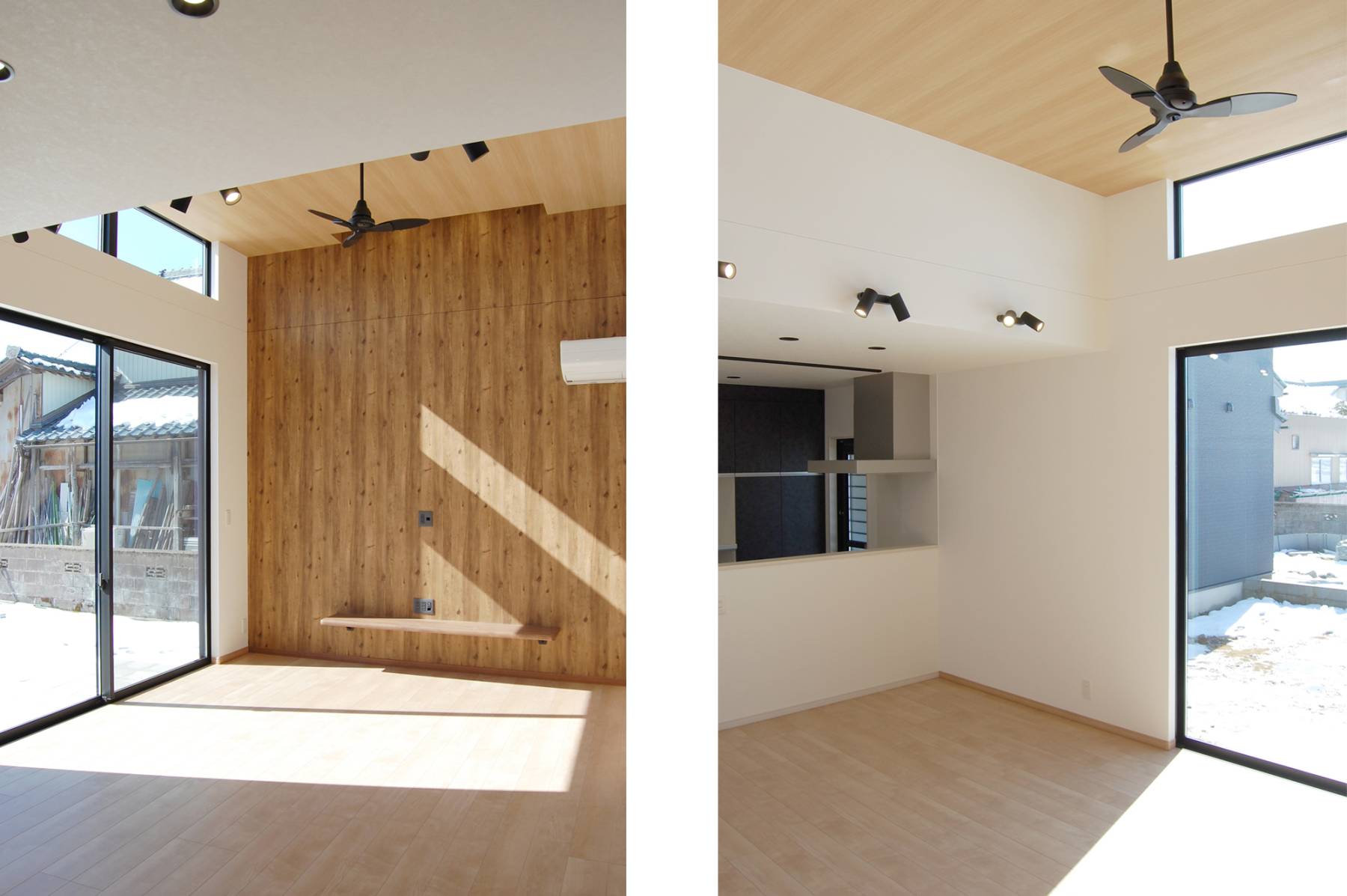 木目調の壁と天井が居心地の良いリビングを演出。南向きの大きな窓からは暖かい日差しが差し込みます。