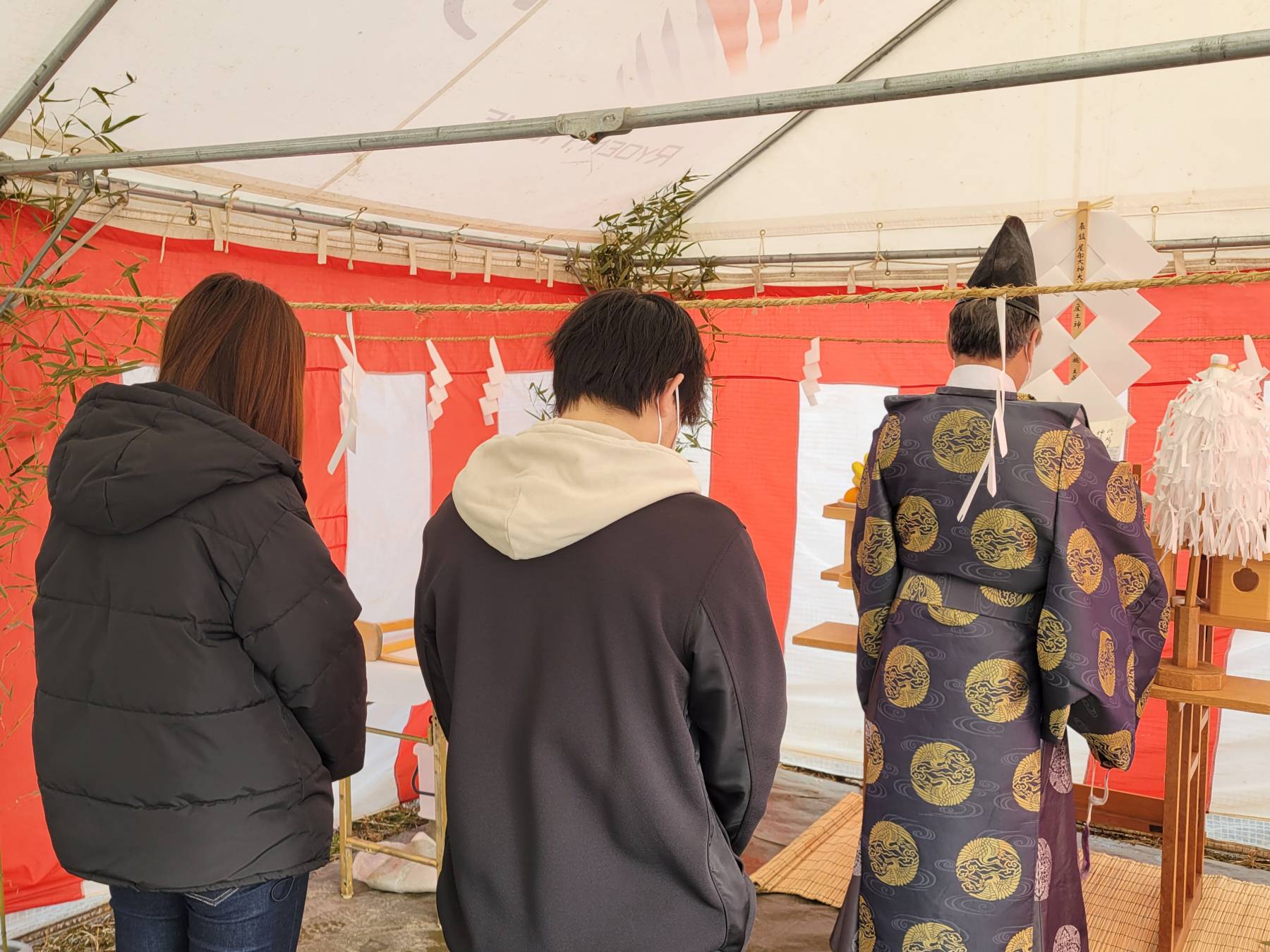 まずはこの土地の神様をお呼びする儀式を行い、建物の建つ四隅をお清めします。