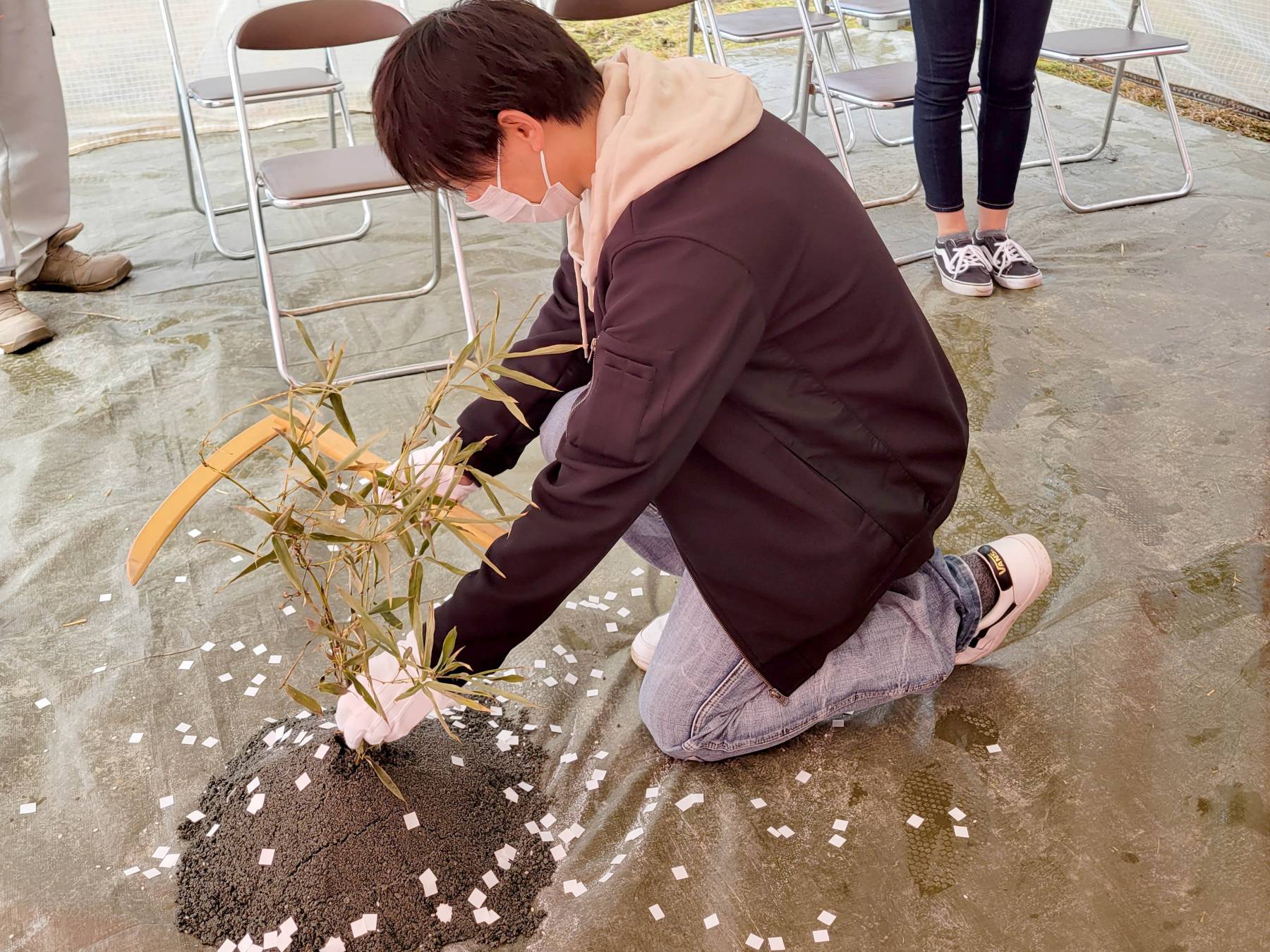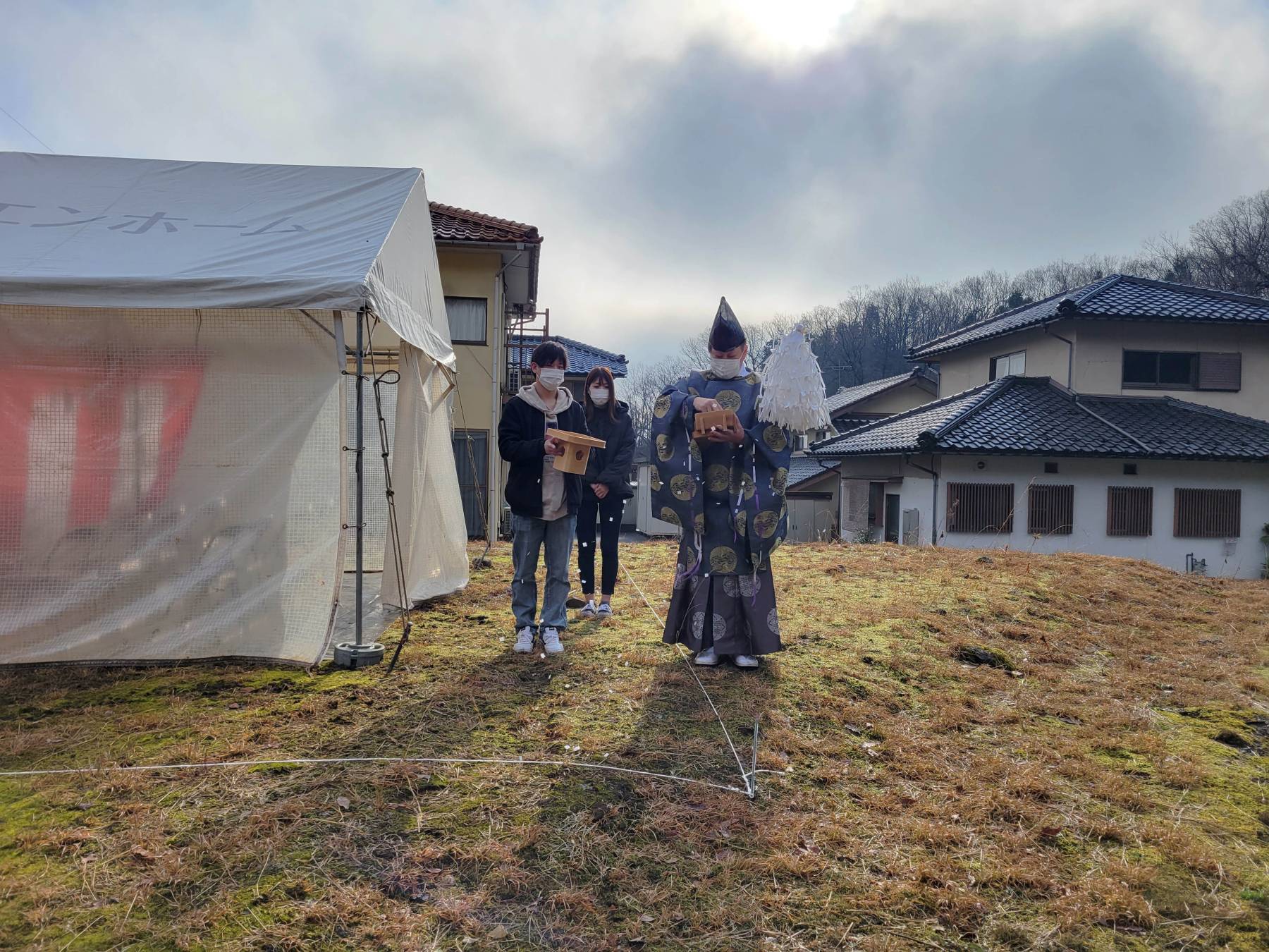 お清めが済むとテントに戻り、この土地に初めて手を入れる儀式をします。