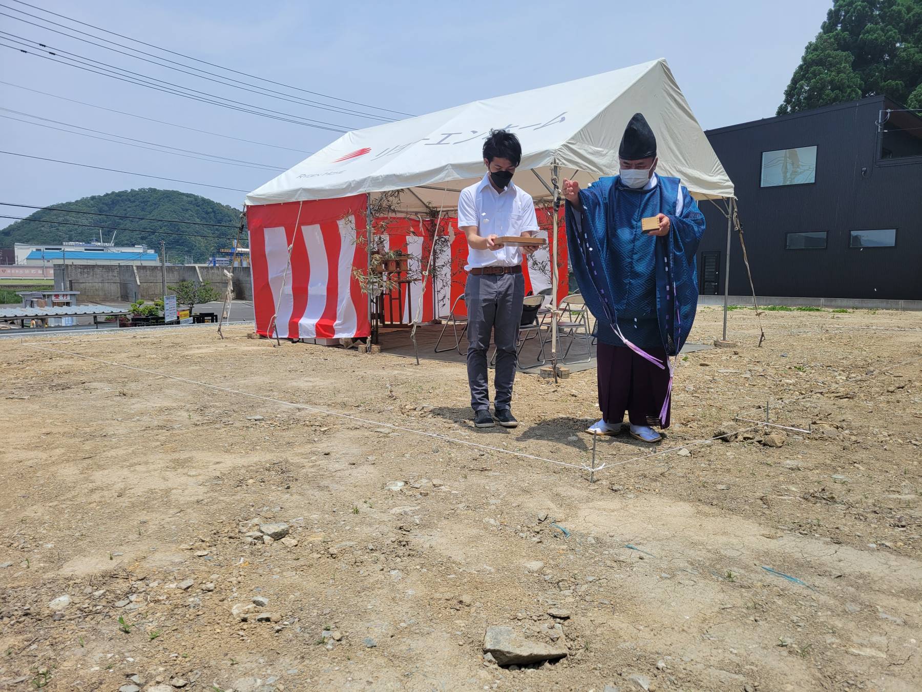 まずはこの土地の神様をお呼びする儀式を行い、建物の建つ四隅をお清めします。