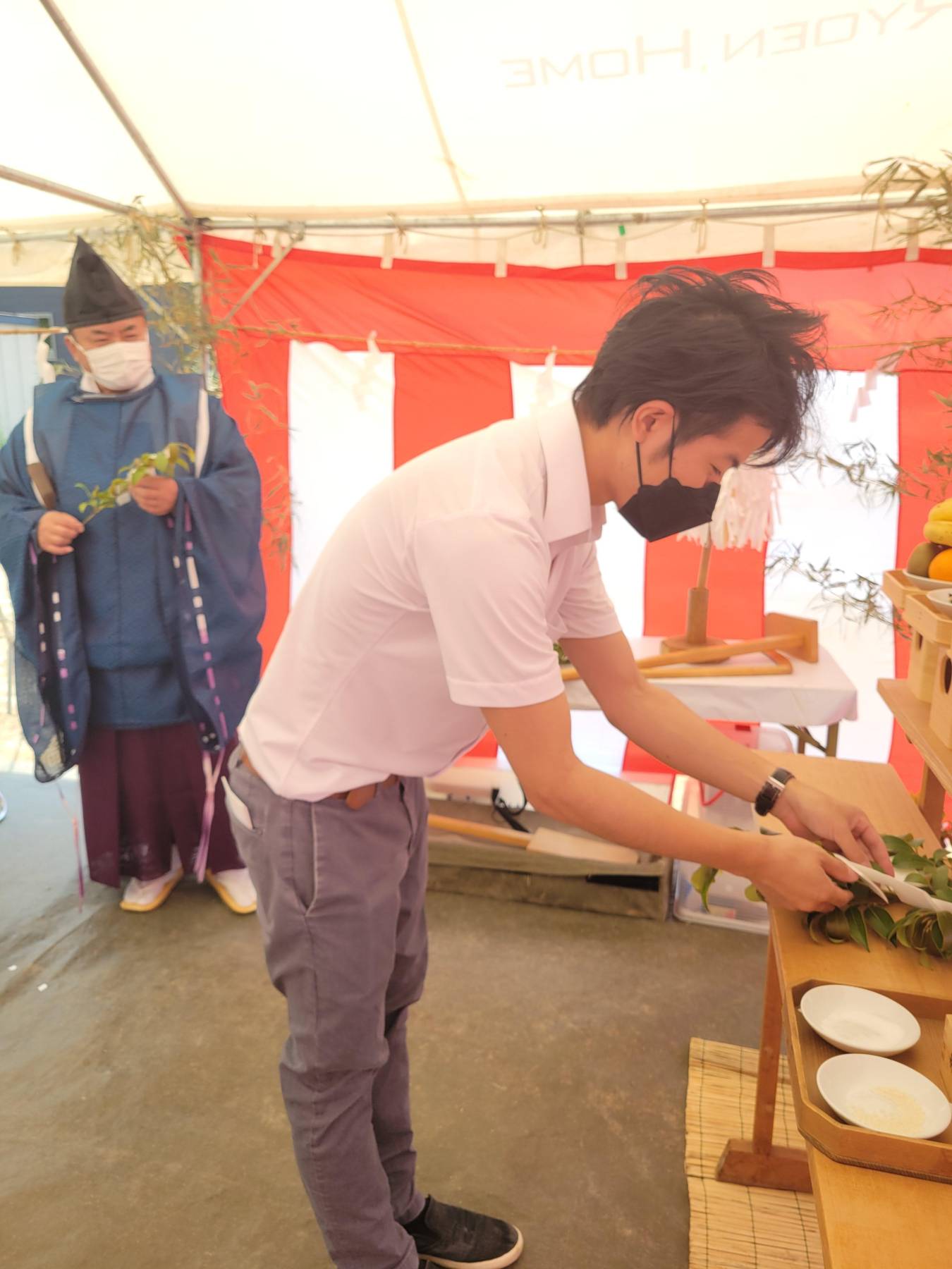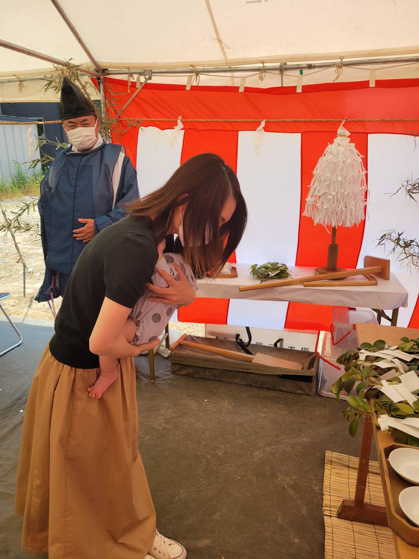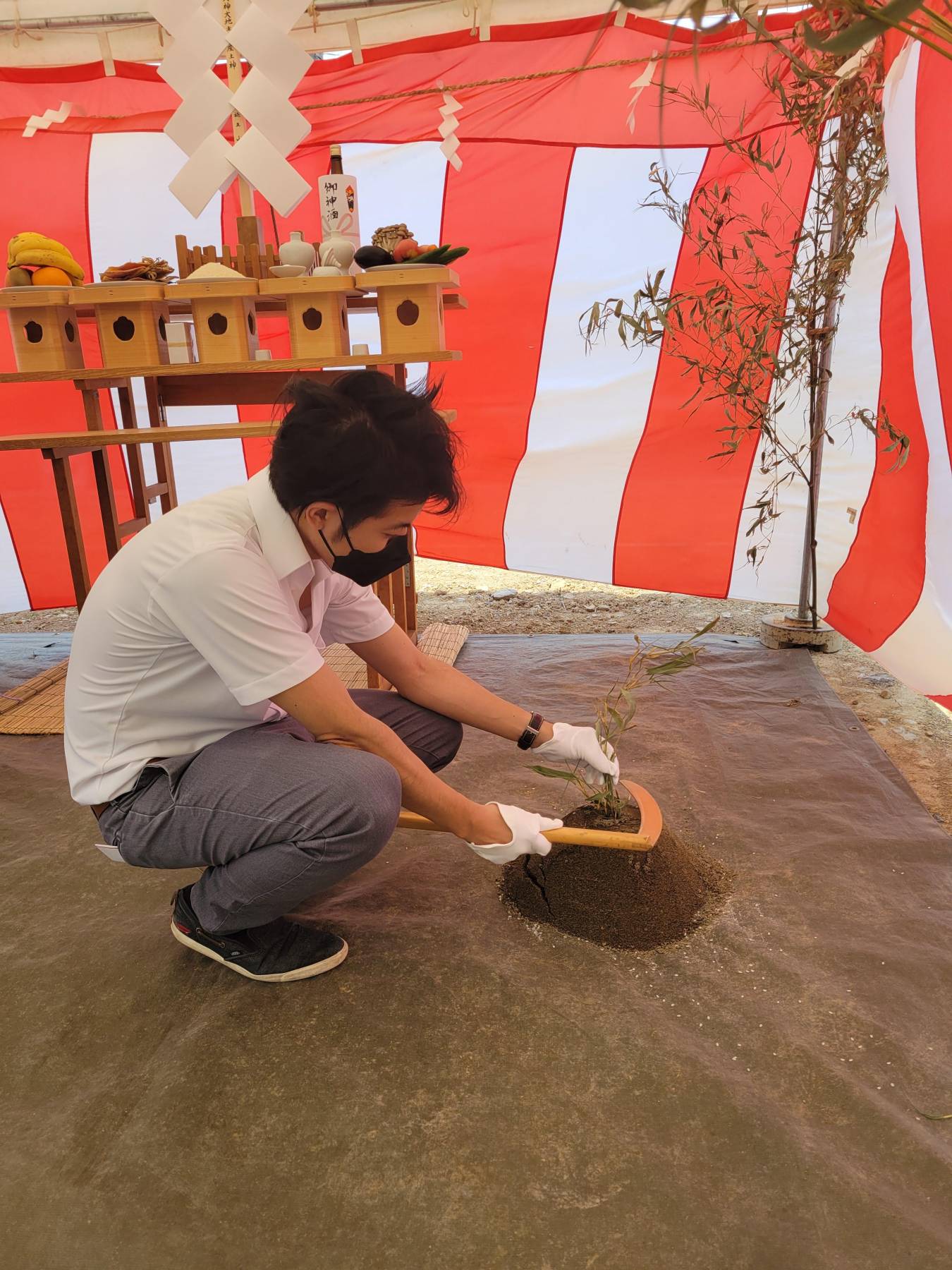 お清めが済むとテントに戻り、この土地に初めて手を入れる儀式をします。
