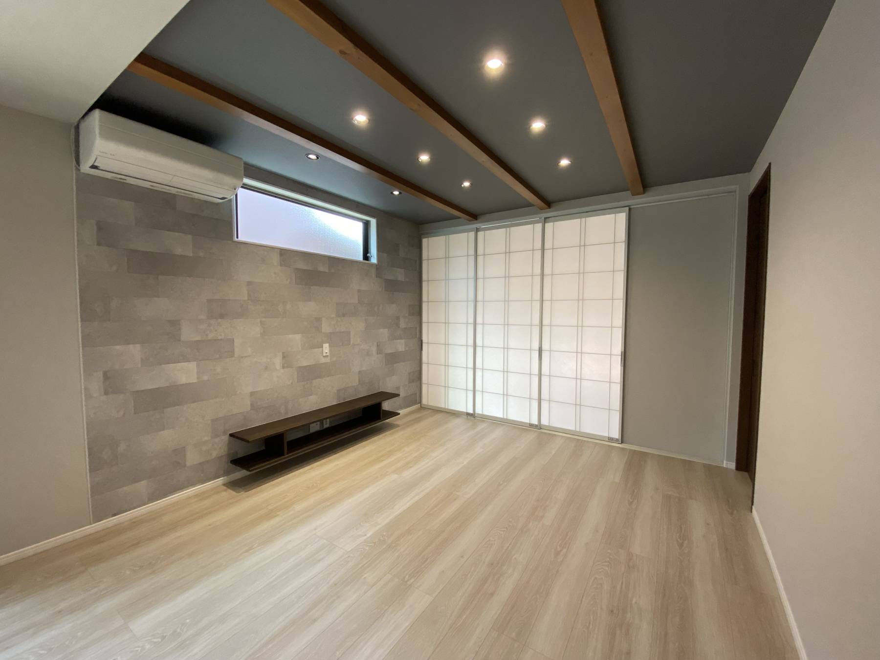 シックなグレーの天井に木目の梁がアクセントになったリビング。