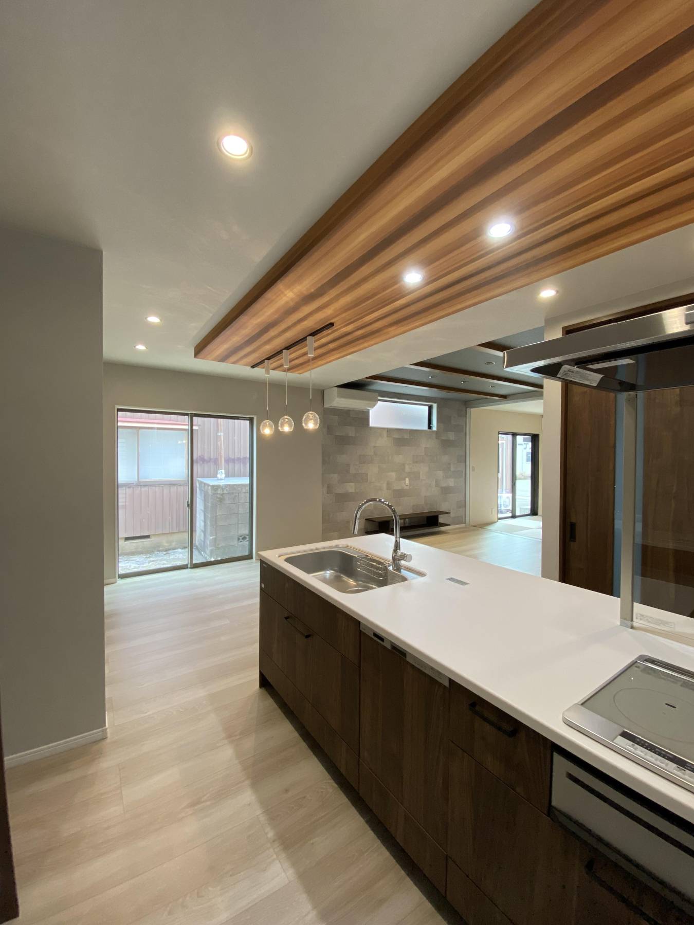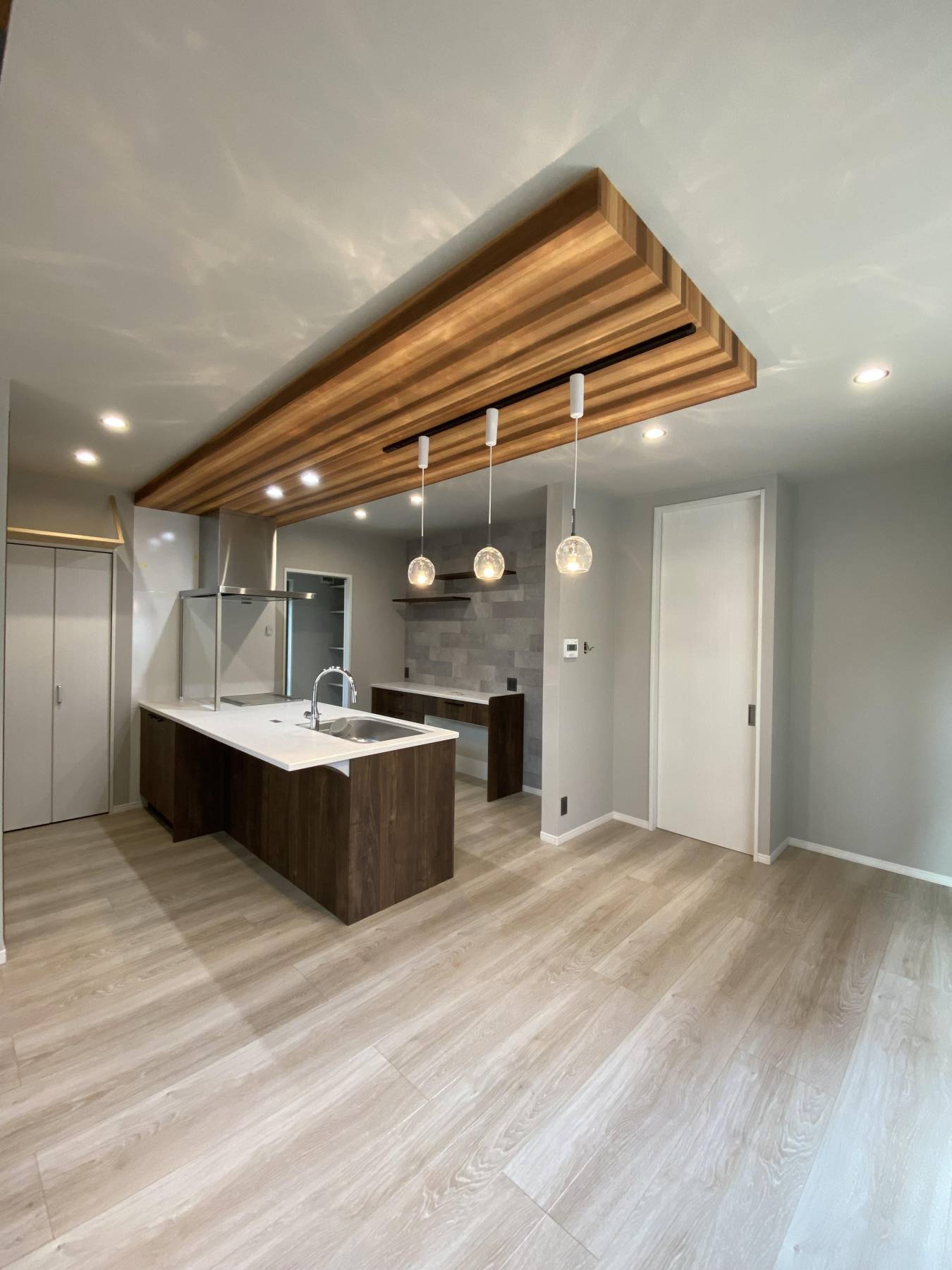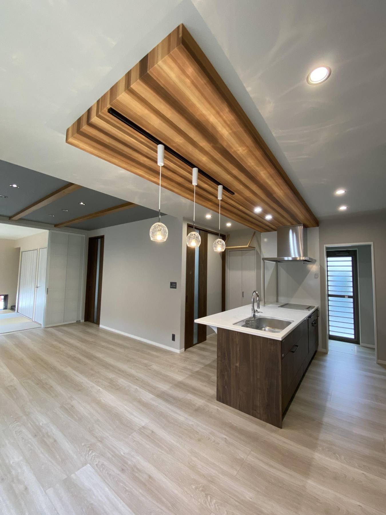 ダイニングキッチンは木目の下がり天井が美しくオシャレに仕上がっています。
