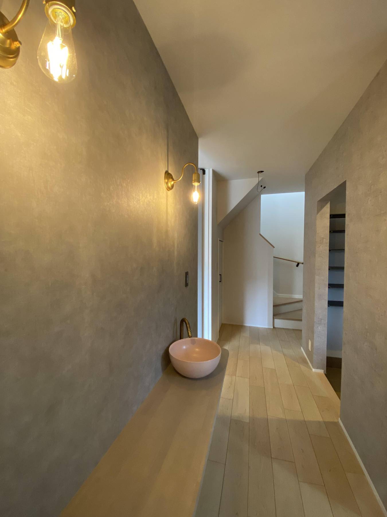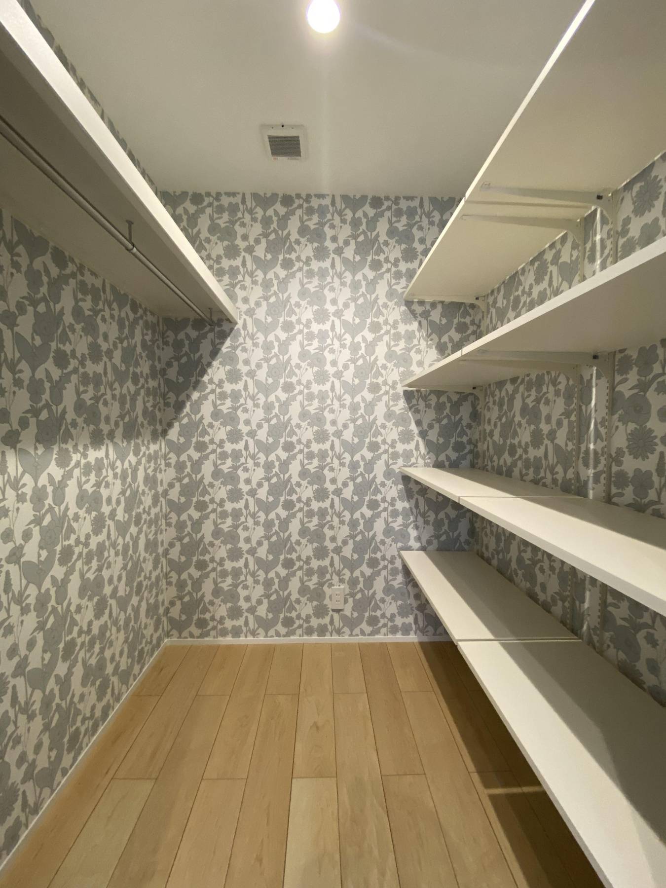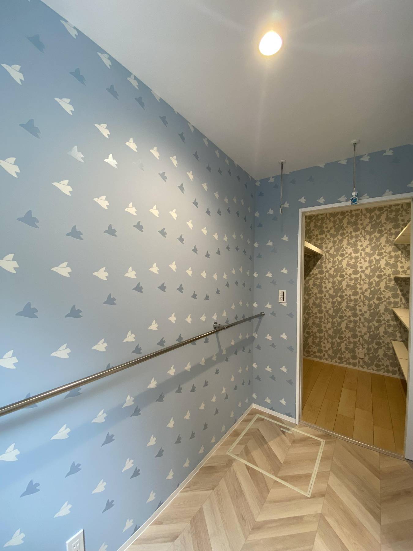 かわいいクロスが印象的なサンルームとファミリークローゼット。日々の家事の時間も気分があがります。