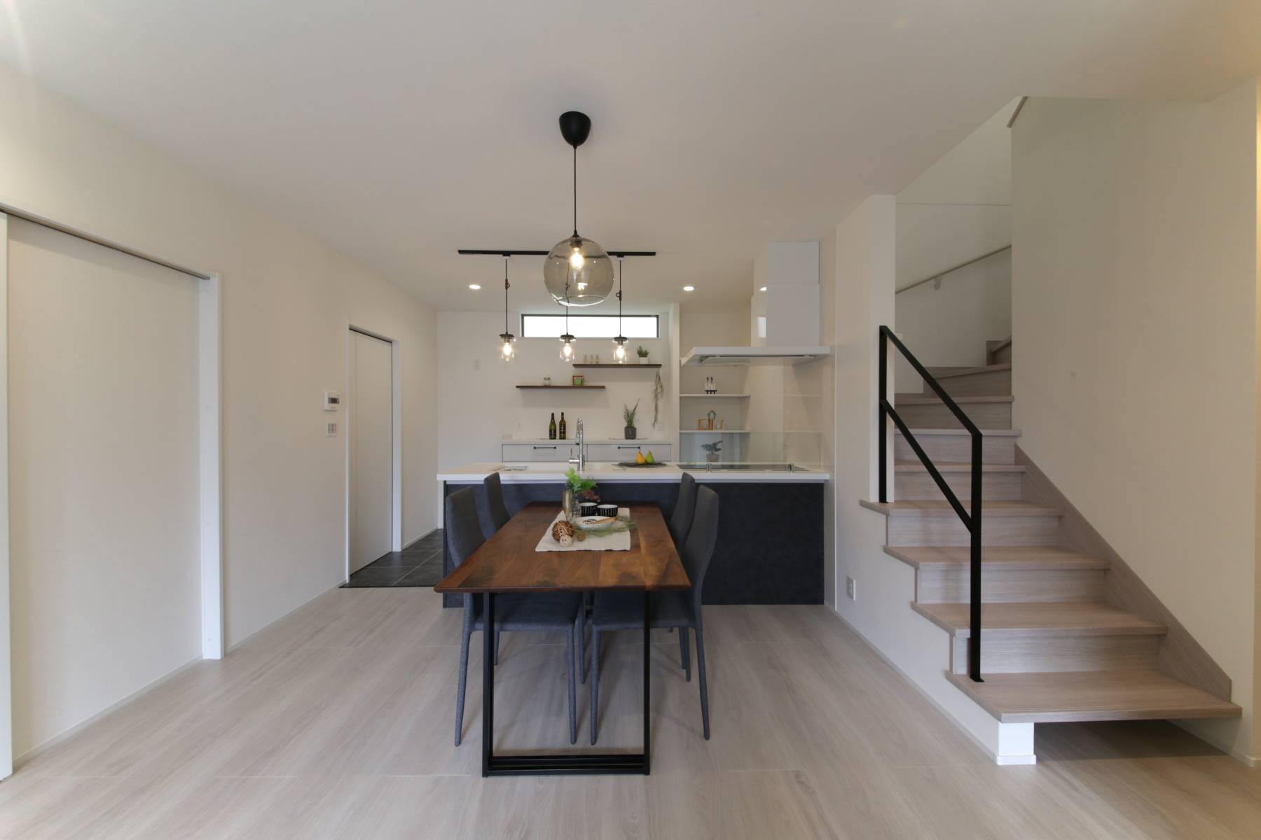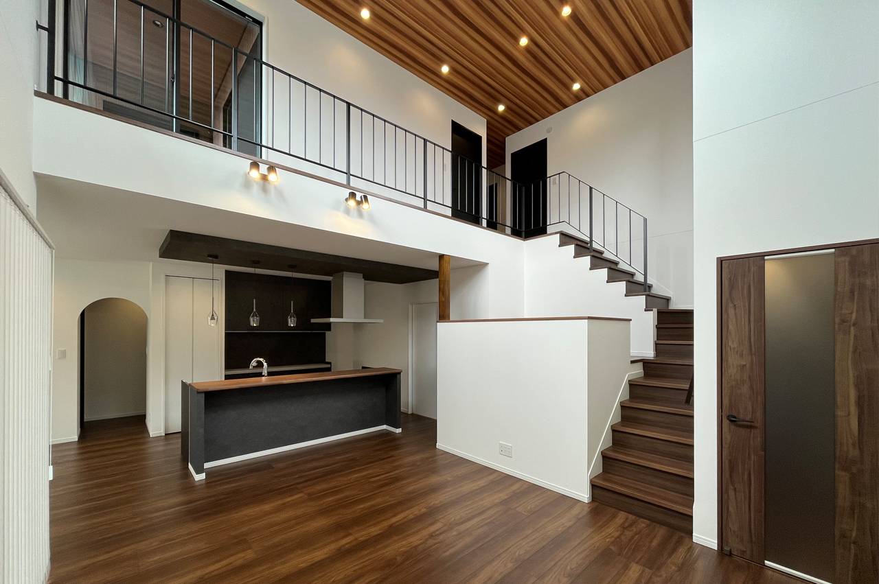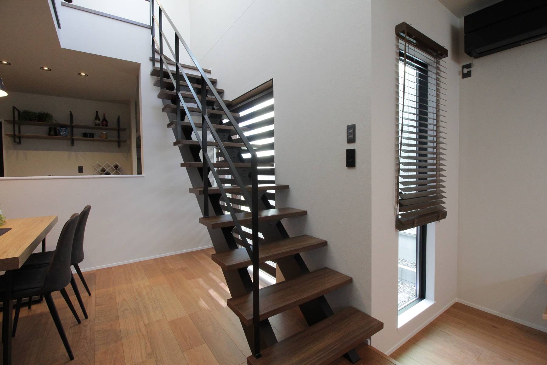 リビングの吹き抜けを利用して、オシャレなアイアンの手すりを設置したスケルトン階段は、存在感がありながら、スタイリッシュな空間を演出します。