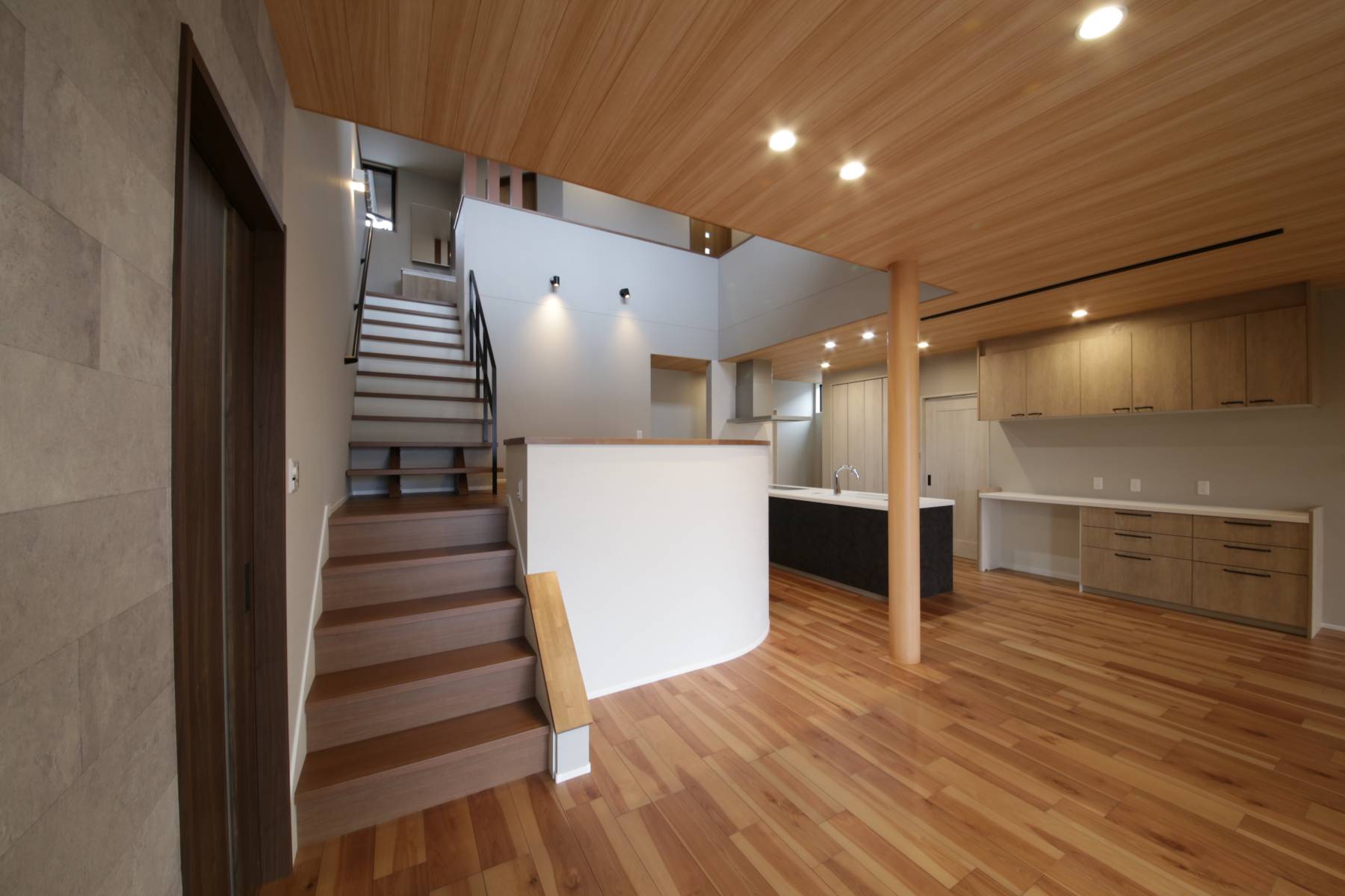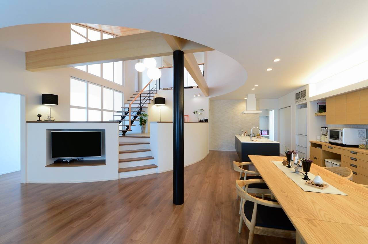 大きな吹き抜けのあるリビングに階段があることで、空間が緩やかにつながっているので開放感があり、家族間のコミュニケーションも活発になります。