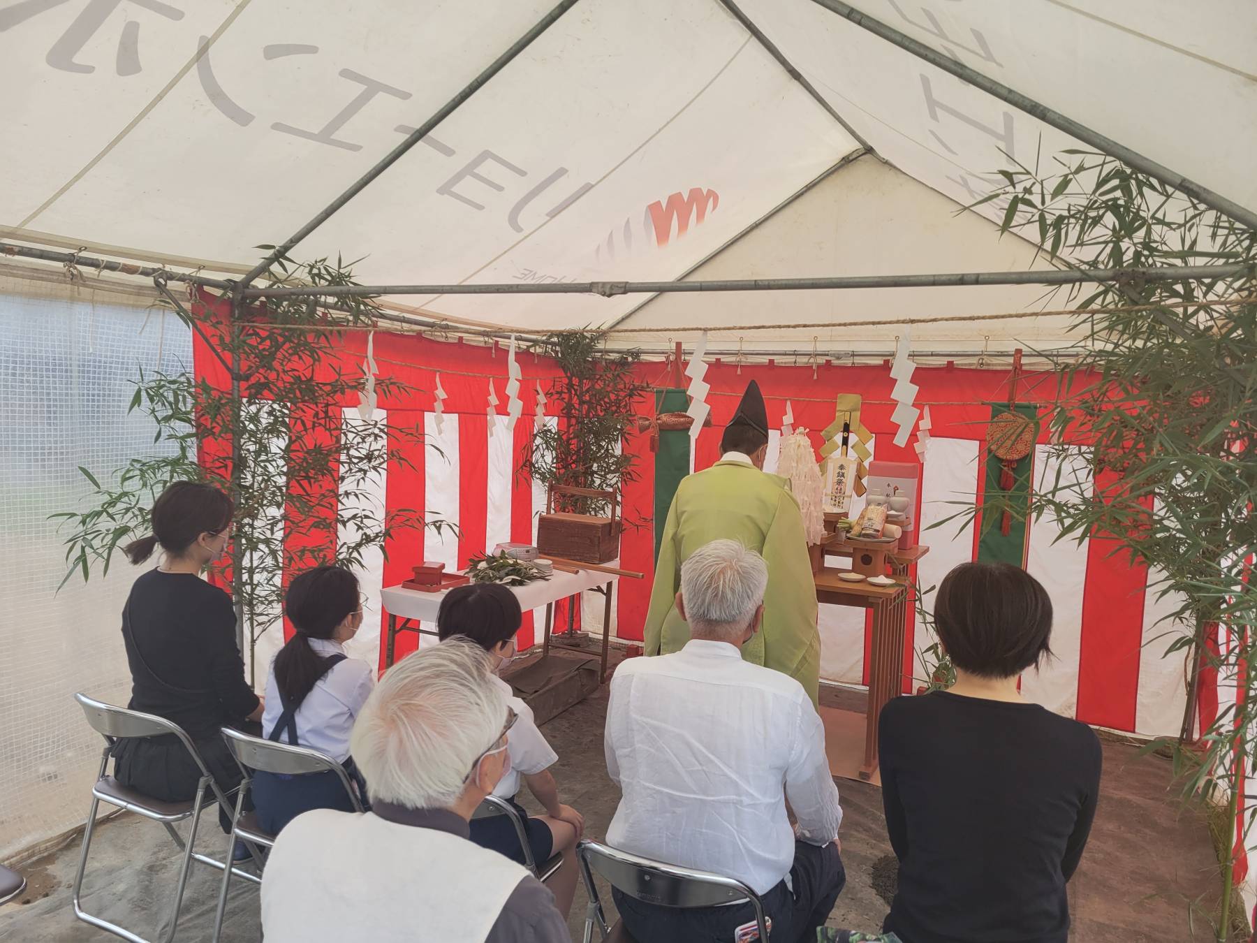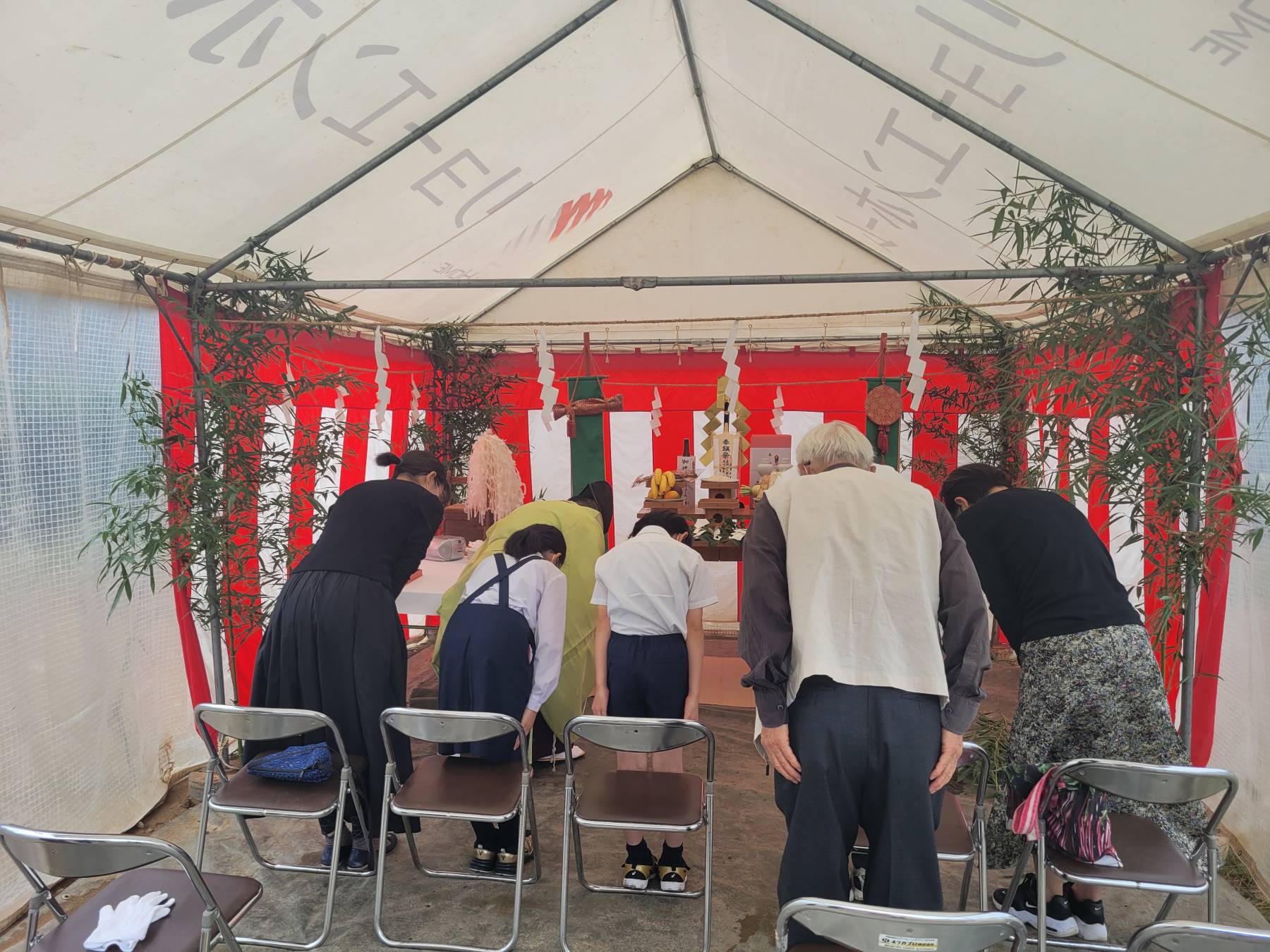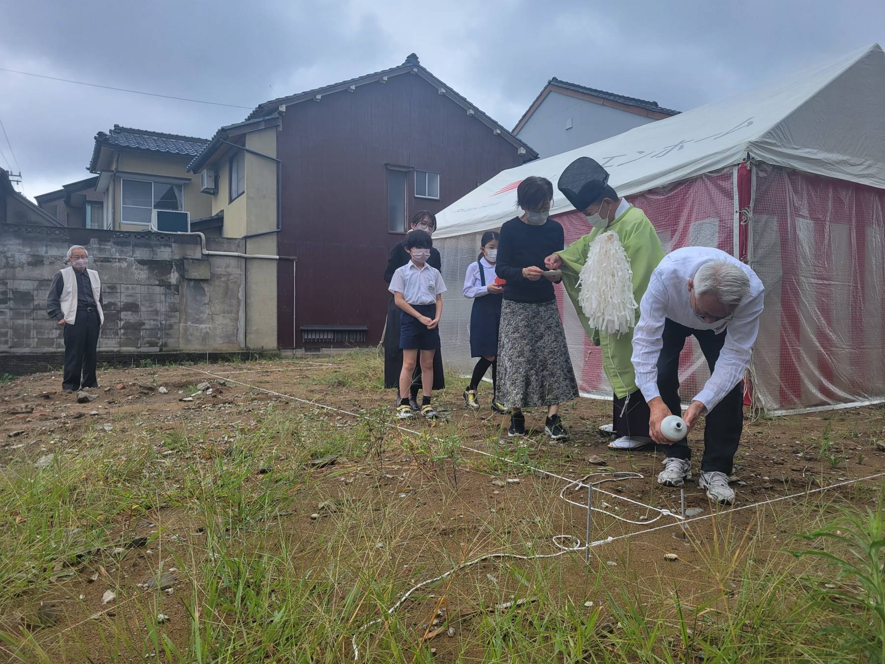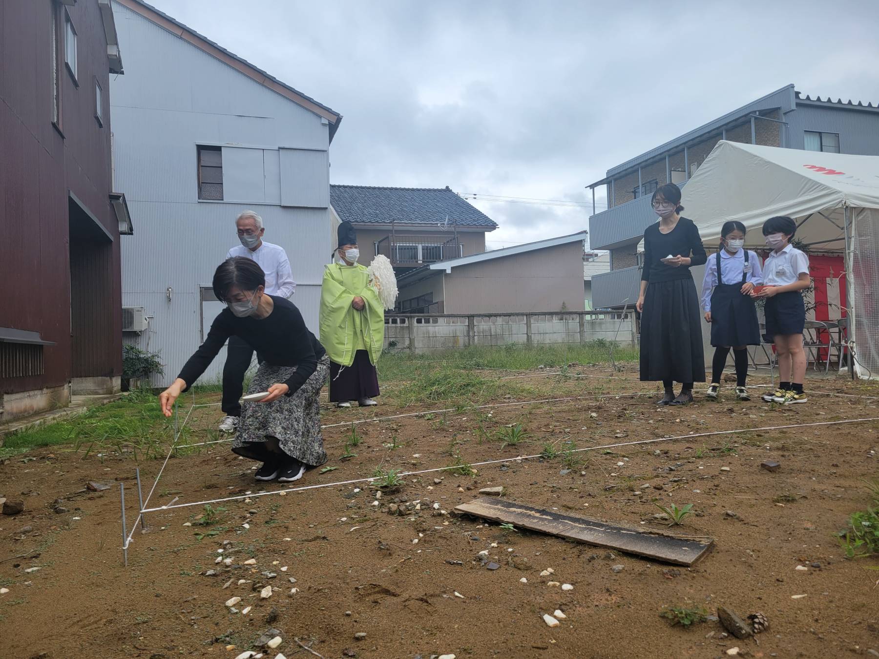 まずはこの土地の神様をお呼びする儀式を行い、建物の建つ四隅をお清めします。