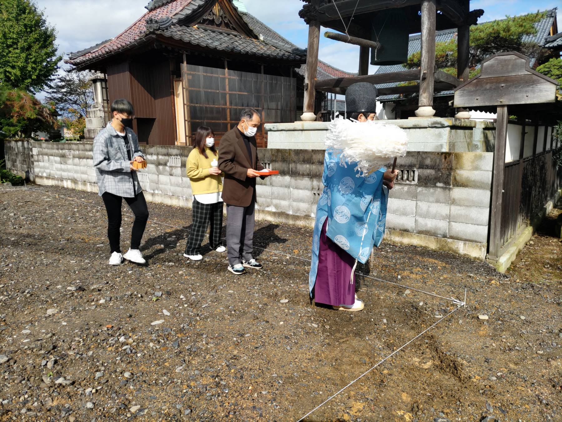 まずはこの土地の神様をお呼びする儀式を行い、建物の建つ四隅をお清めします。