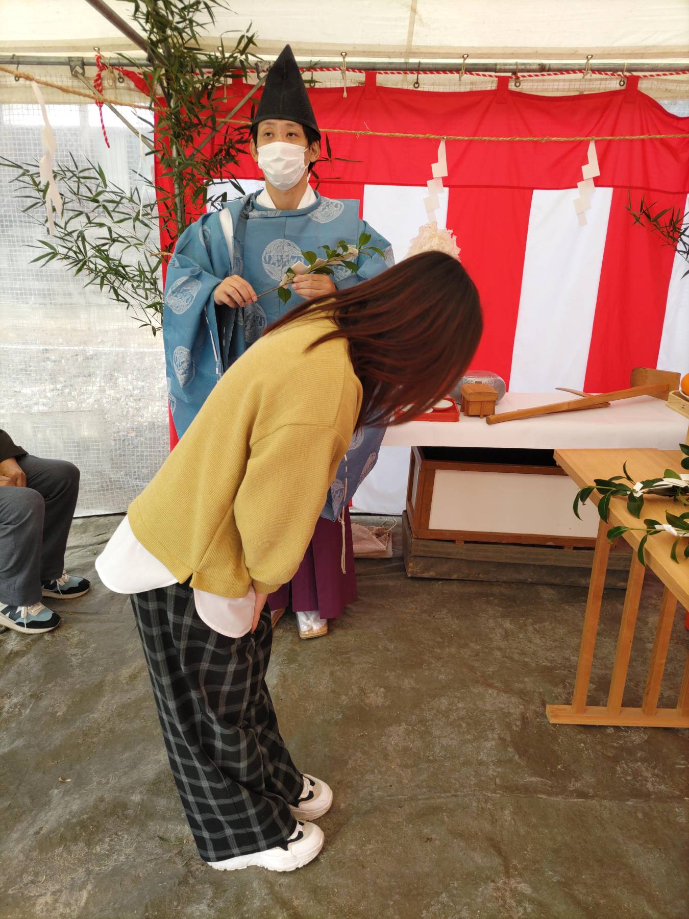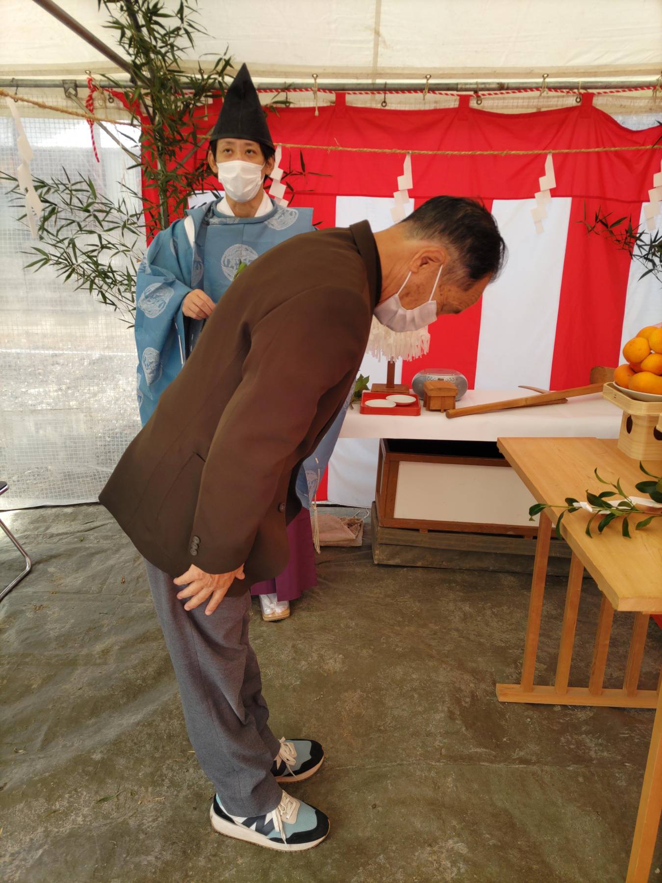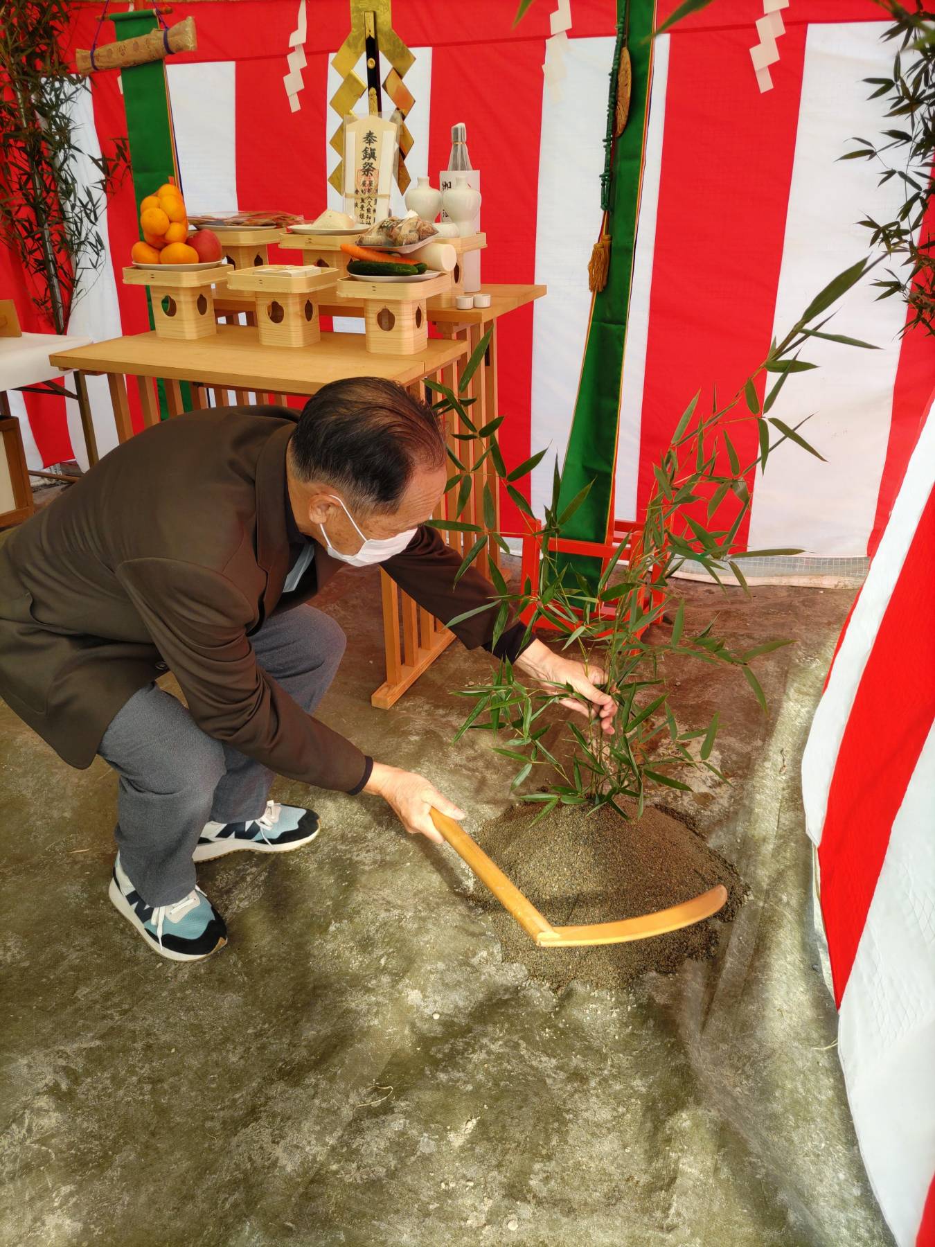 お清めが済むとテントに戻り、この土地に初めて手を入れる儀式をします。