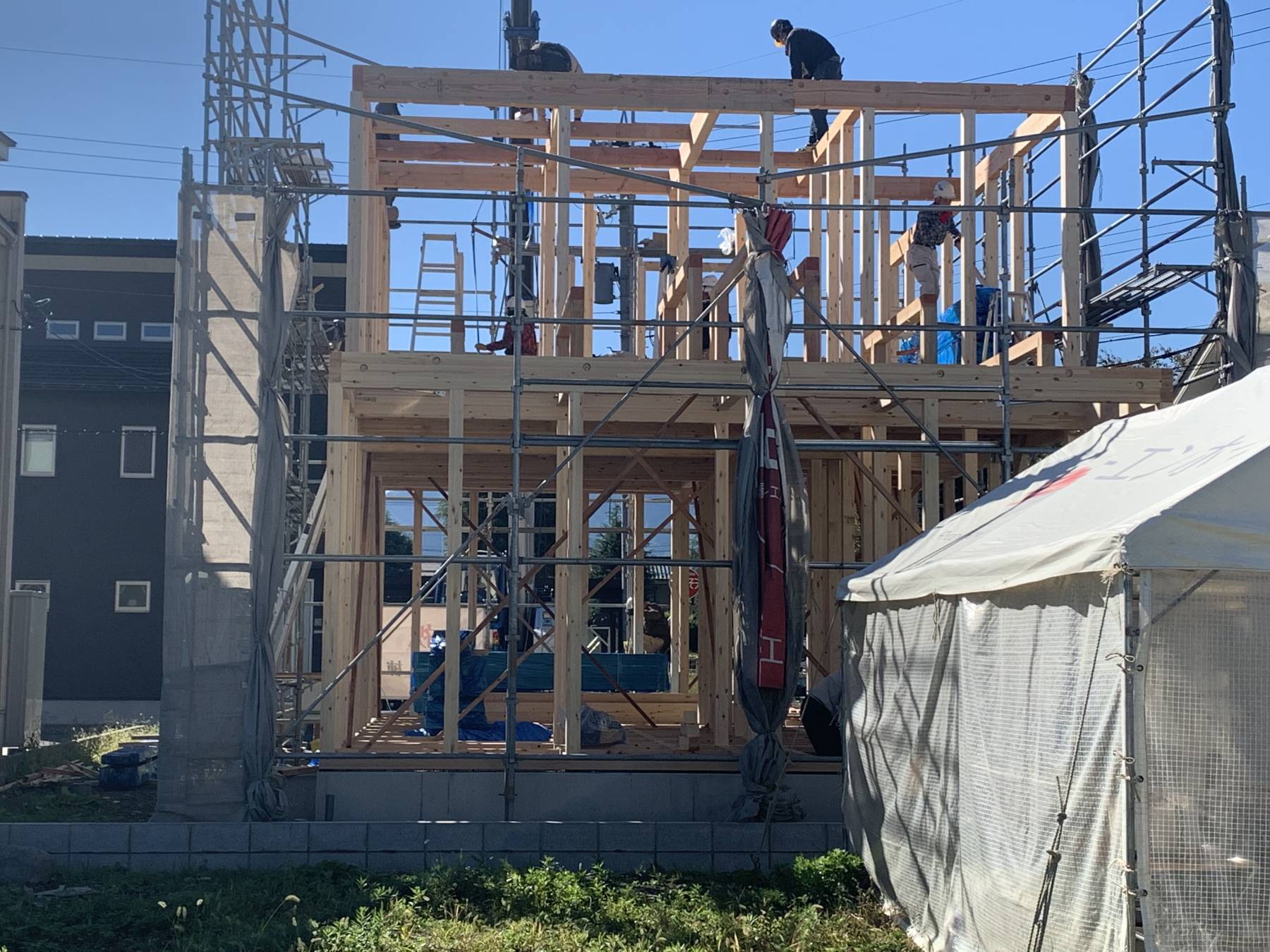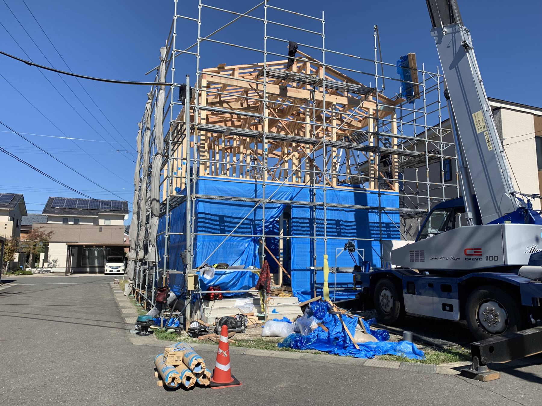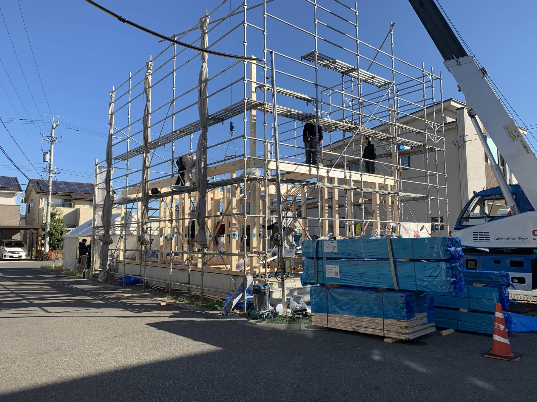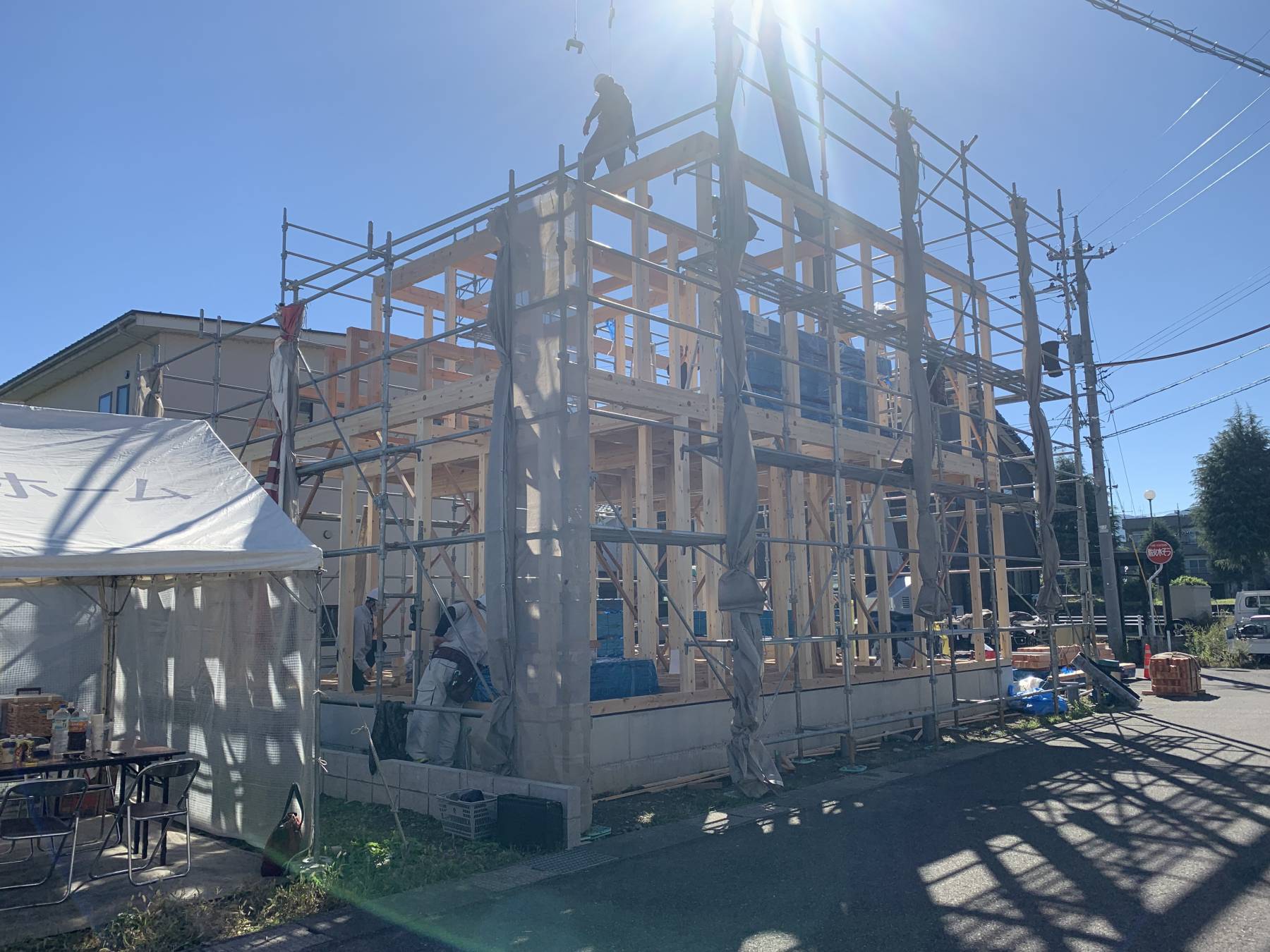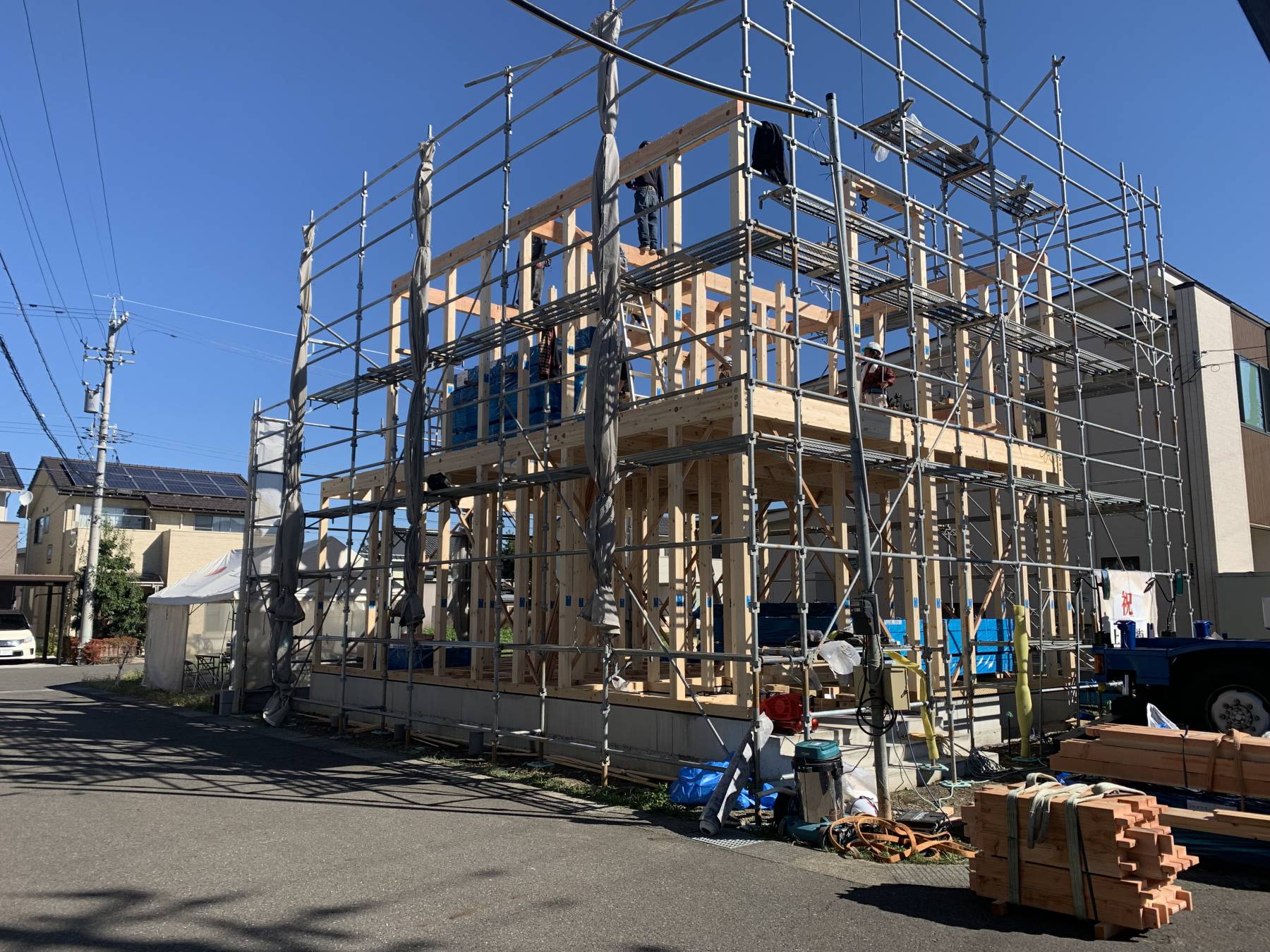 清々しい秋晴れのもと、作業もスムーズに進み、順調に建方が終了いたしました。