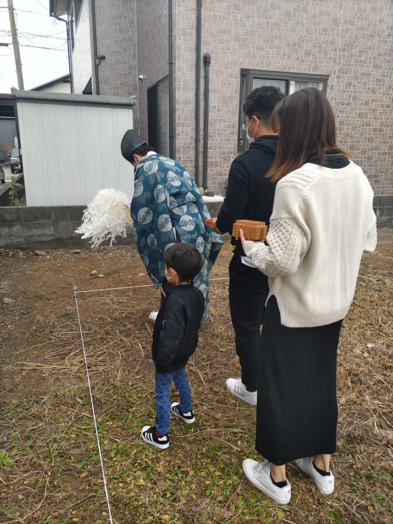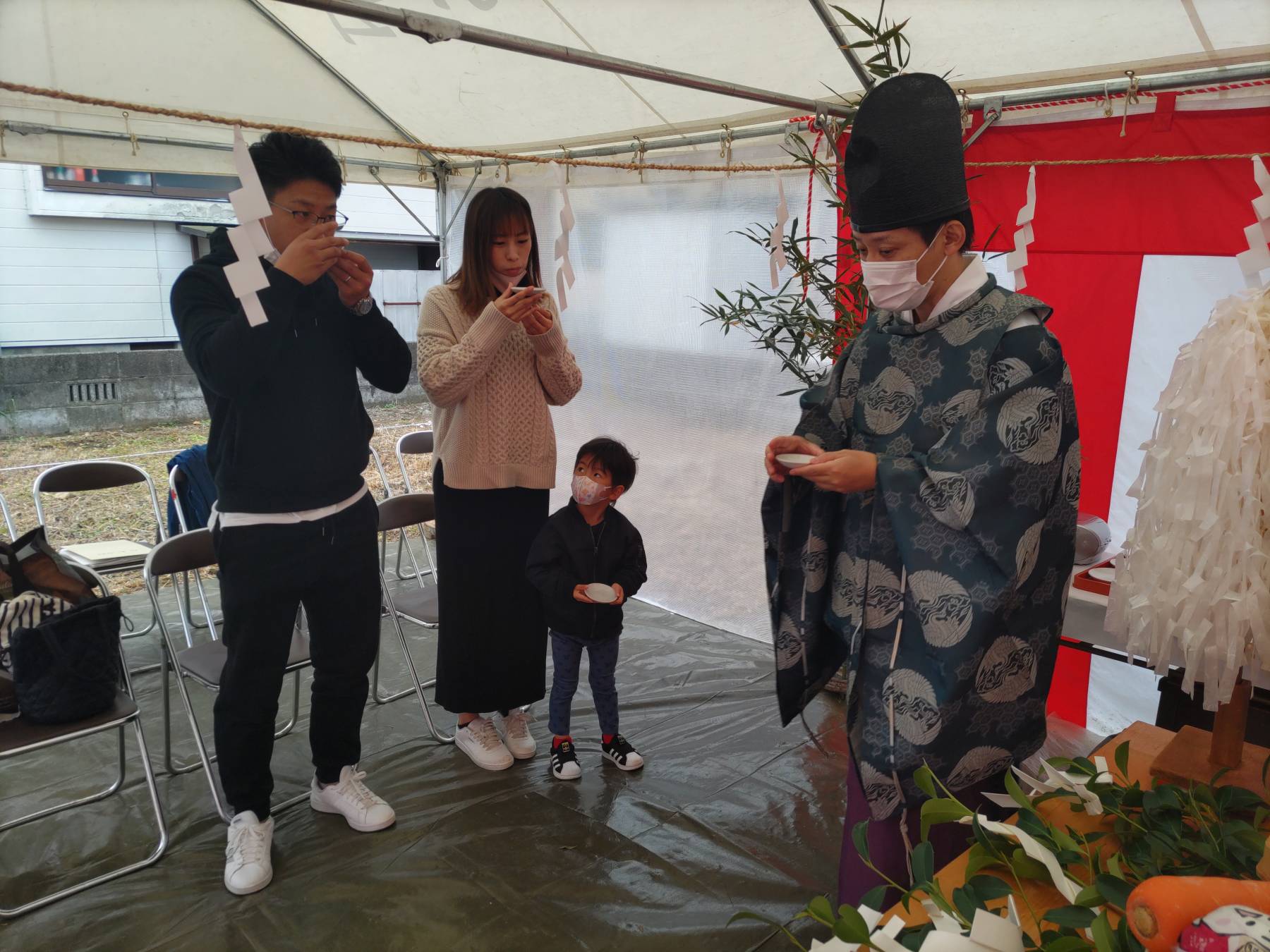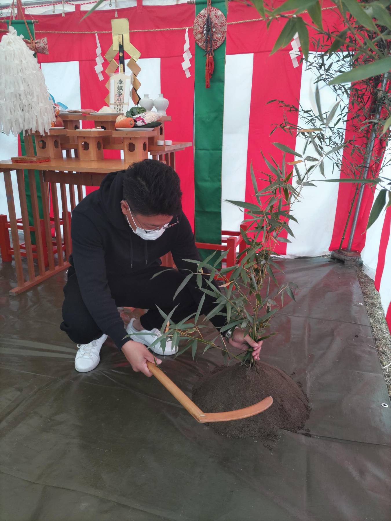 まずはこの土地の神様をお呼びする儀式を行い、建物の建つ四隅をお清めします。
