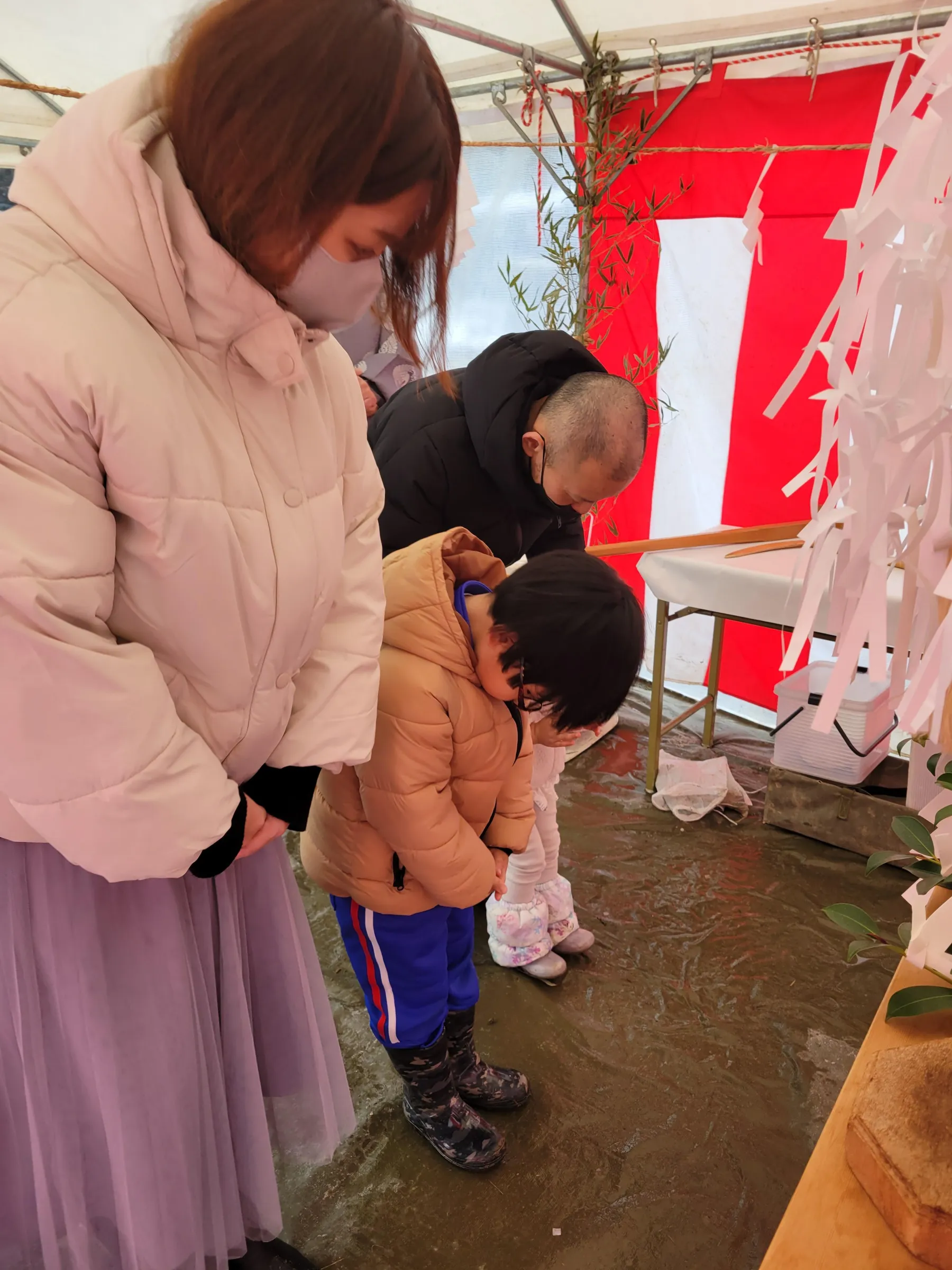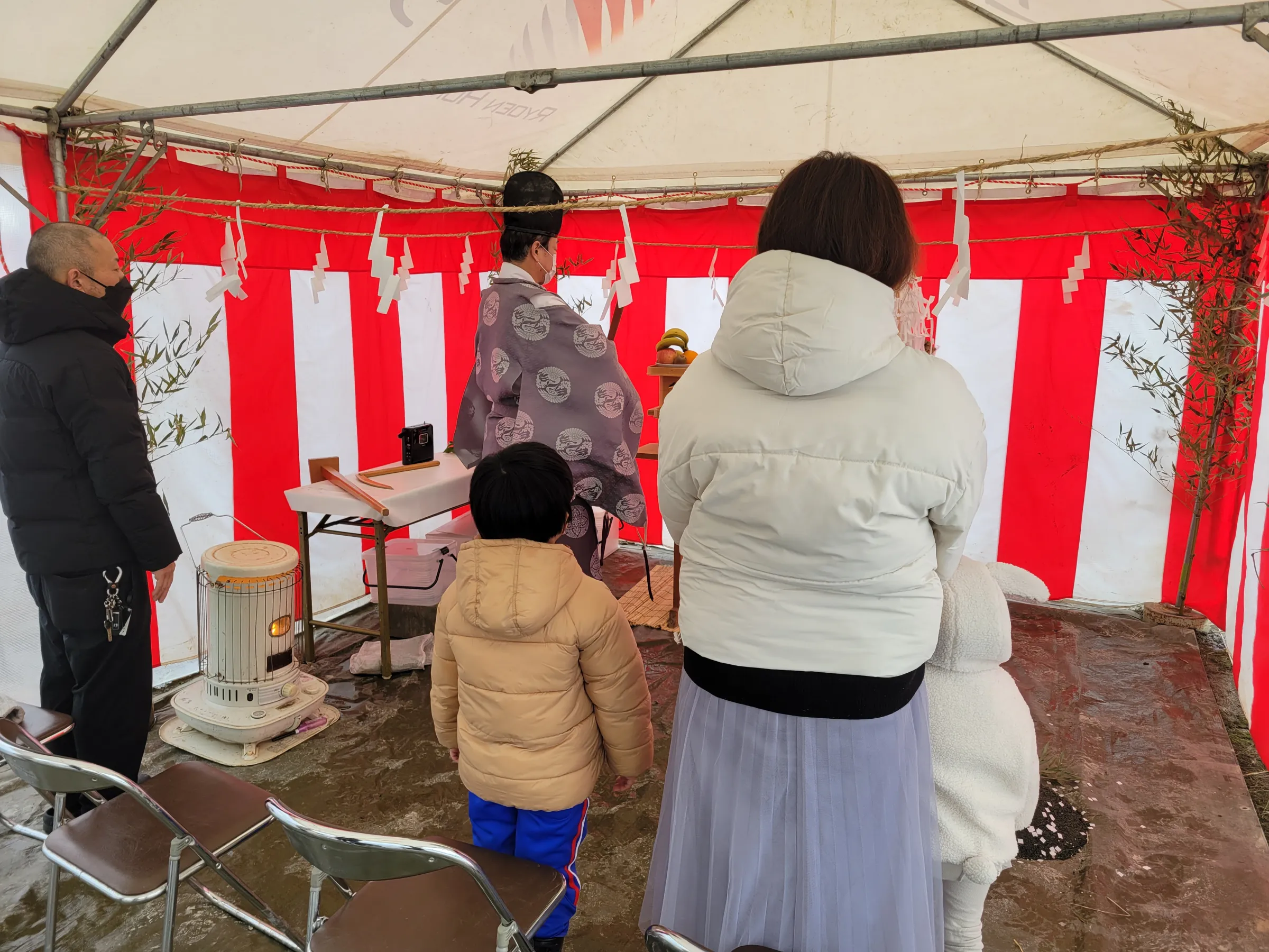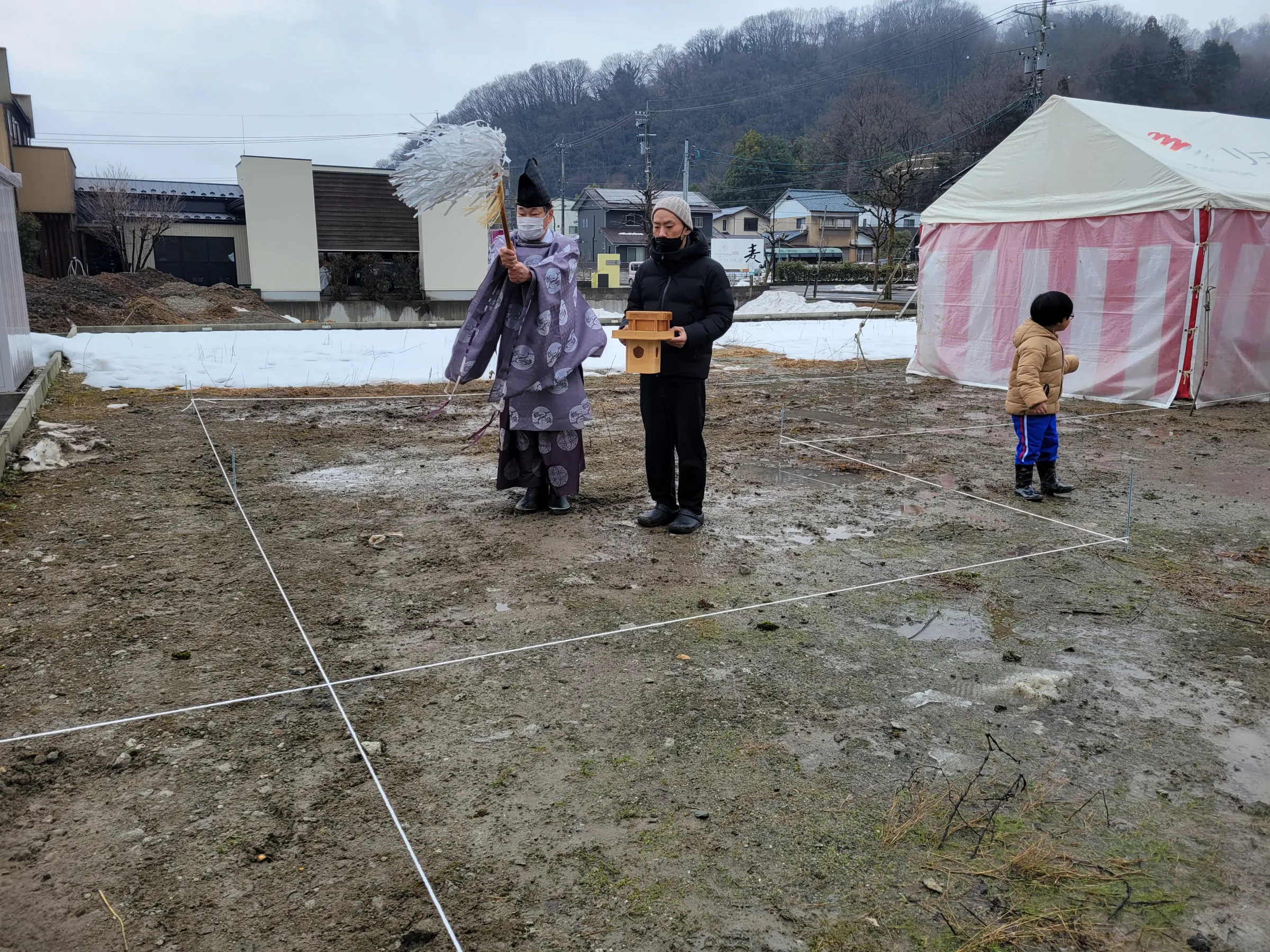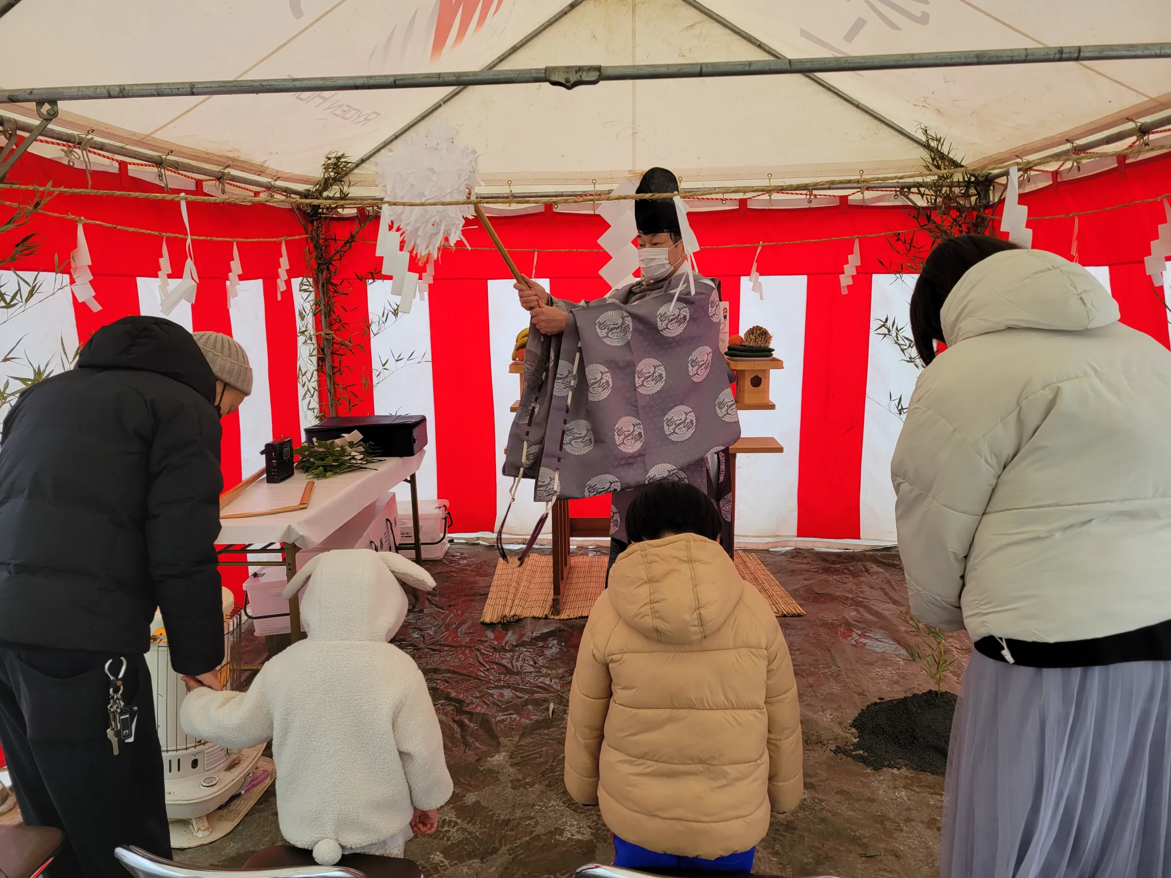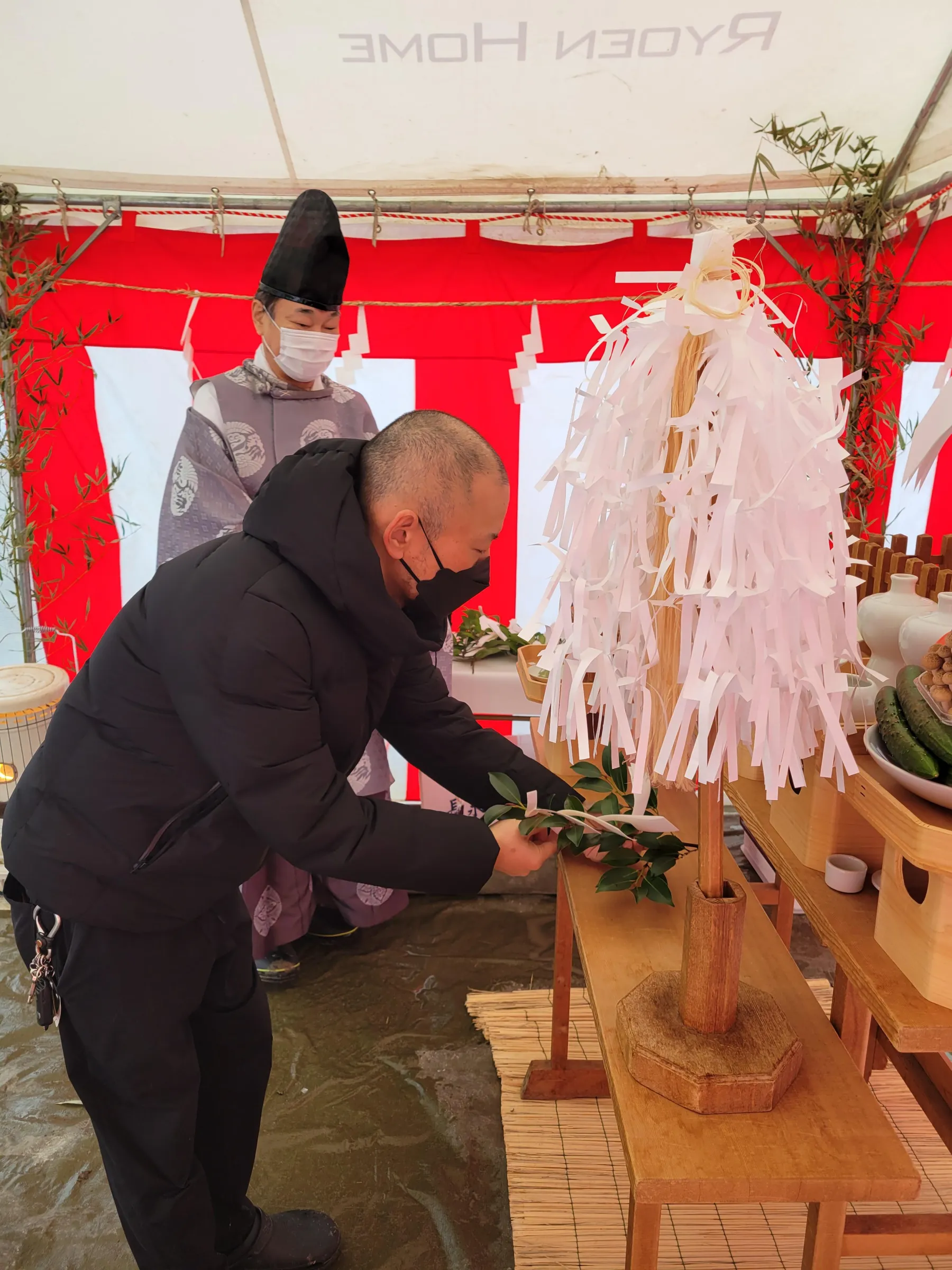 まずはこの土地の神様をお呼びする儀式を行い、建物の建つ四隅をお清めします。
