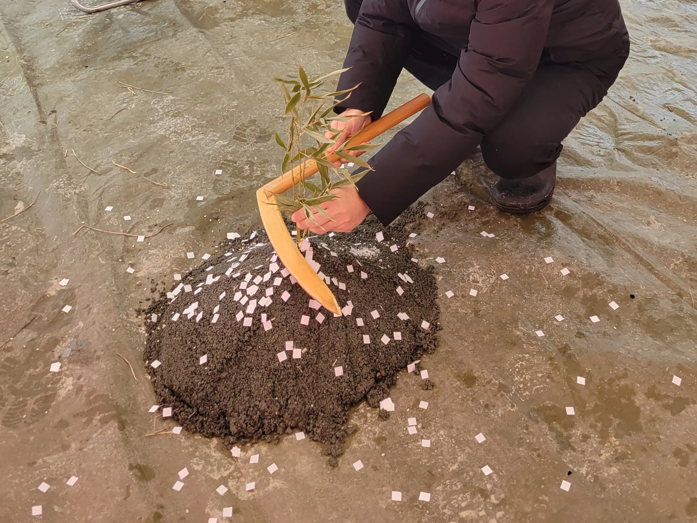 お清めが済むとテントに戻り、この土地に初めて手を入れる儀式をします。