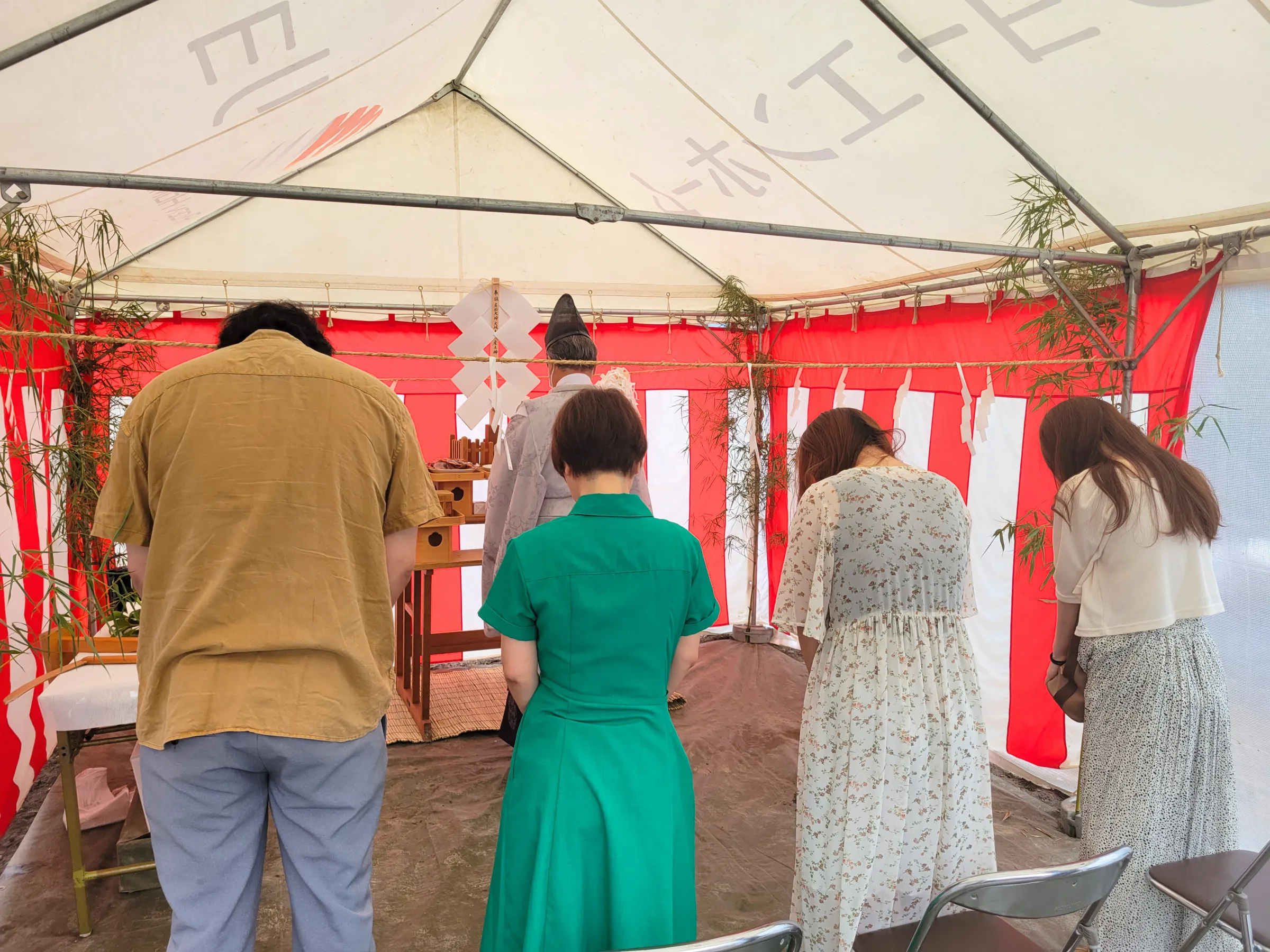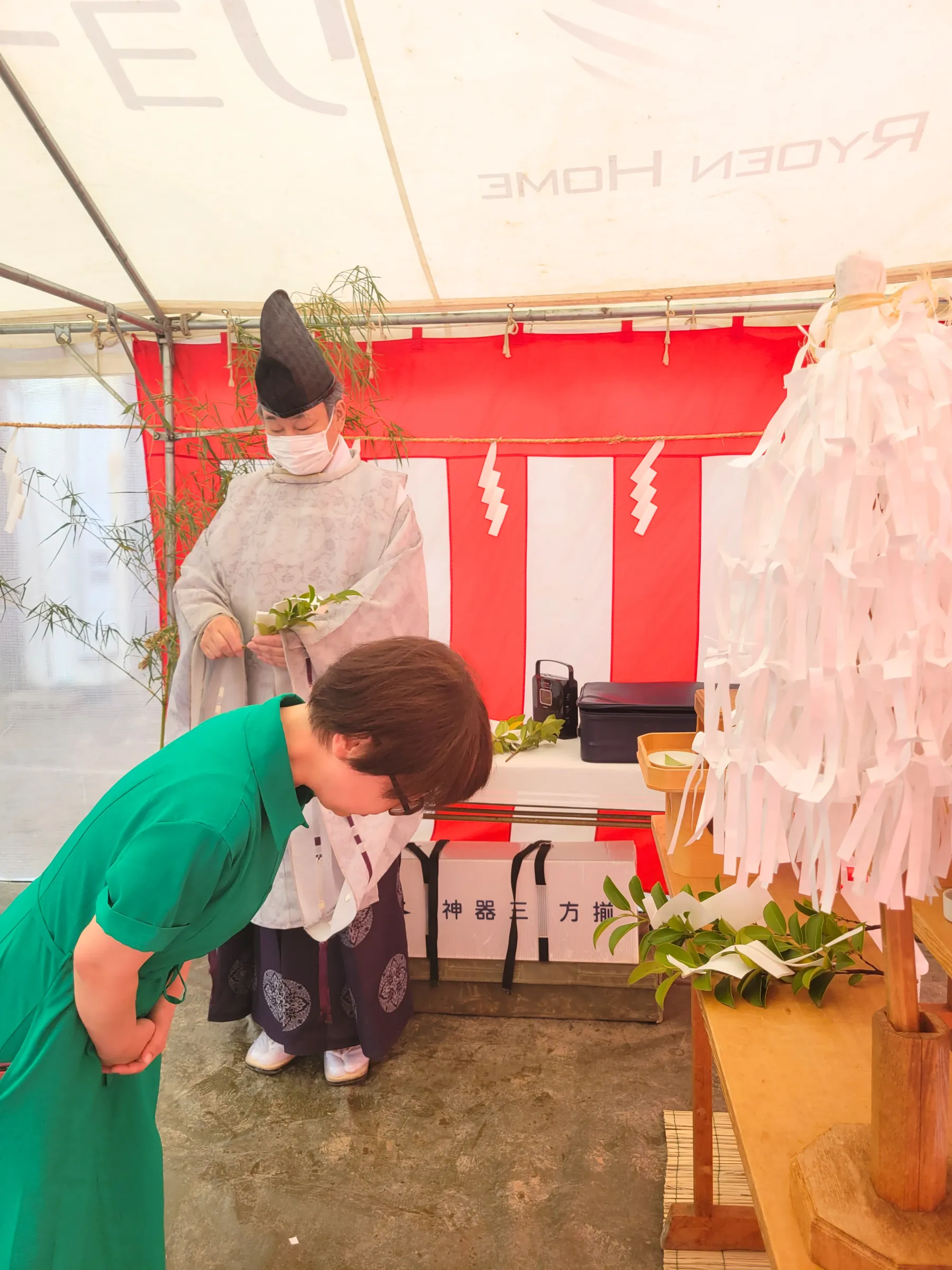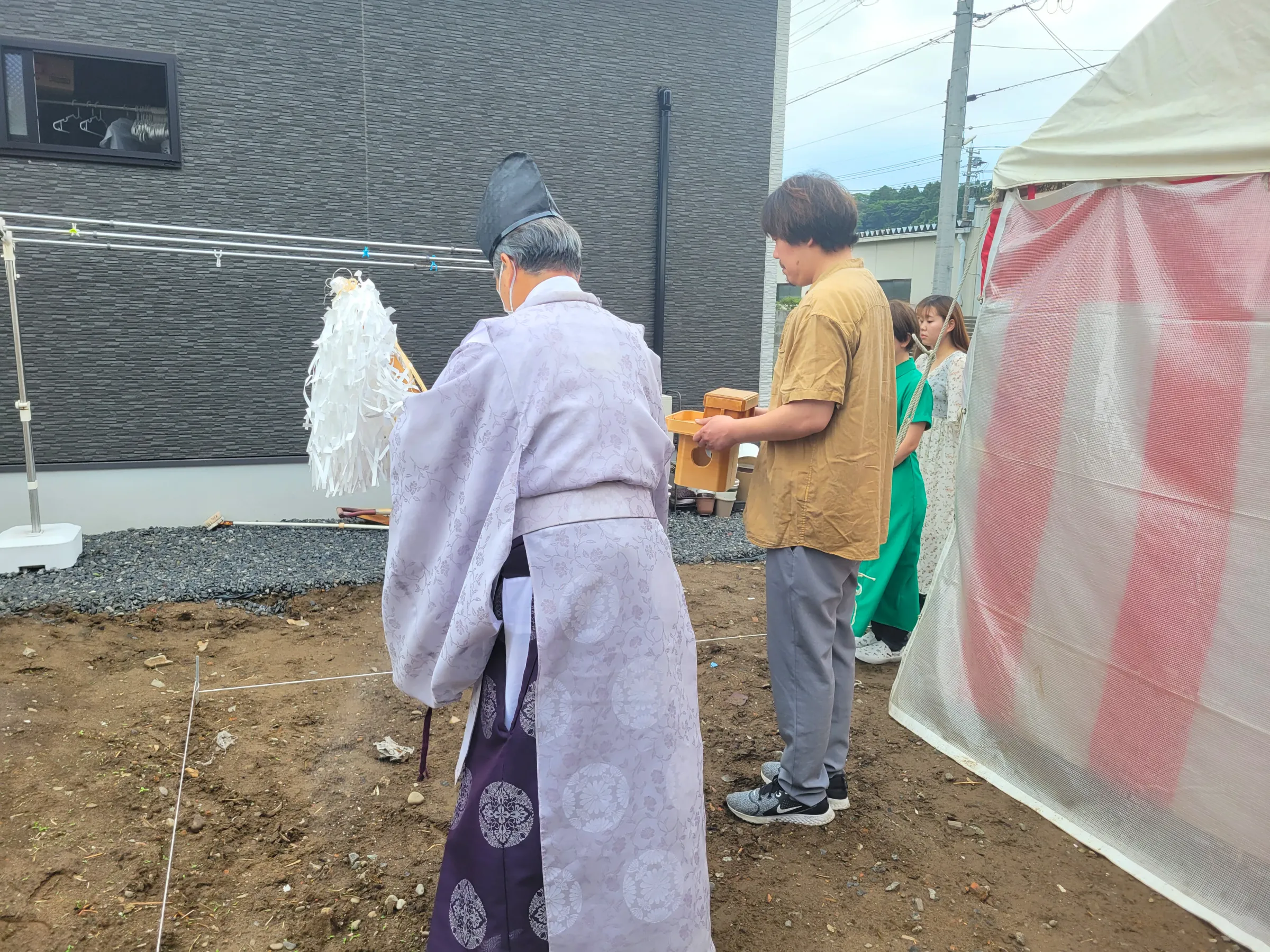 まずはこの土地の神様をお呼びする儀式を行い、建物の建つ四隅をお清めします。