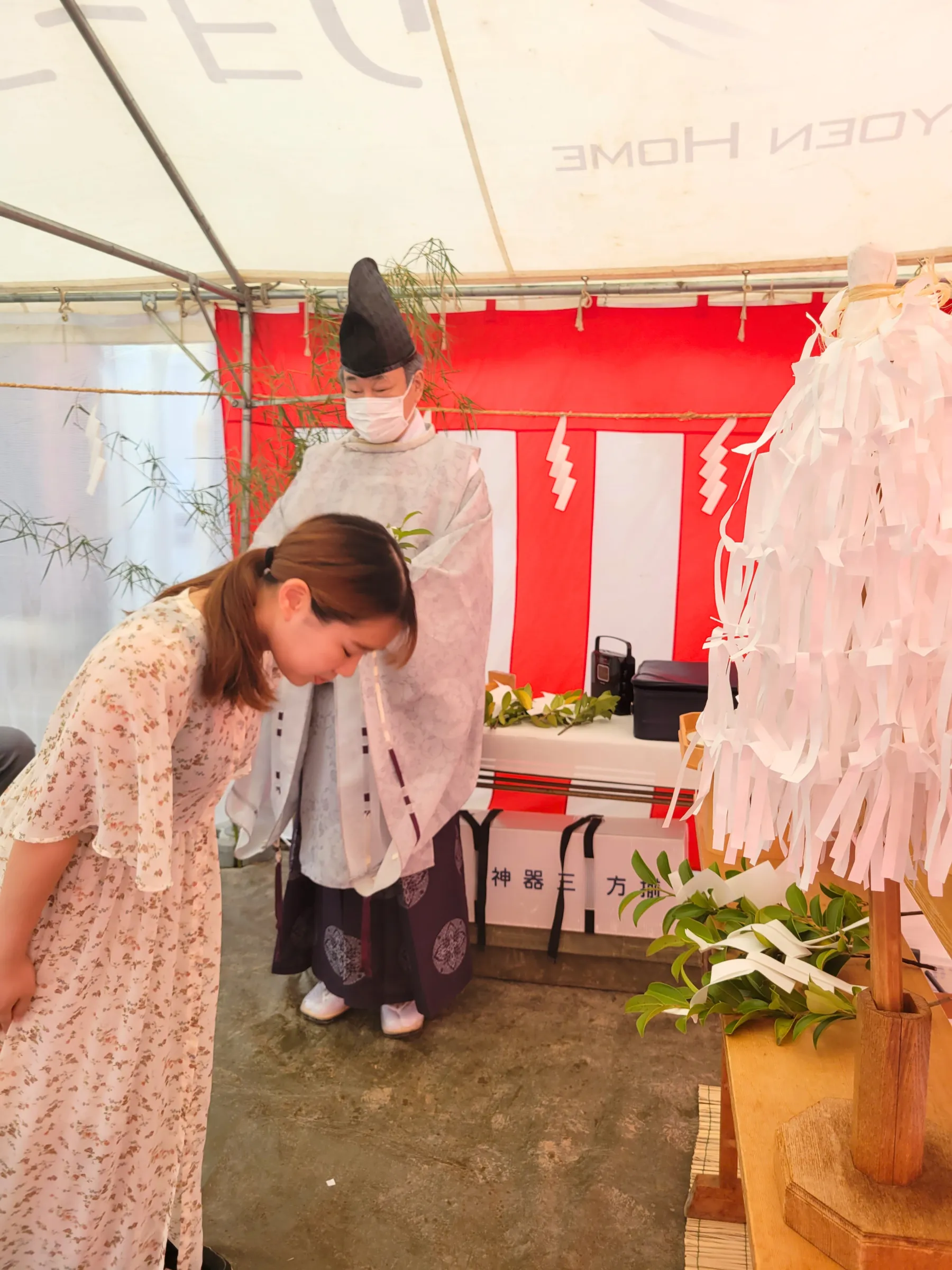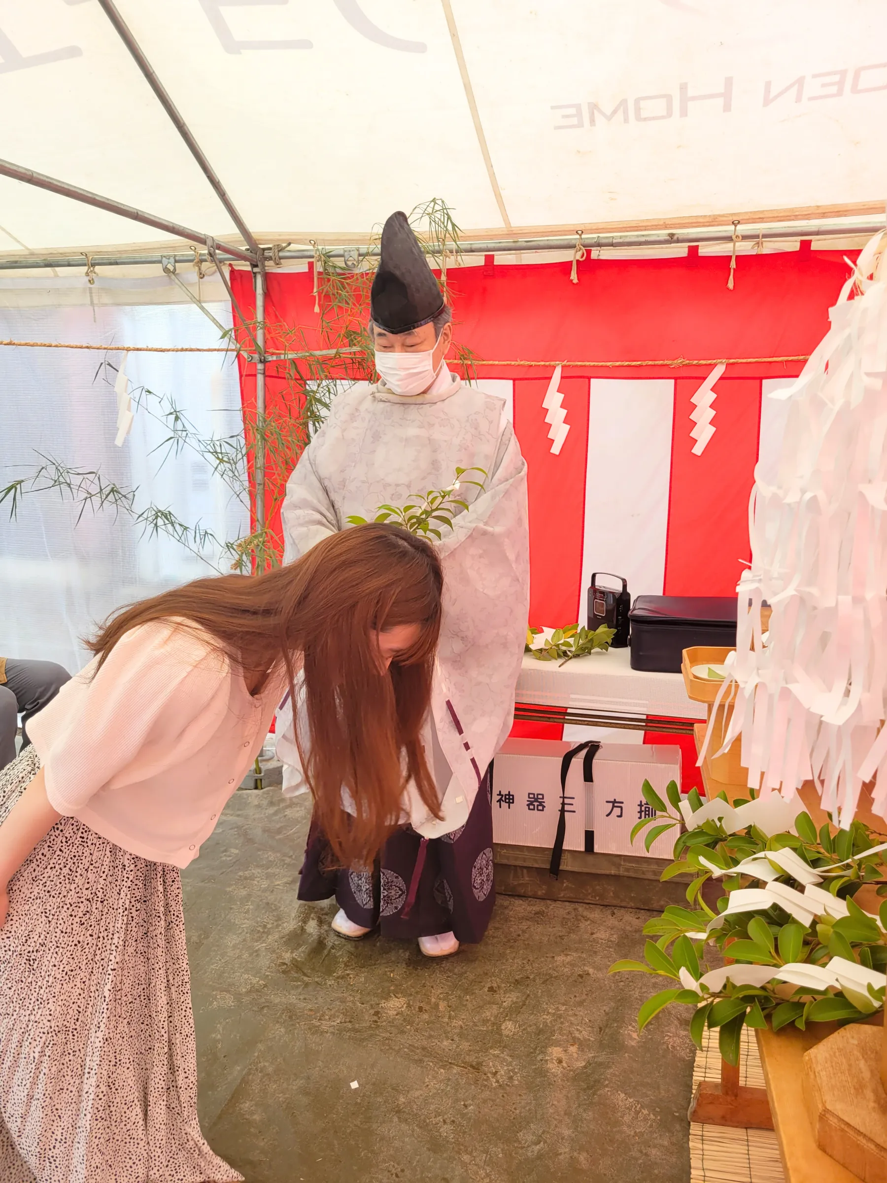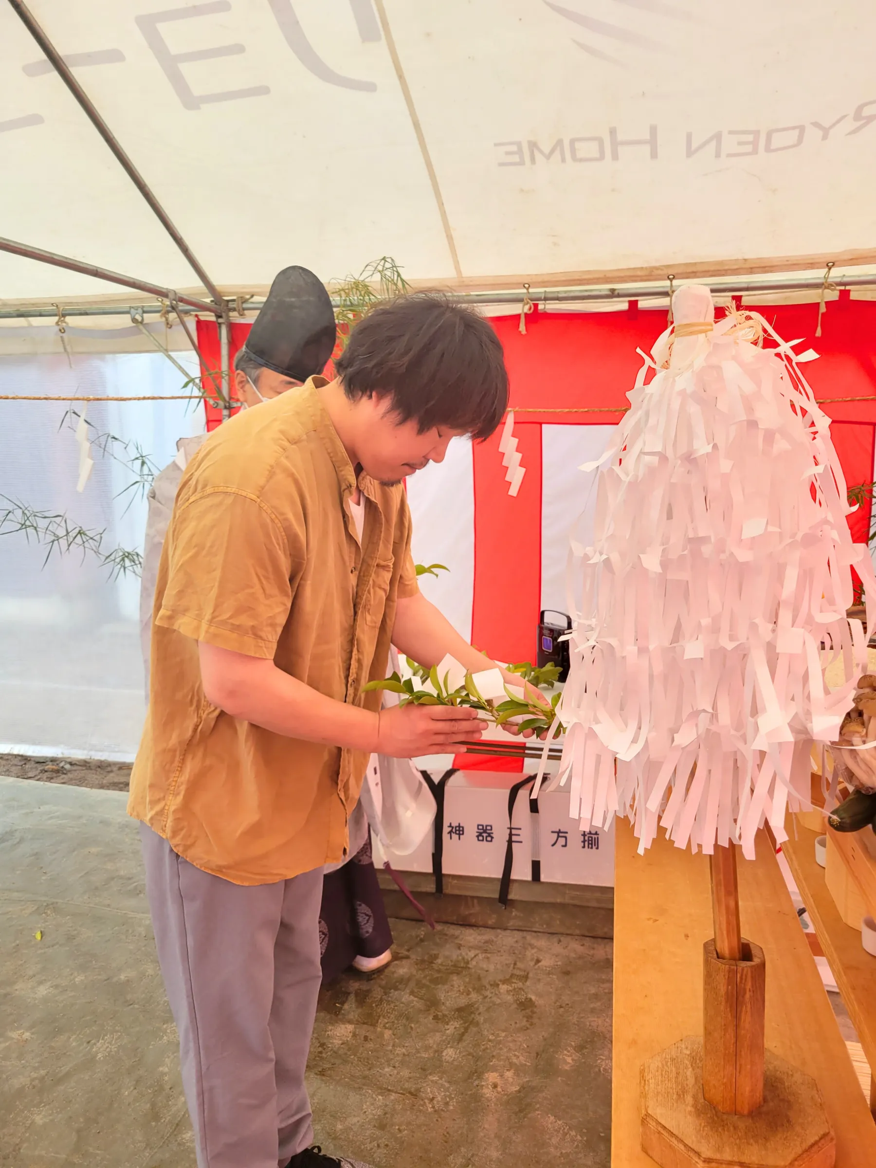 まずはこの土地の神様をお呼びする儀式を行い、建物の建つ四隅をお清めします。