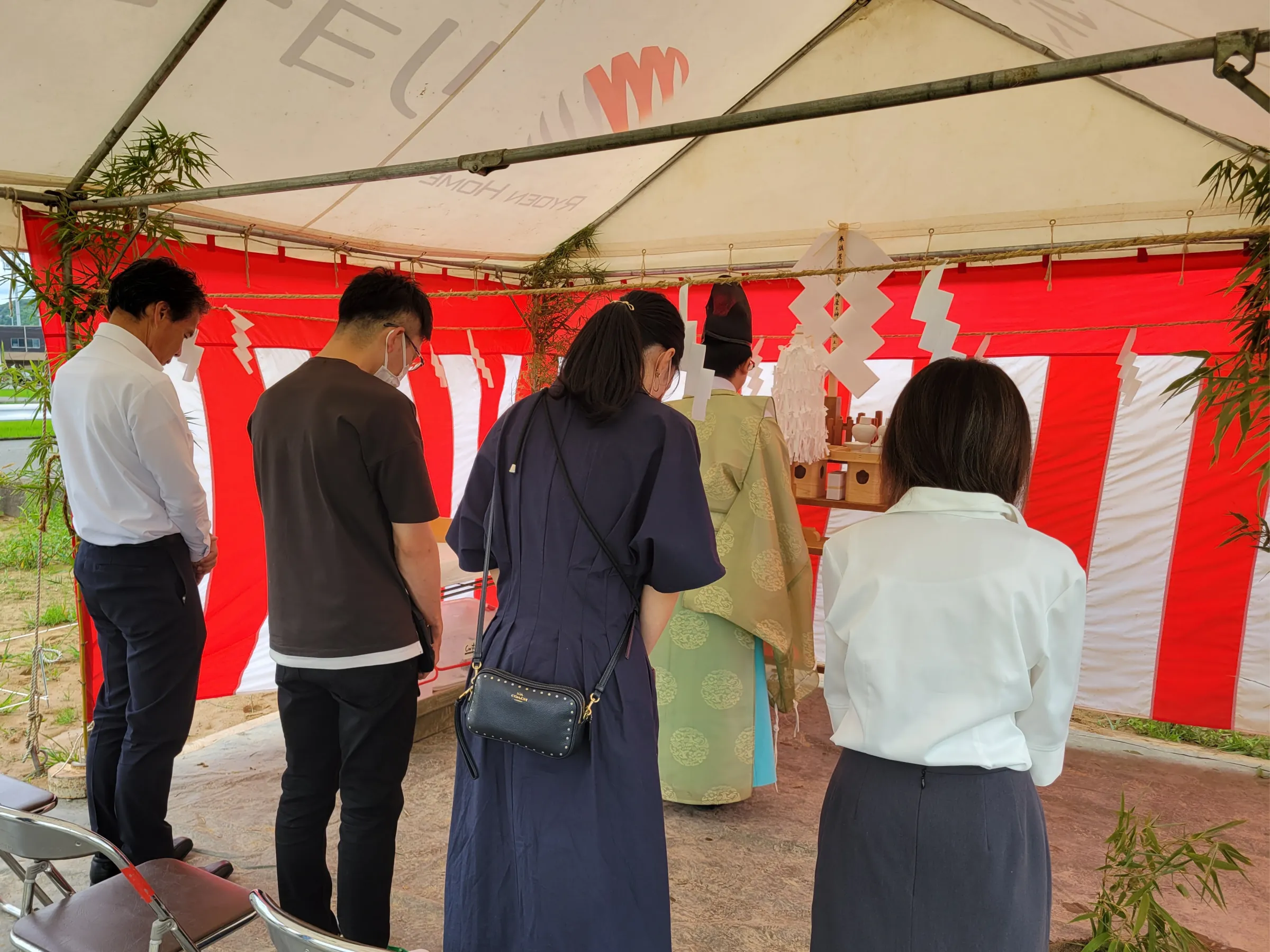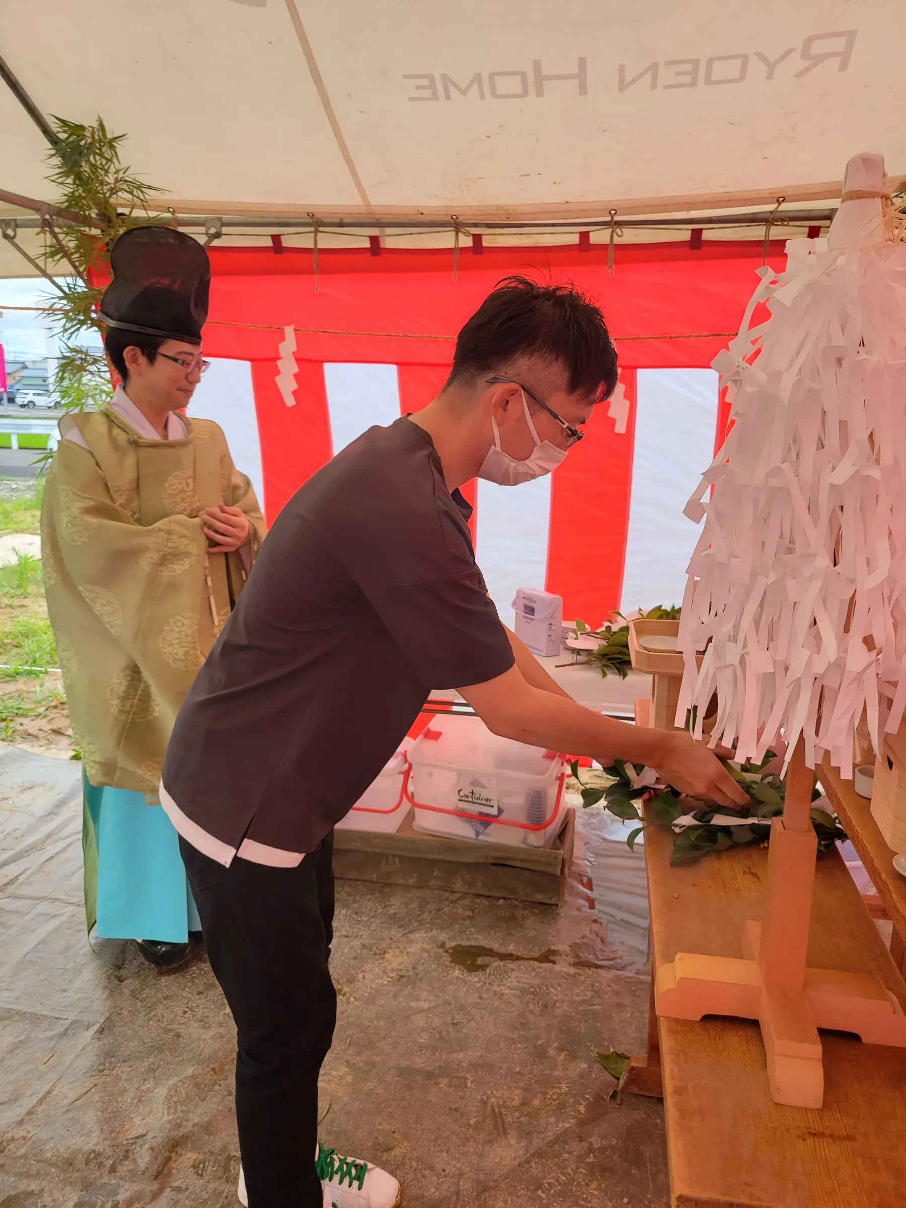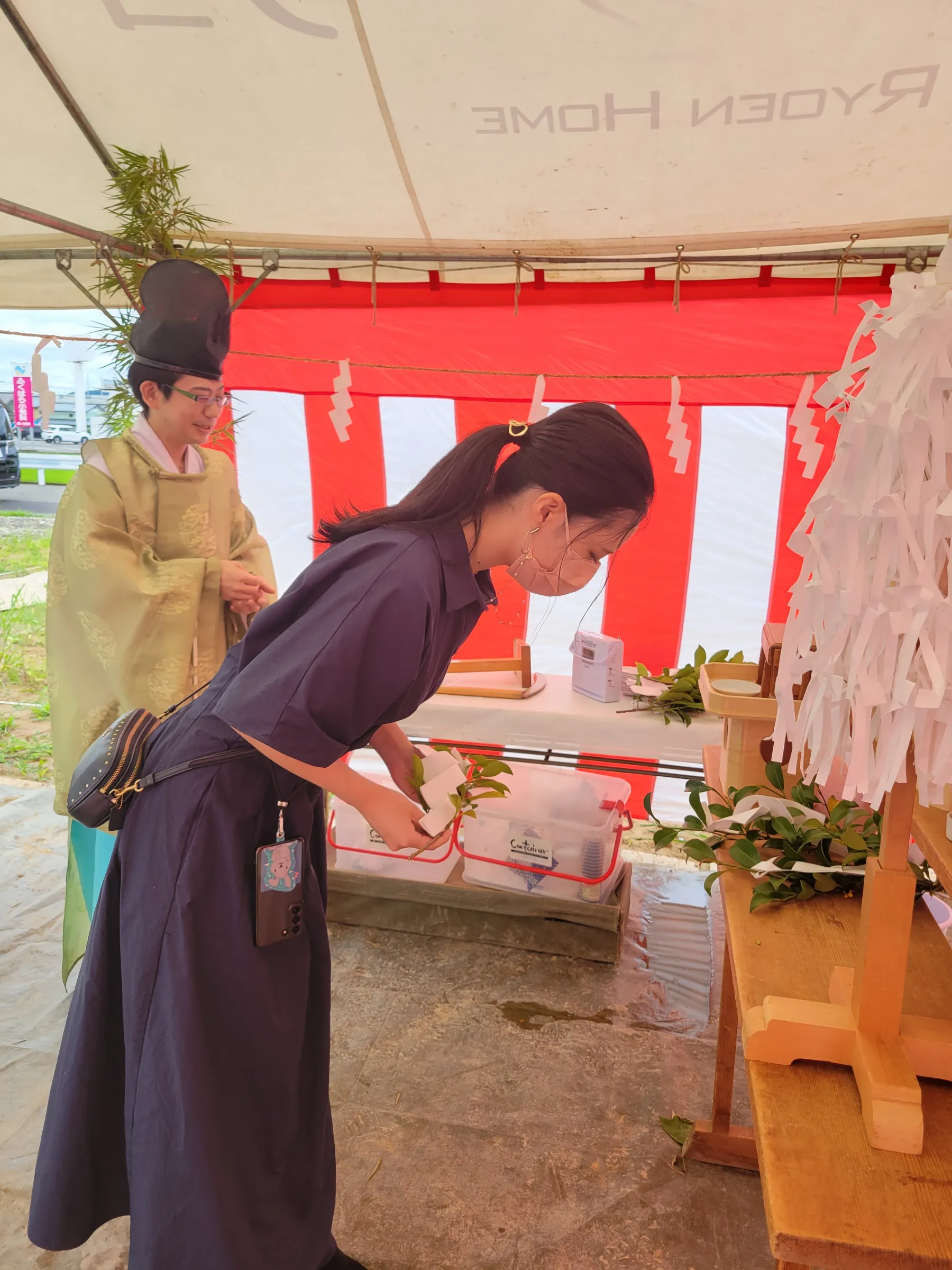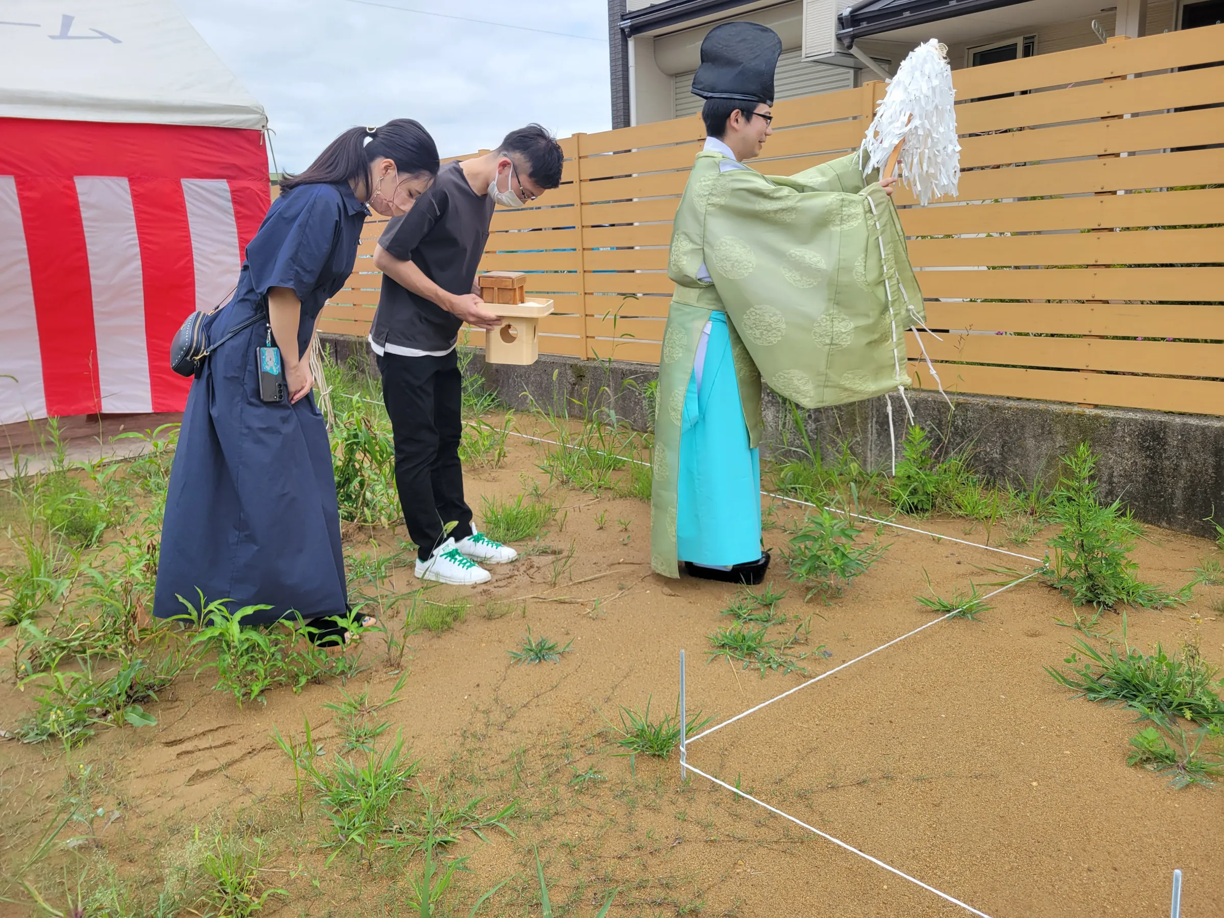 まずはこの土地の神様をお呼びする儀式を行い、建物の建つ四隅をお清めします。