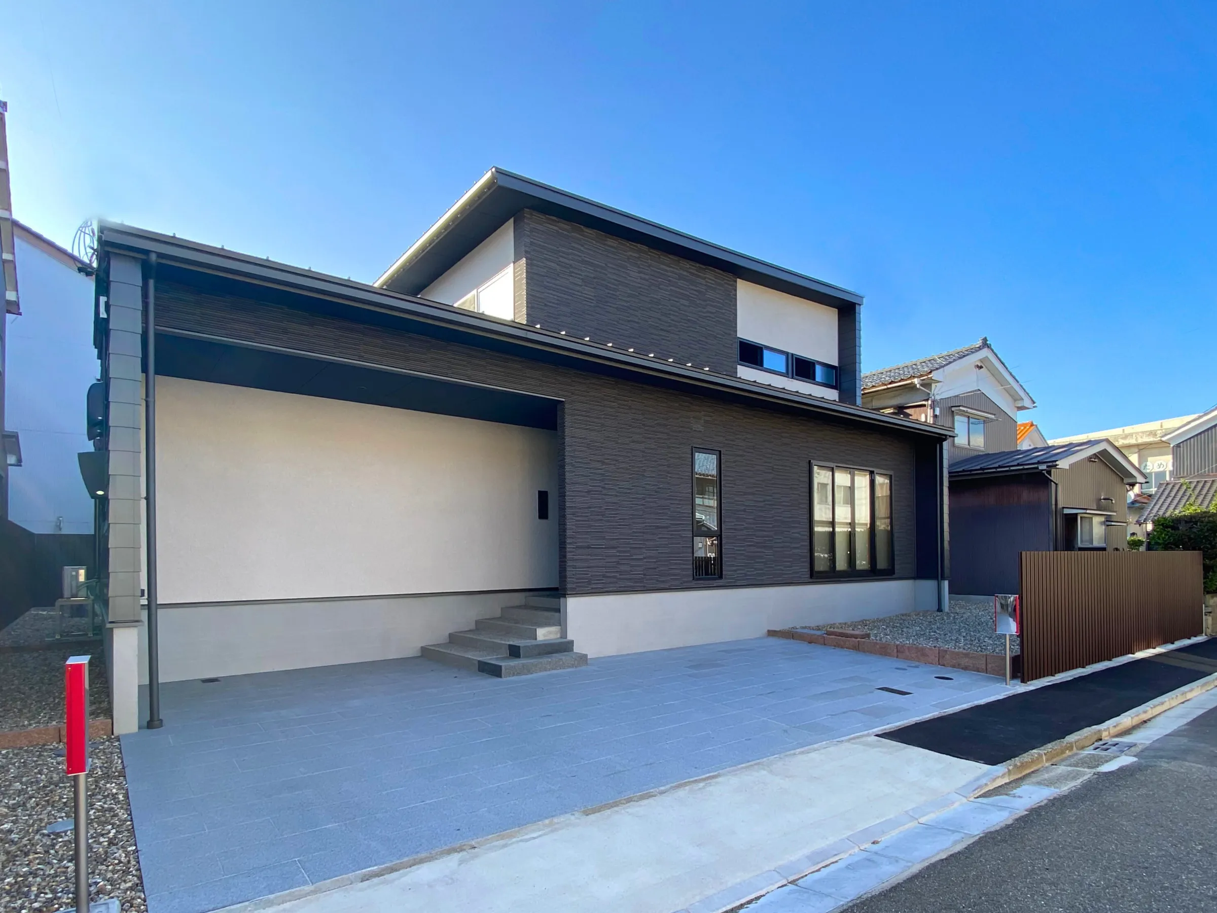 白とグレーのコントラストが美しい外観。