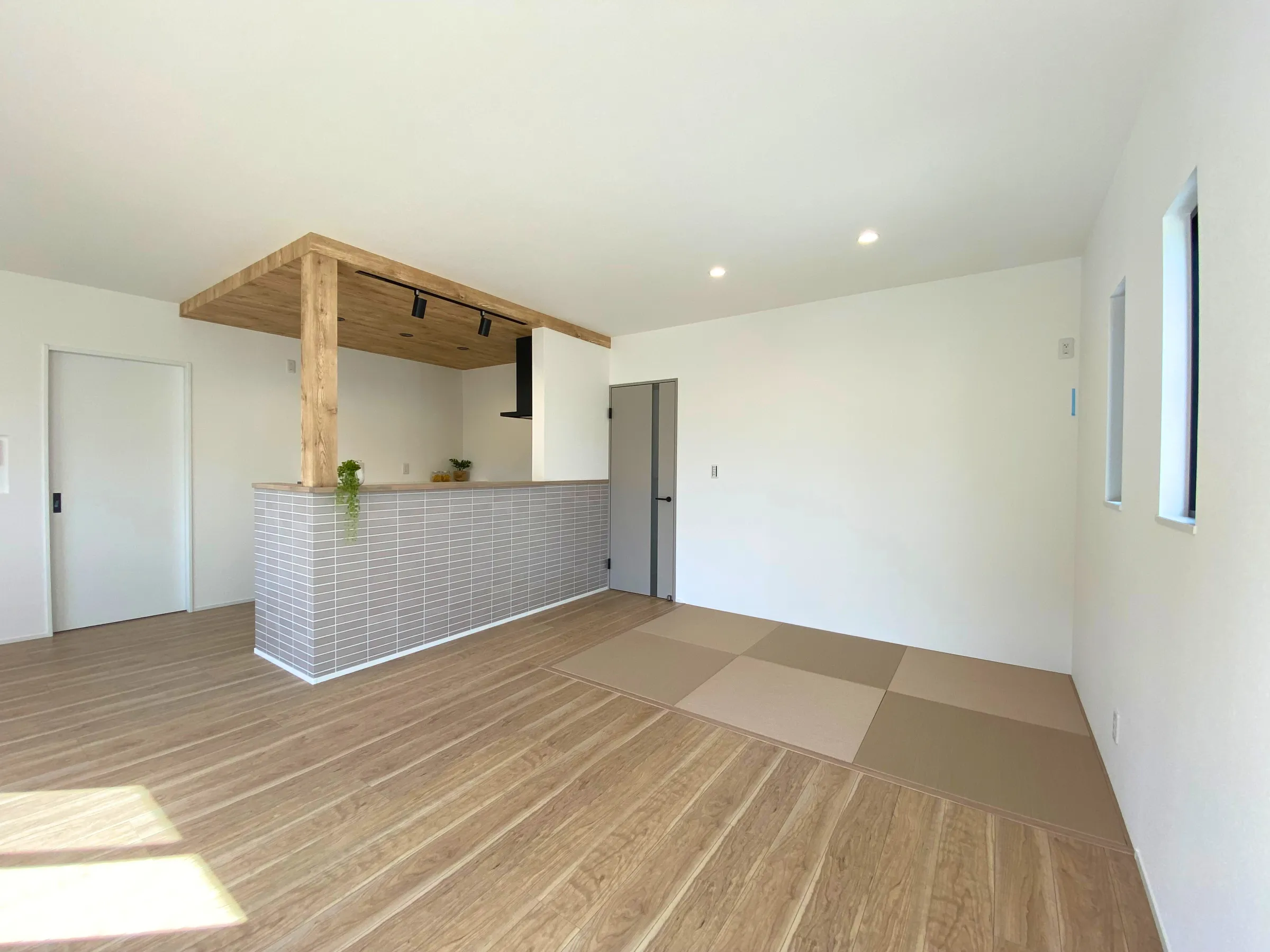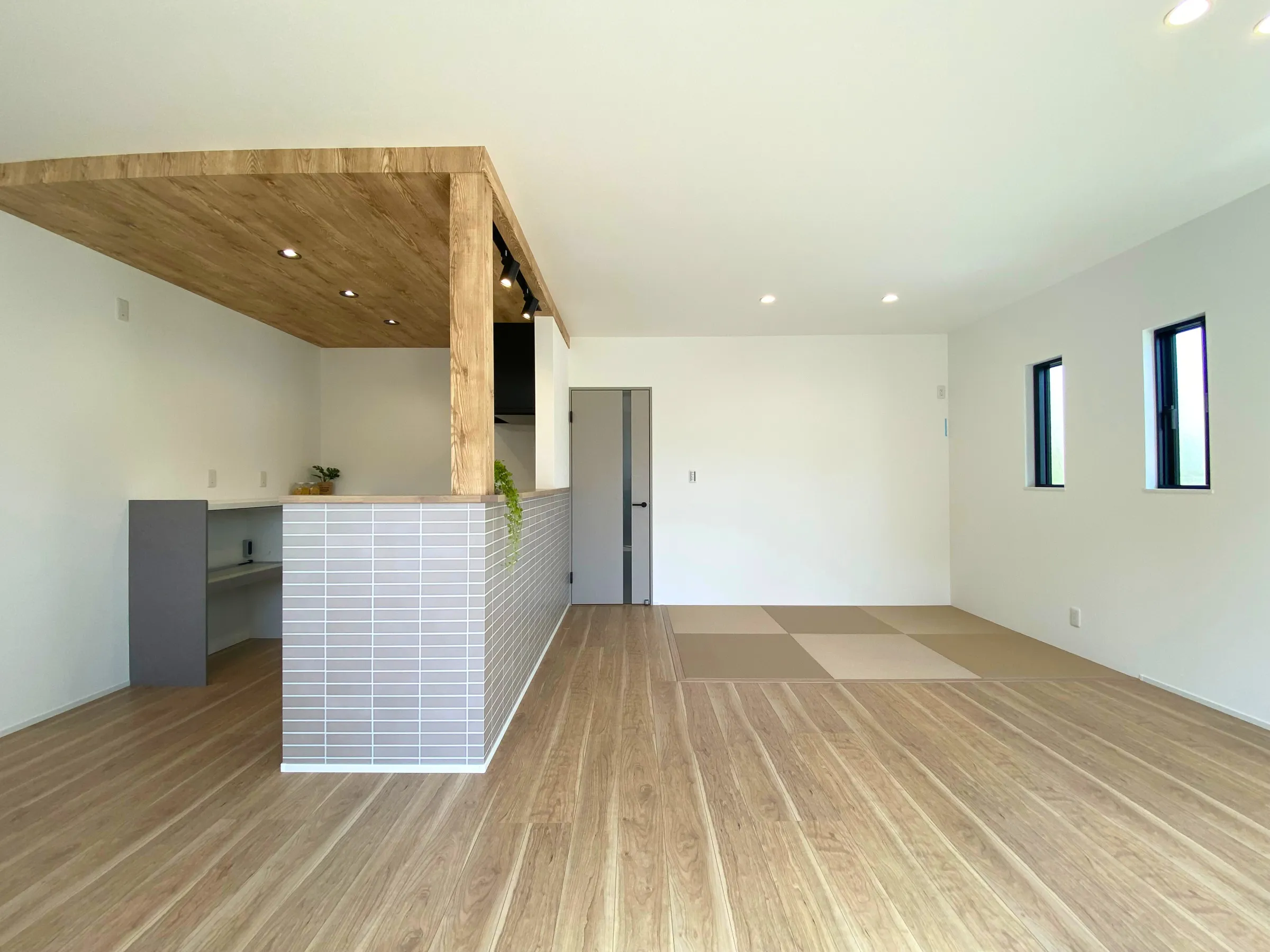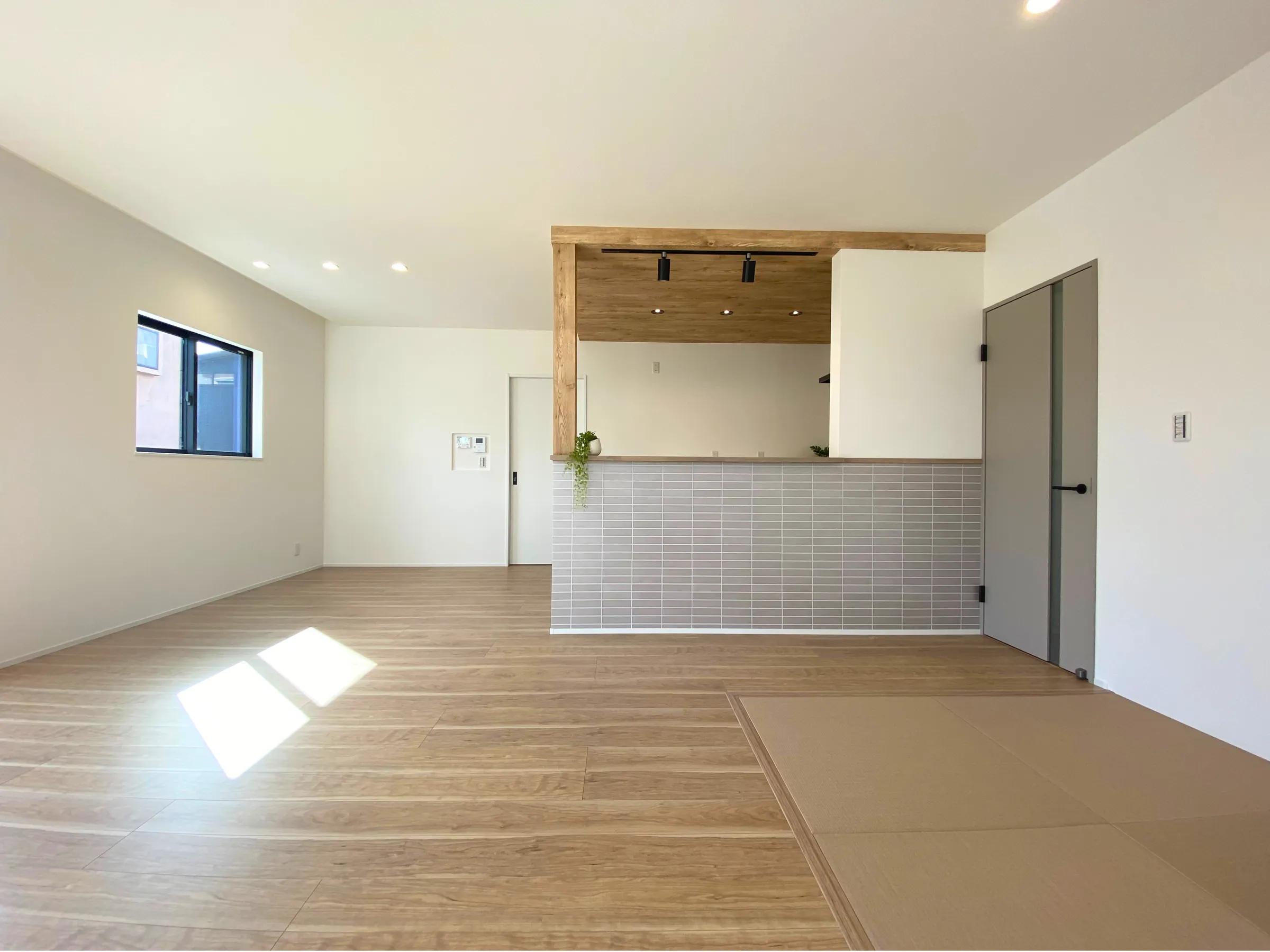約17帖のLDKは、キッチンからの目線の先に3帖の畳スペースがあり、お子様も過ごしやすい空間になっています。