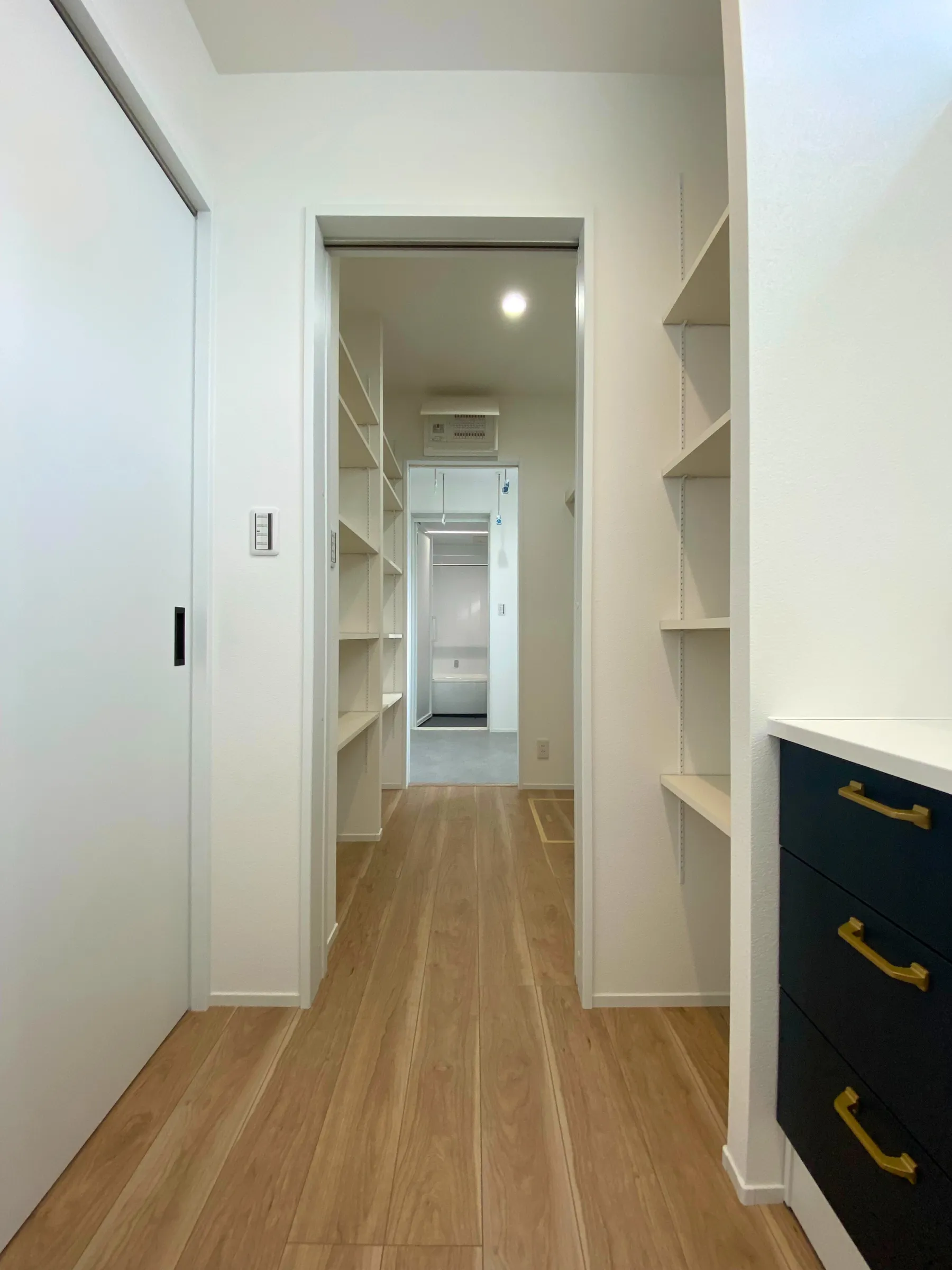 キッチン裏には、バス・脱衣室兼ランドリールーム・ファミリークローク・洗面室が一直線に配置され、「洗う/干す/片付ける」の一連の作業をまとめて行うことができ