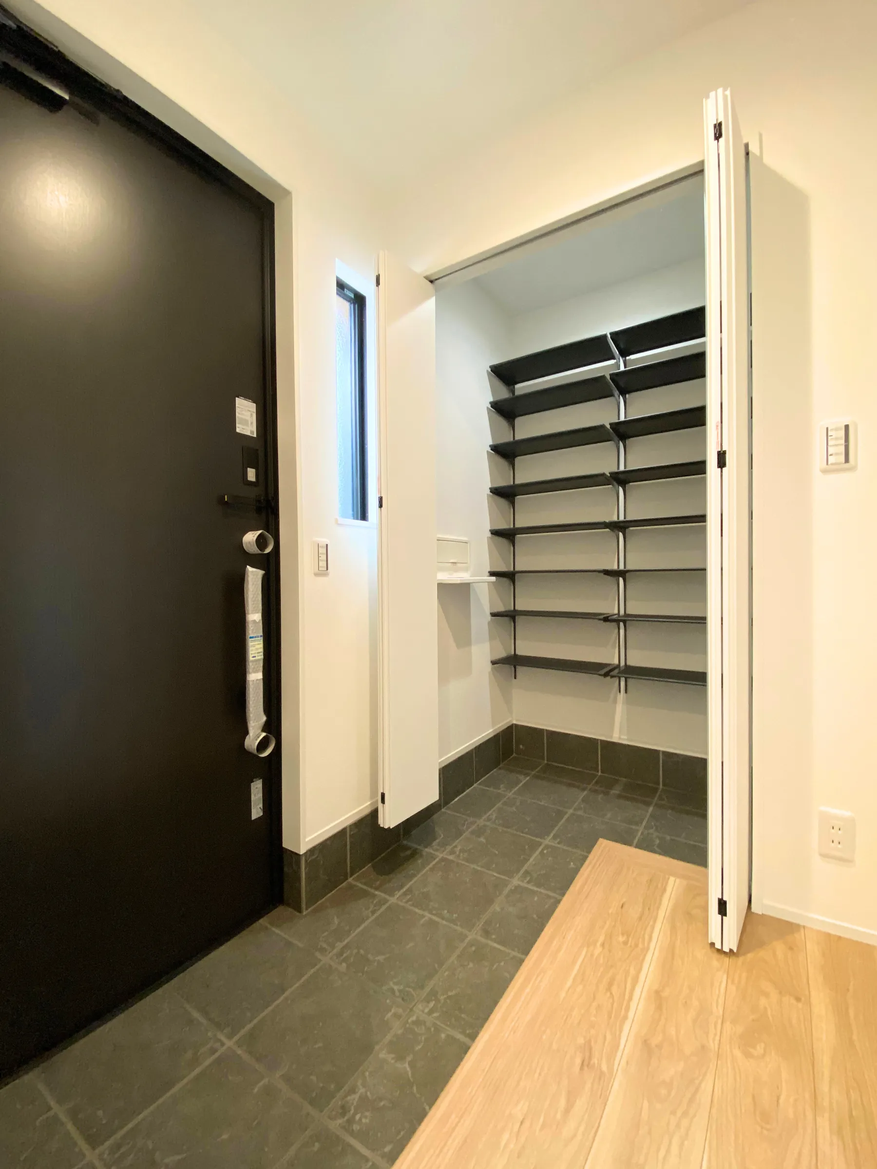 汚れたものも片付けやすく、掃除もしやすい、土間続きのシューズクローク。