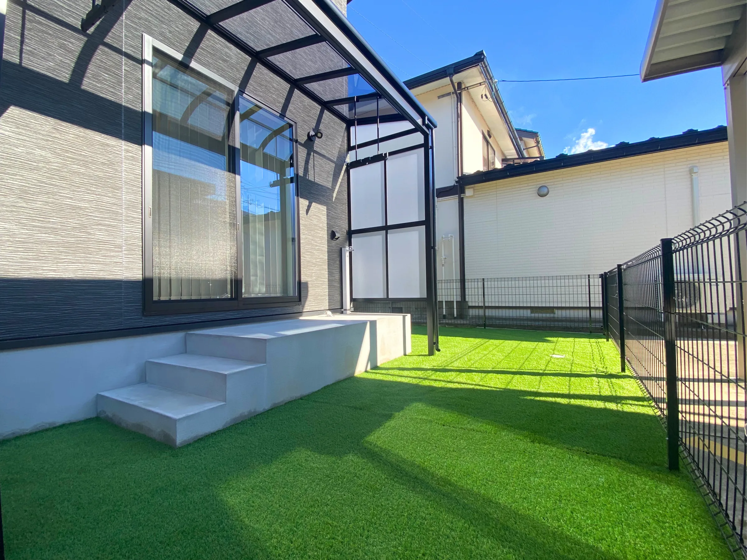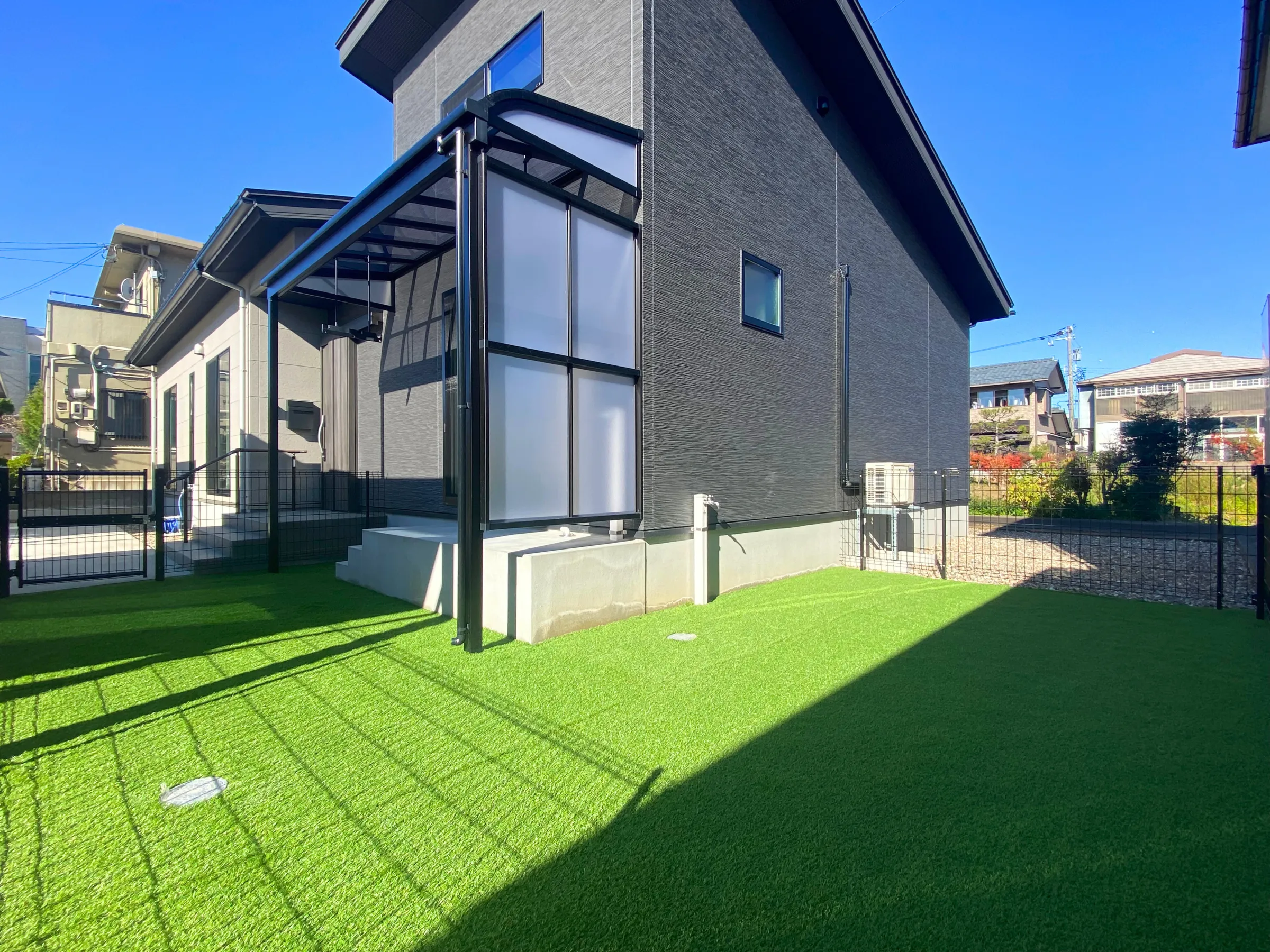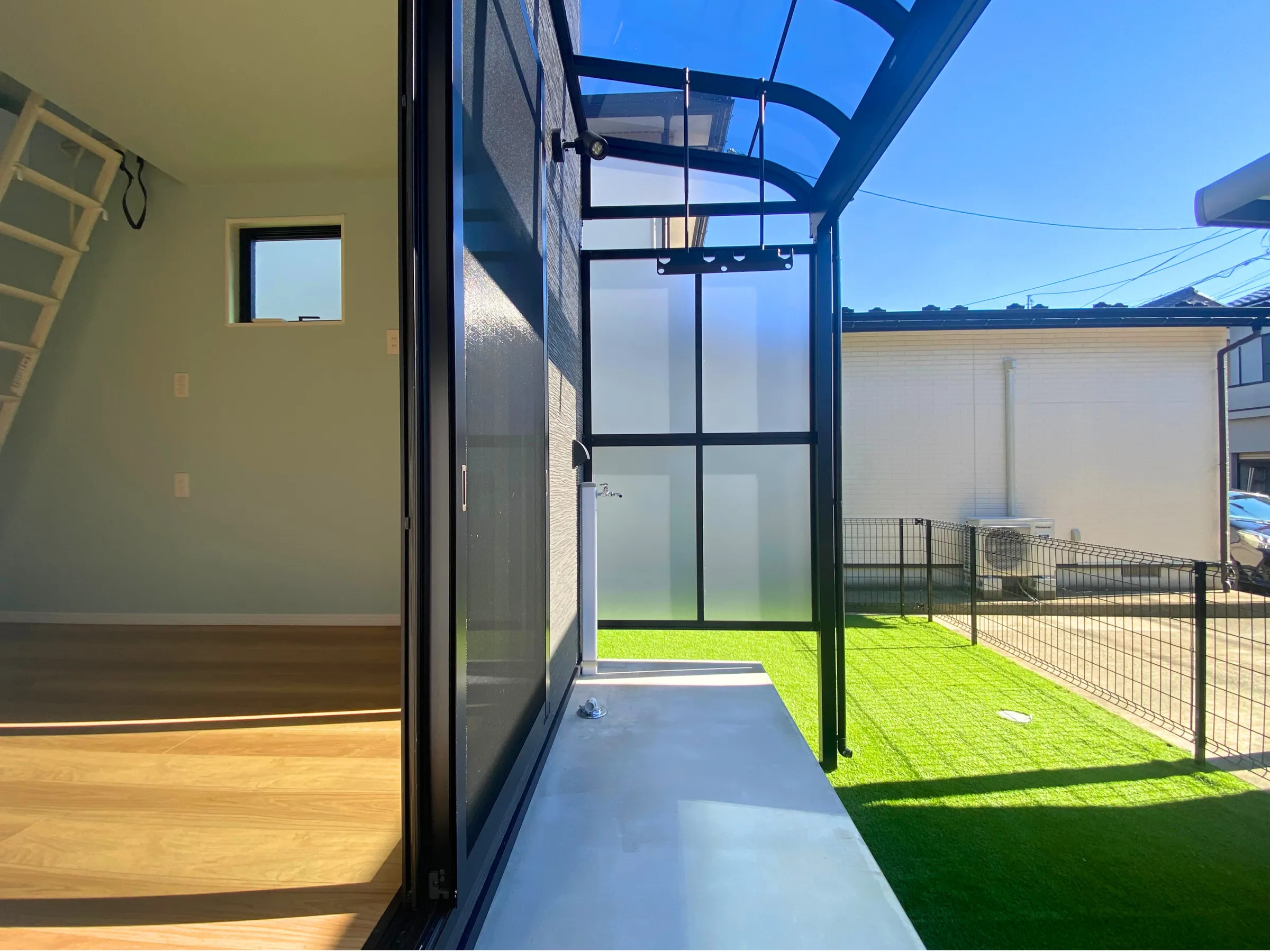 人工芝が敷き詰められた、日当たりのいいドッグラン。