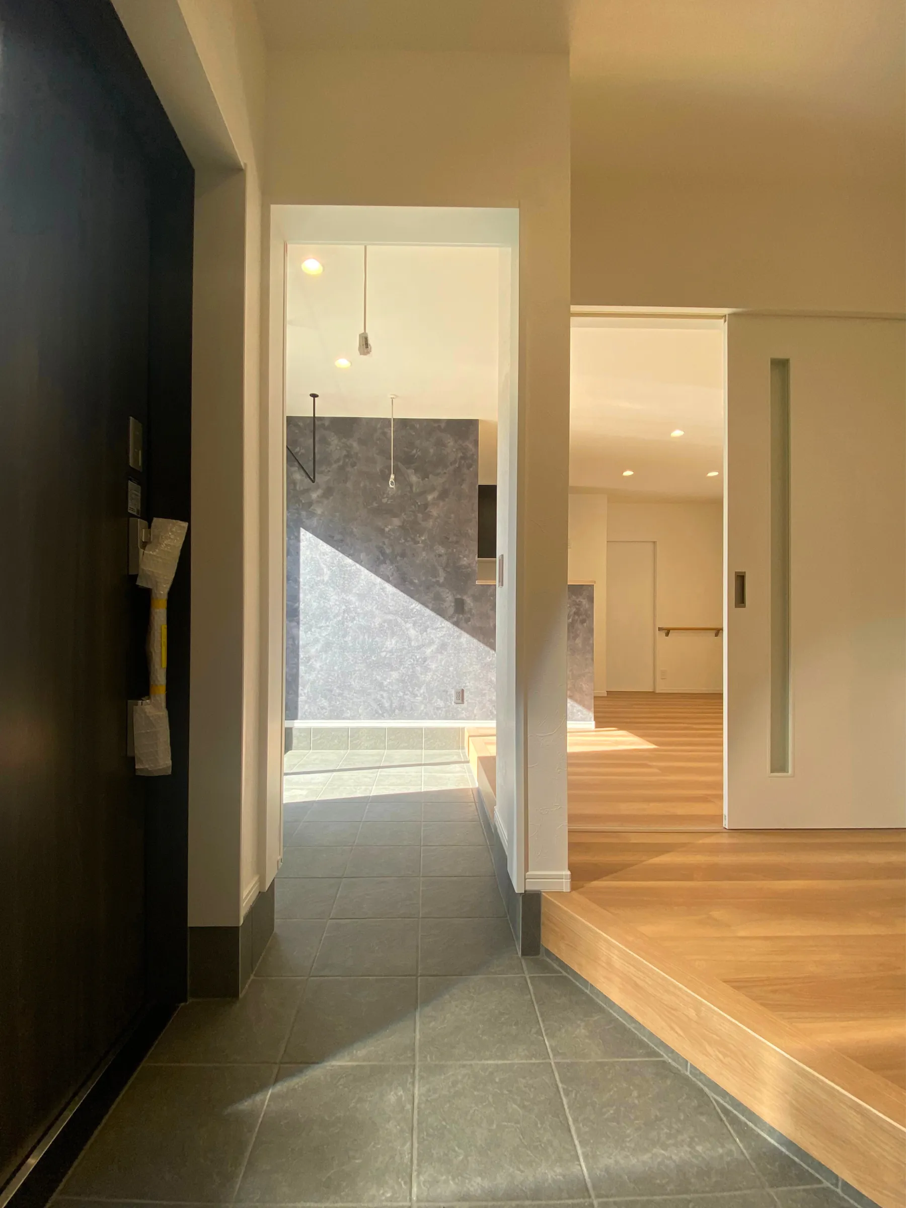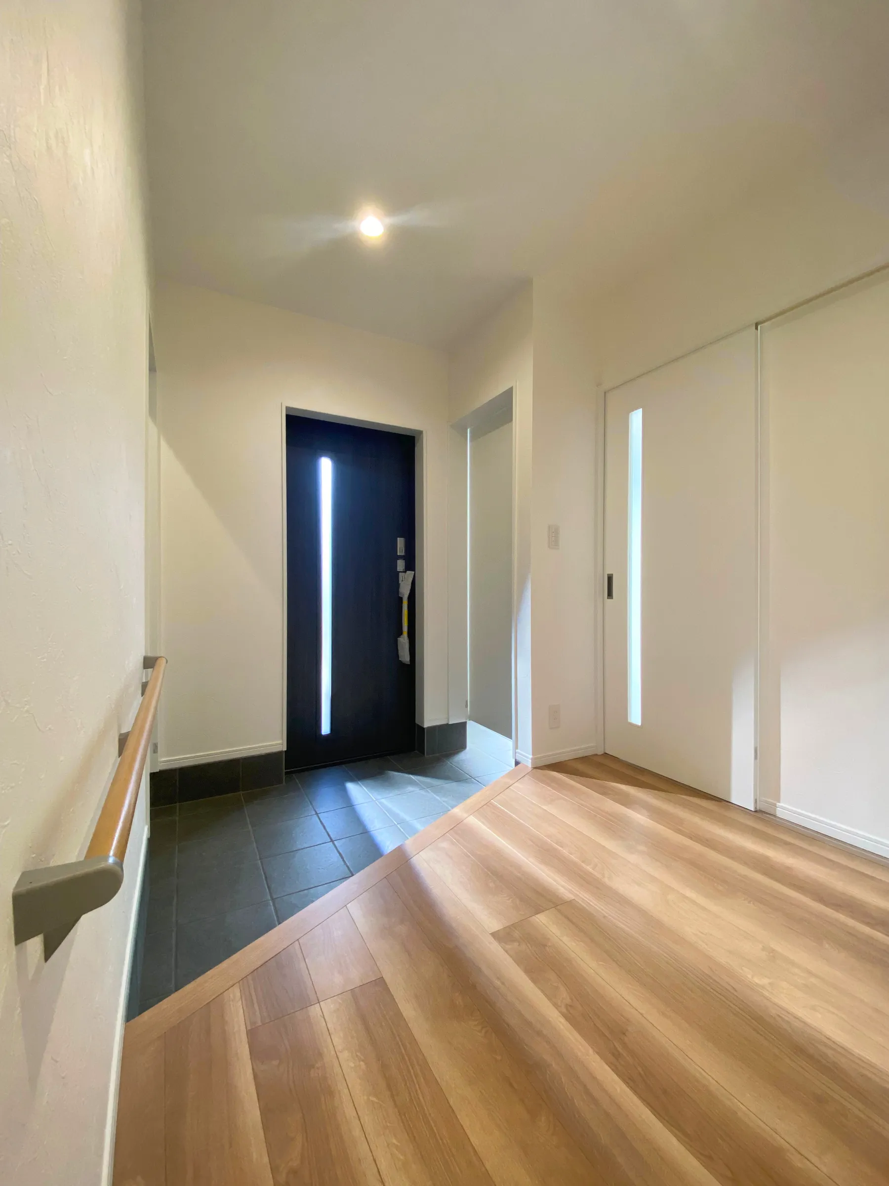 一方はLDKの土間スペースへ、もう一方にはシューズクロークのある脇玄関へ、とつながる玄関。