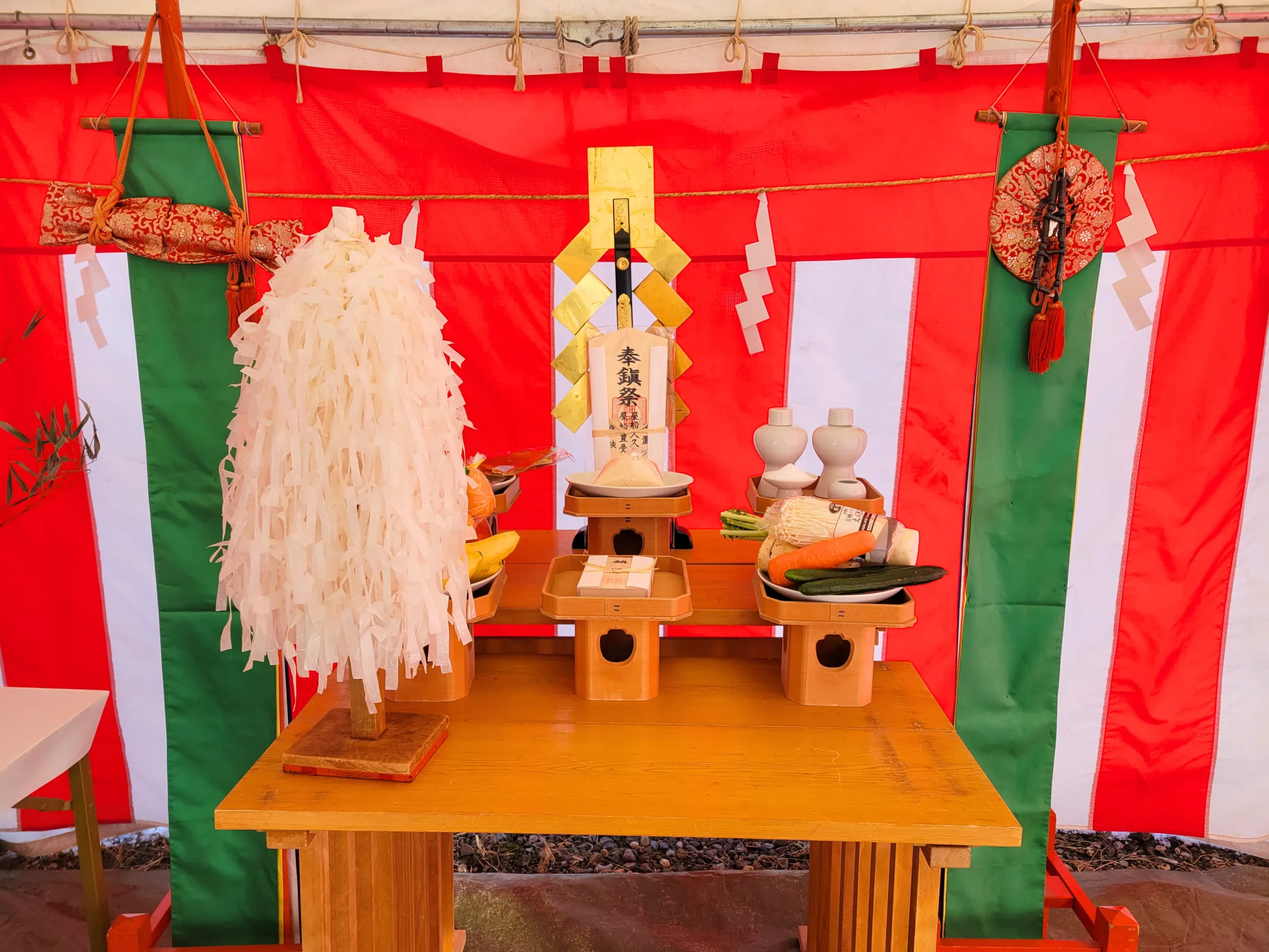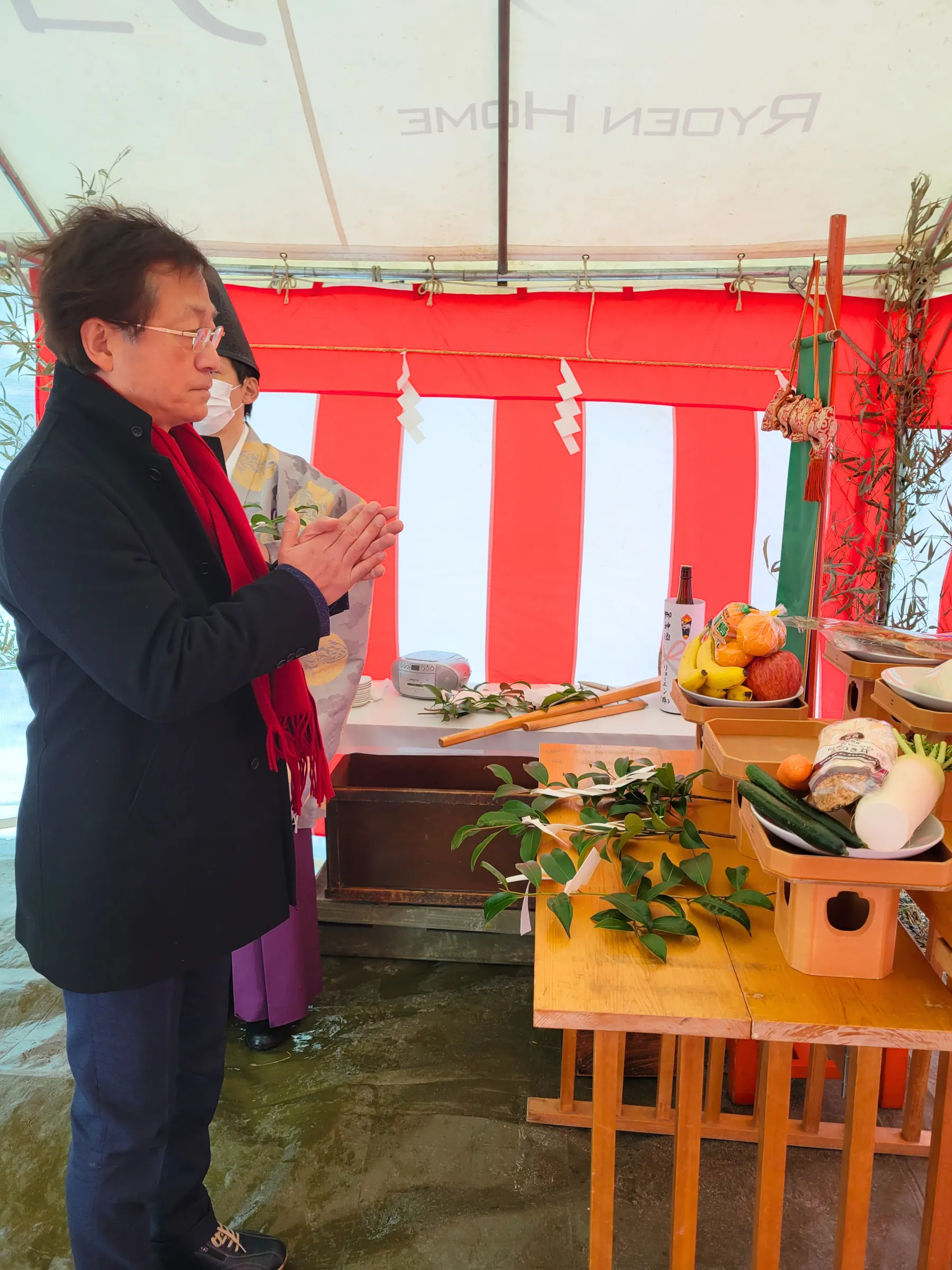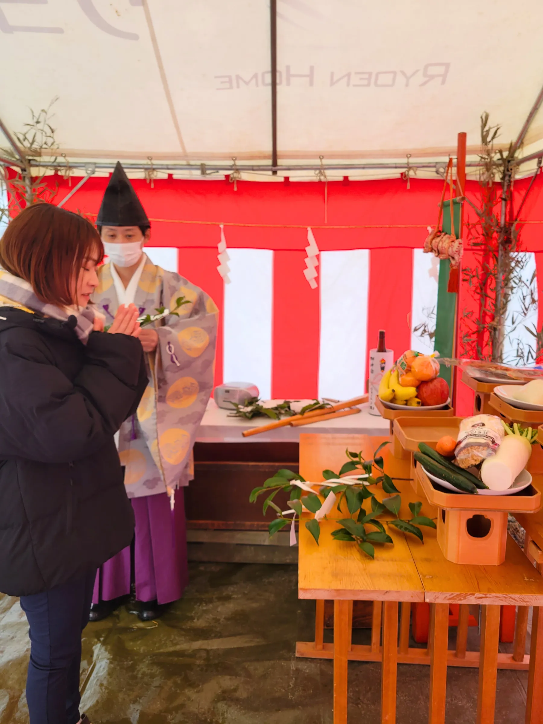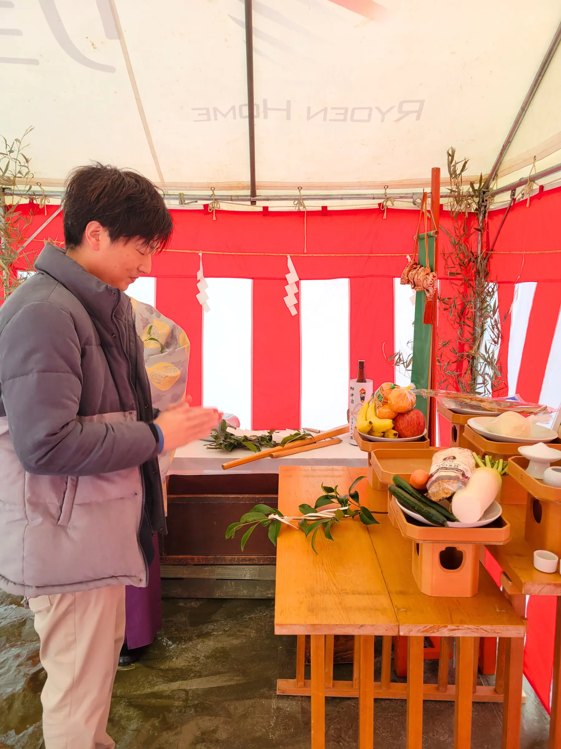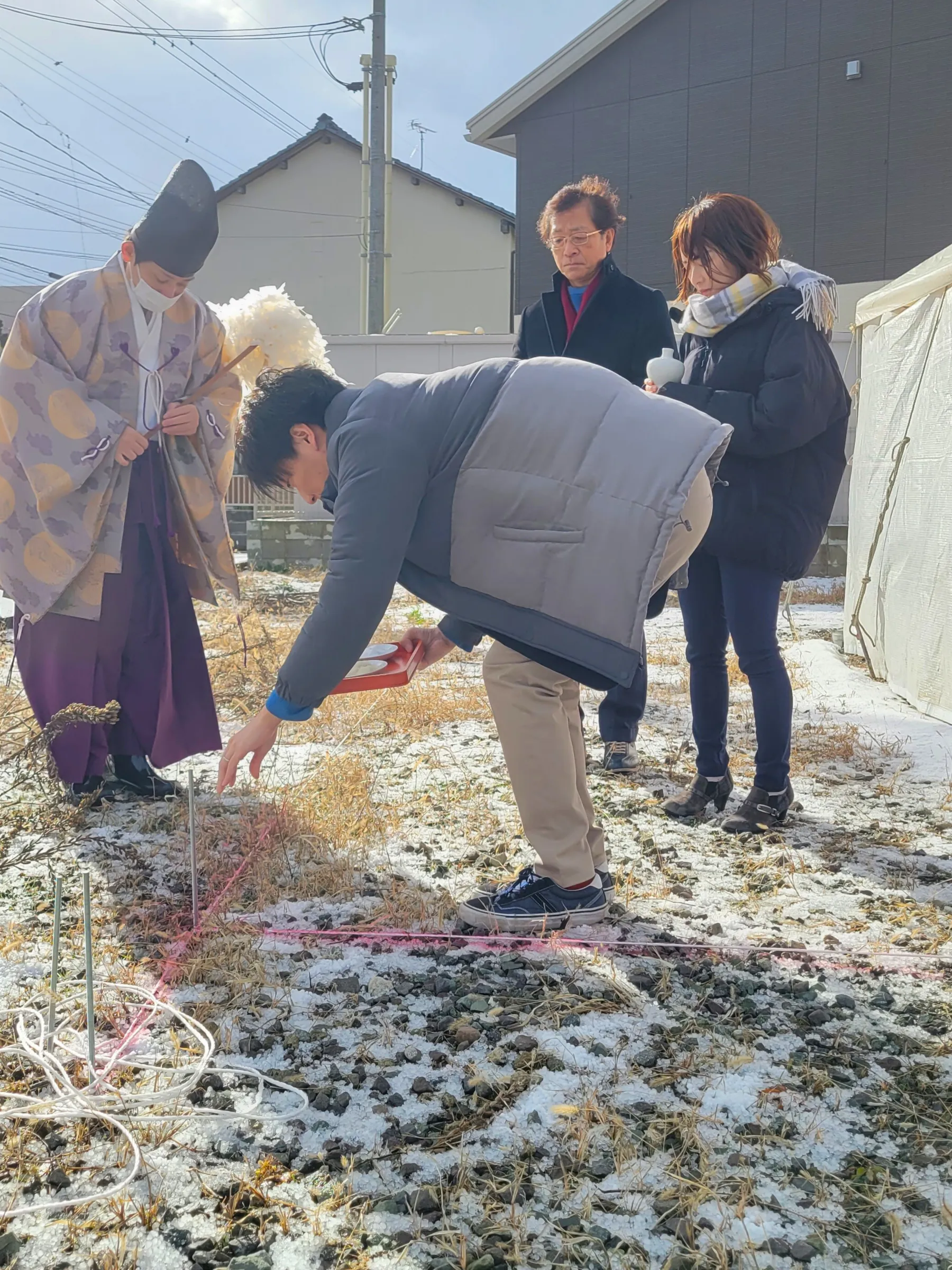 まずはこの土地の神様をお呼びする儀式を行い、建物の建つ四隅をお清めします。