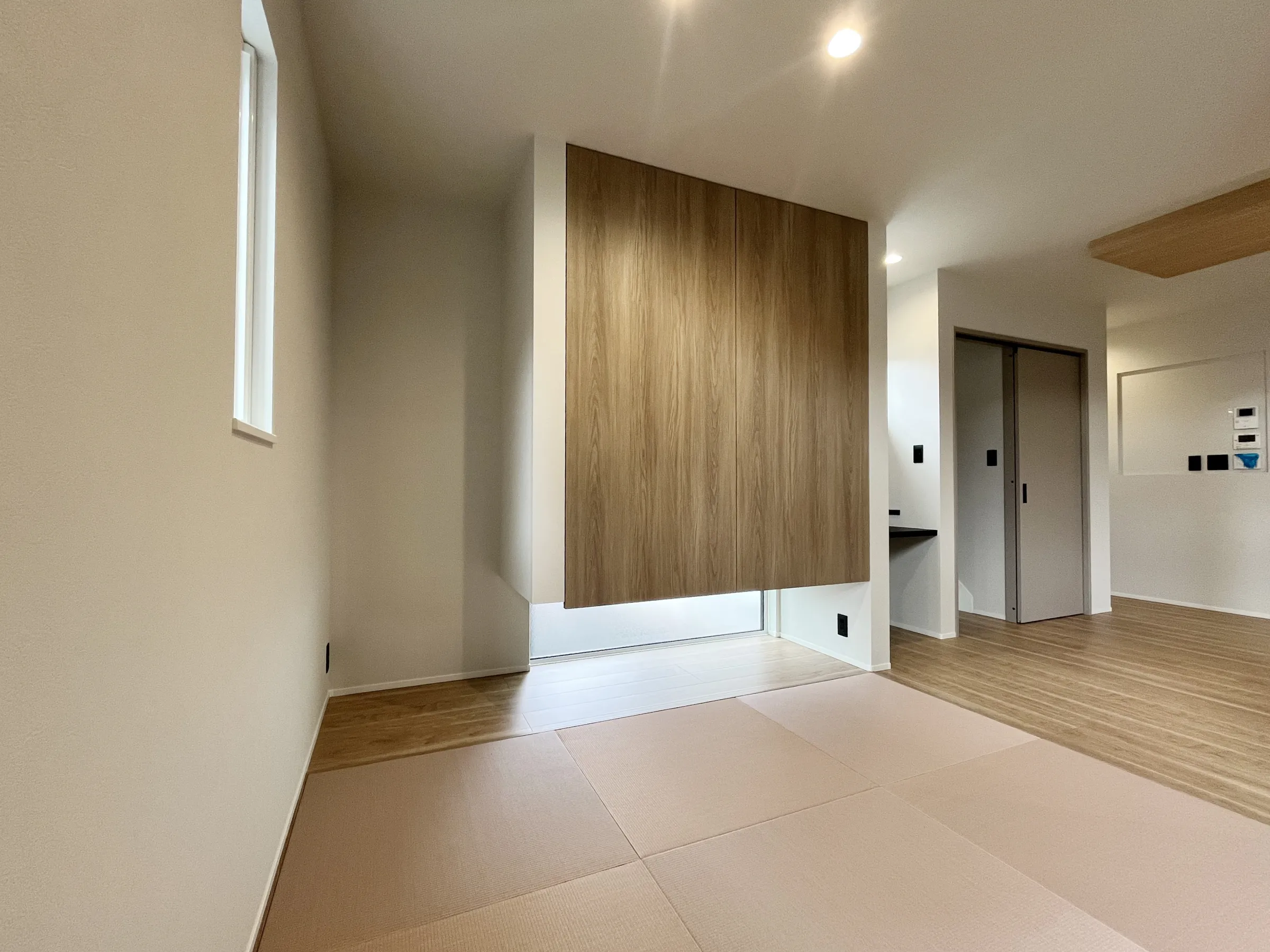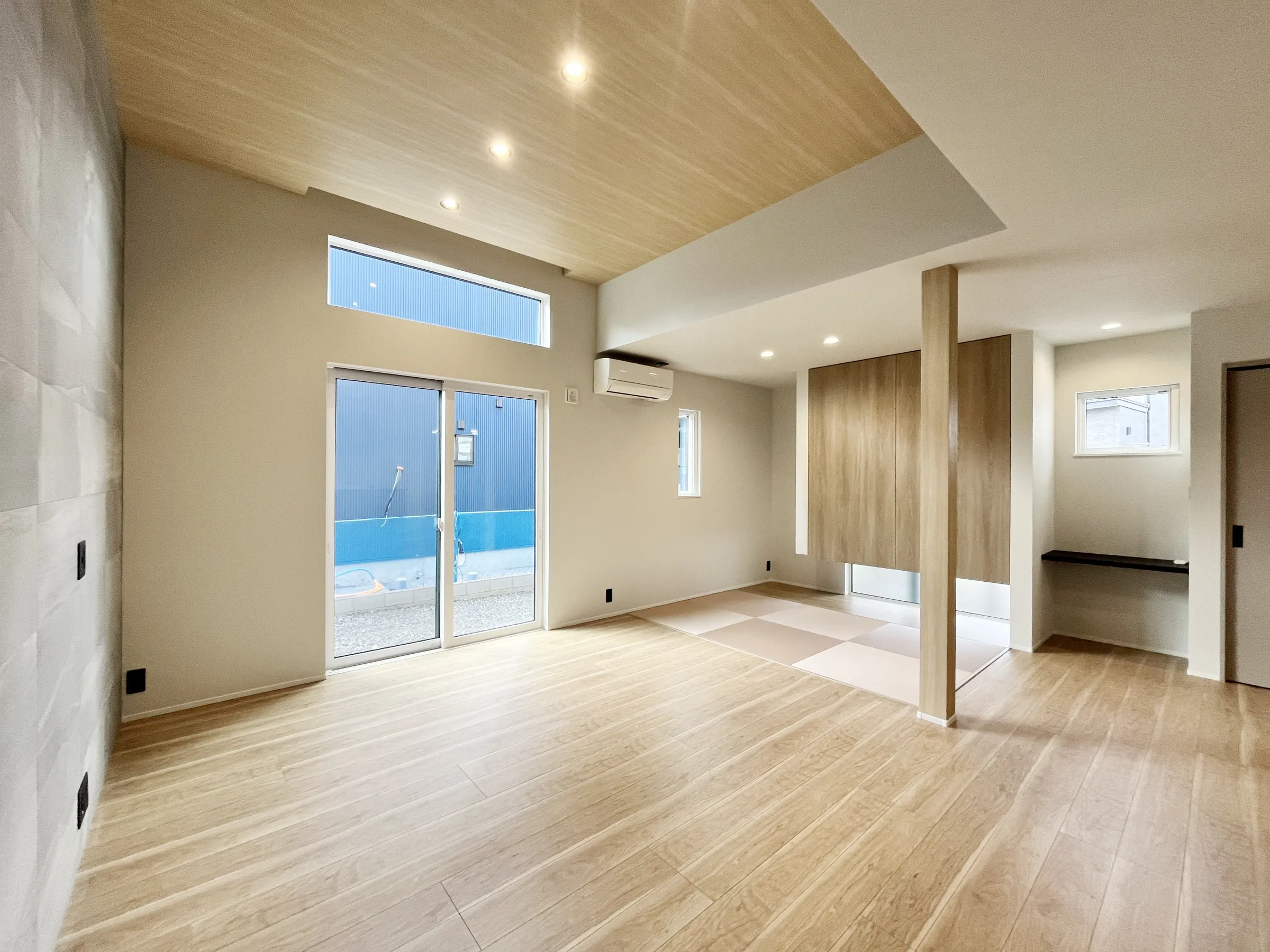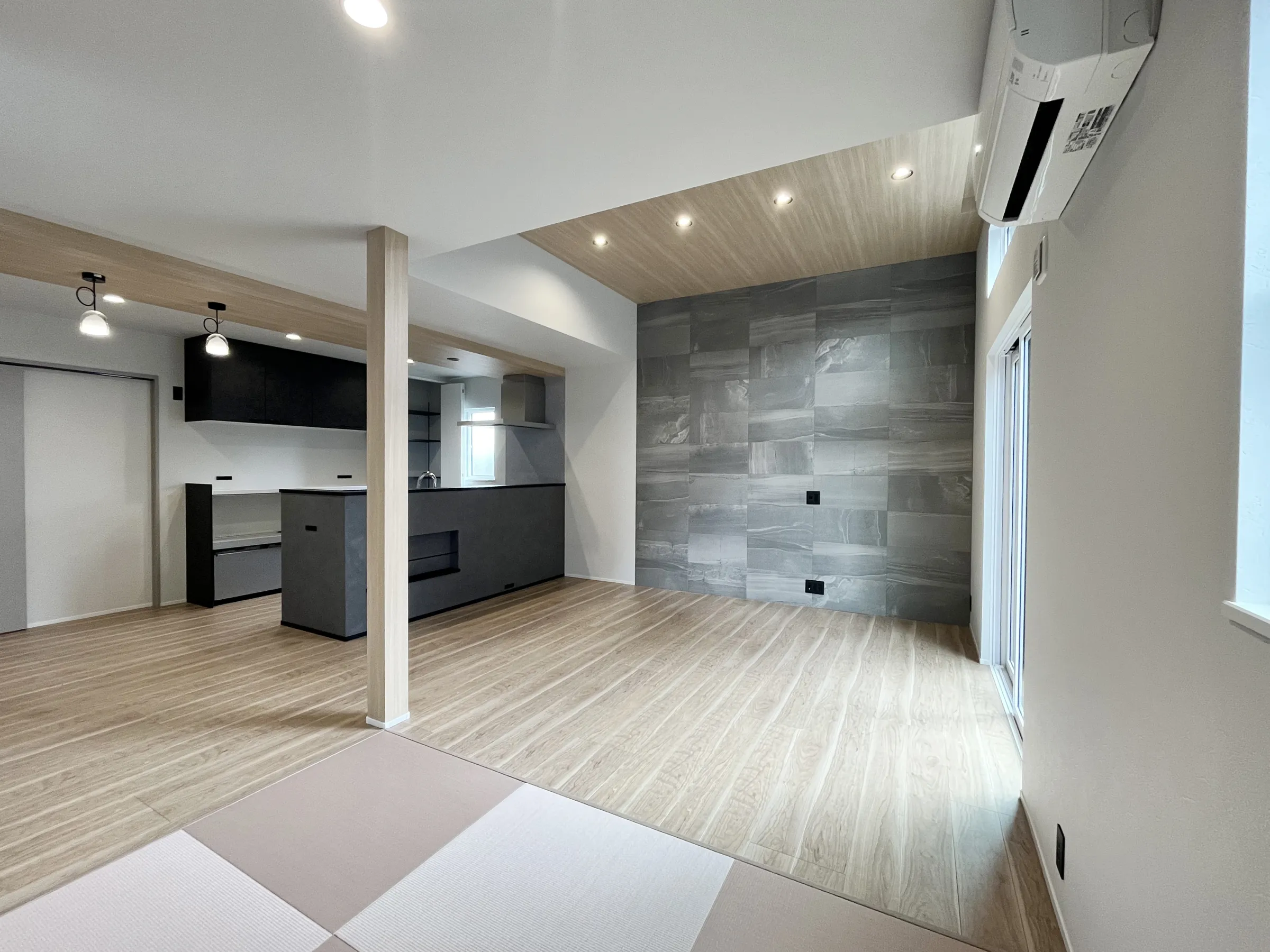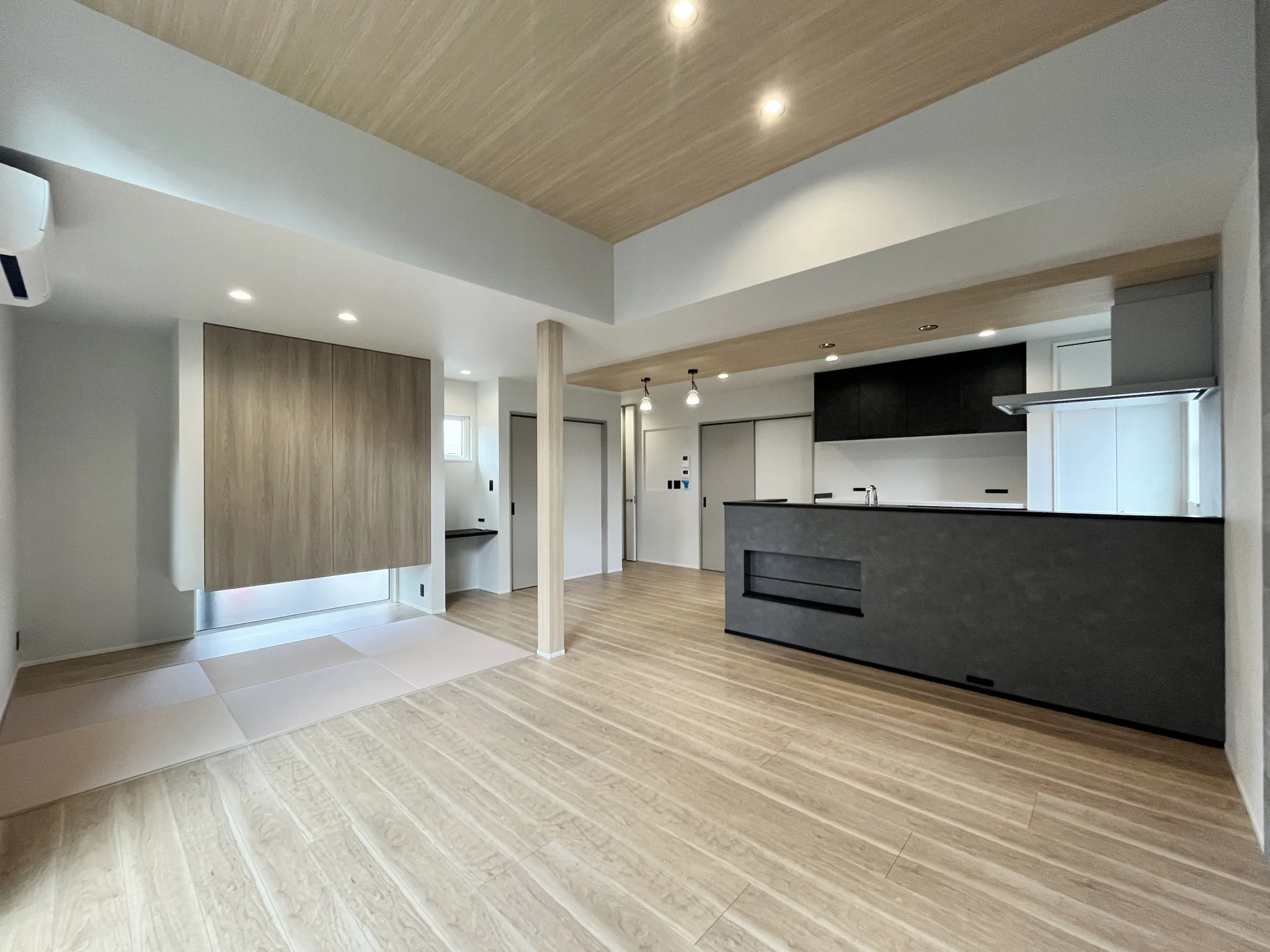 キッチンからの目線の先に3帖の畳コーナーがあり、お子様も過ごしやすい空間になっている約18帖のLDK。
