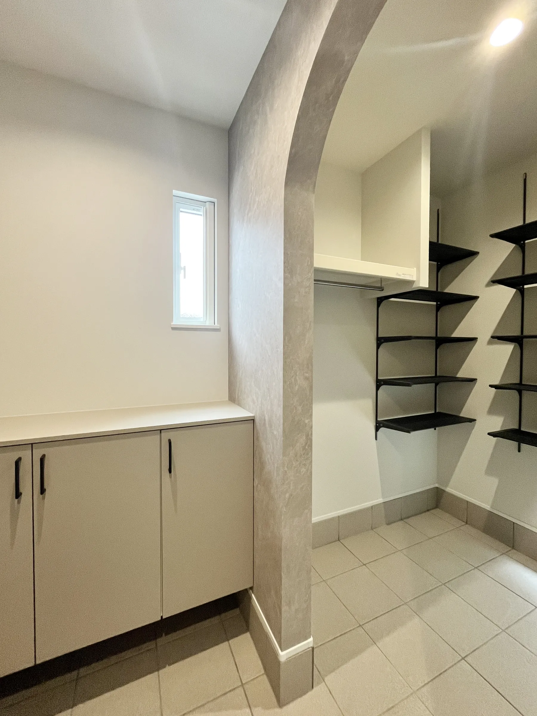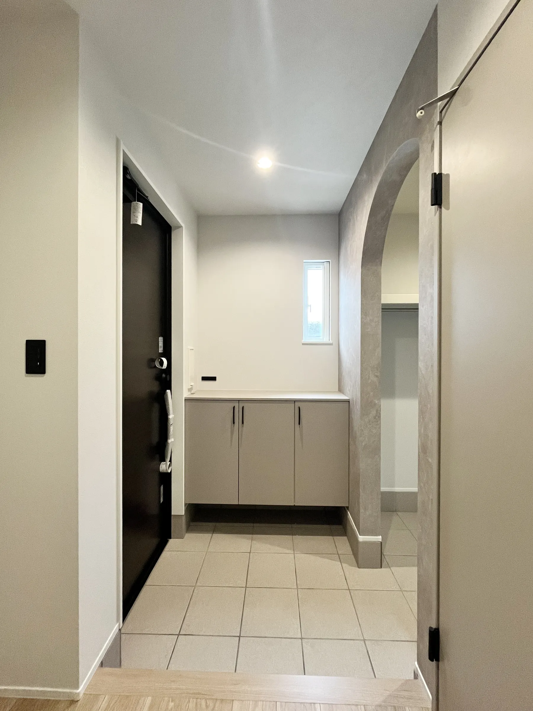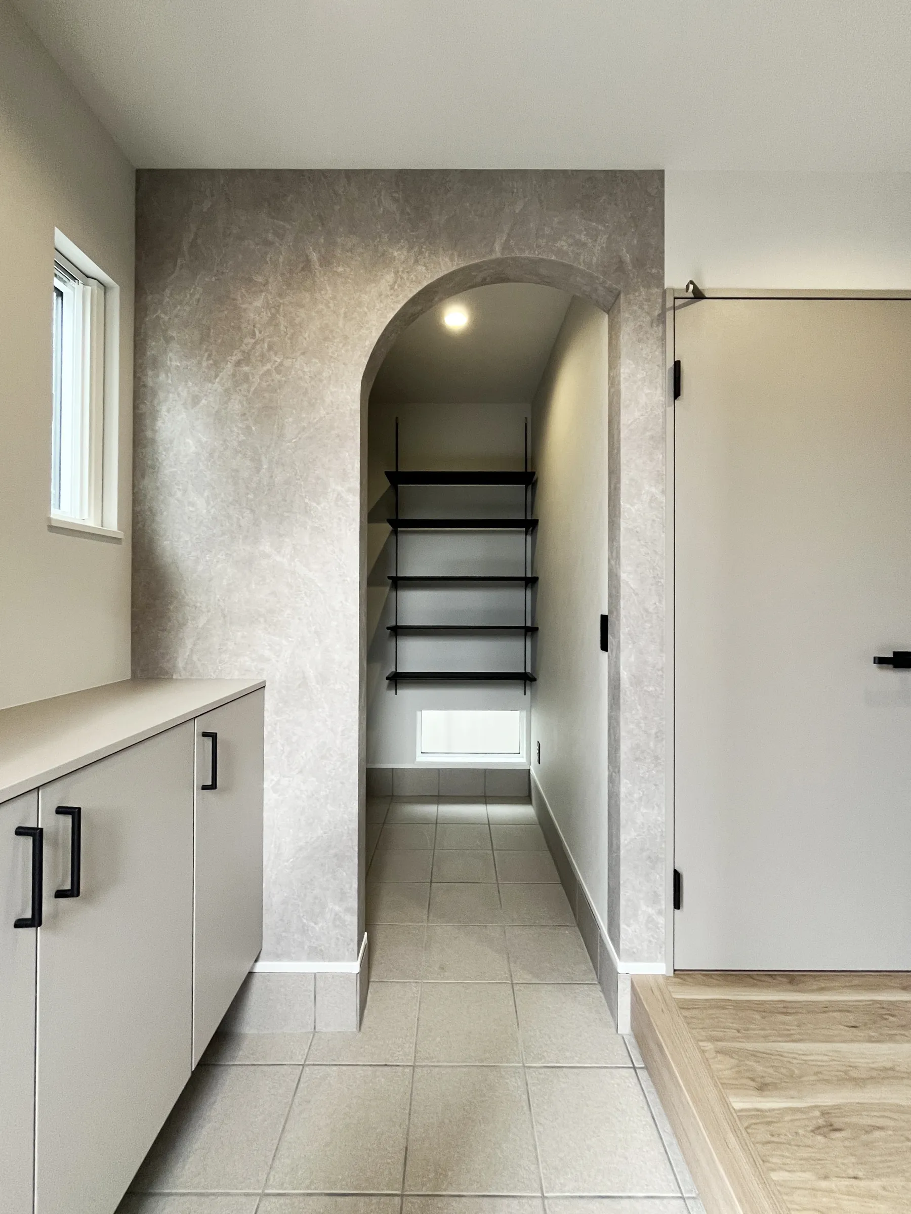 シューズクロークの入り口はRの垂れ壁に。スモークカラーでまとまったオシャレな玄関。