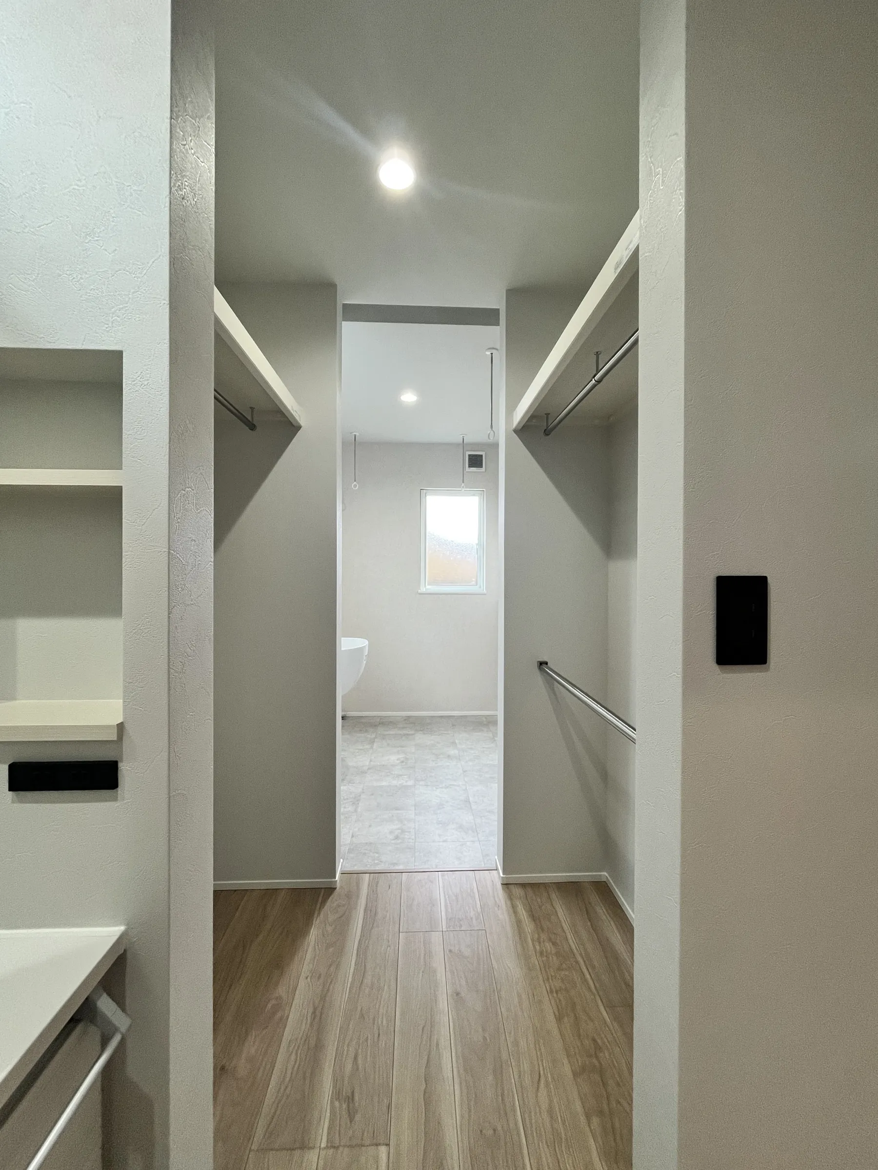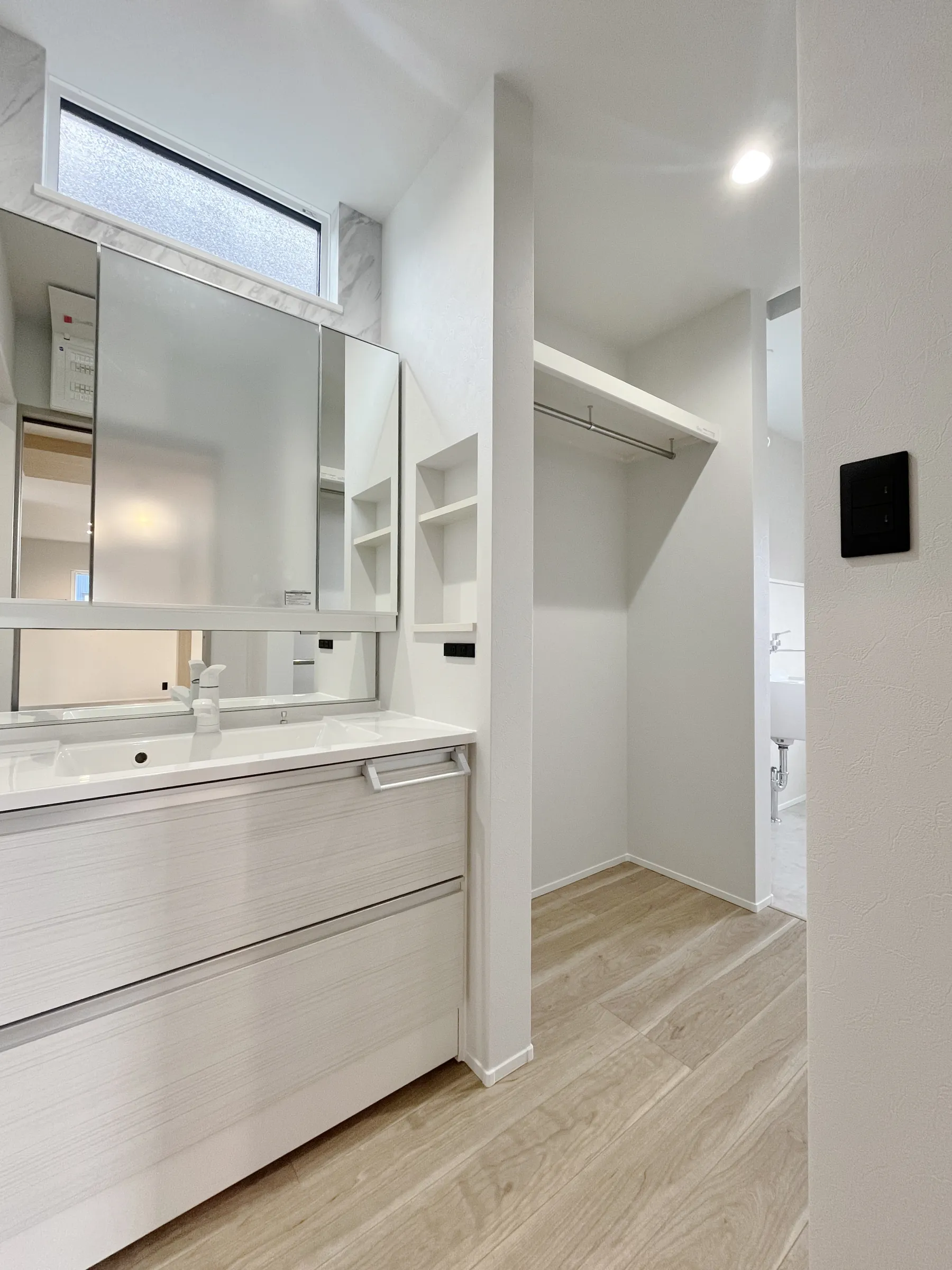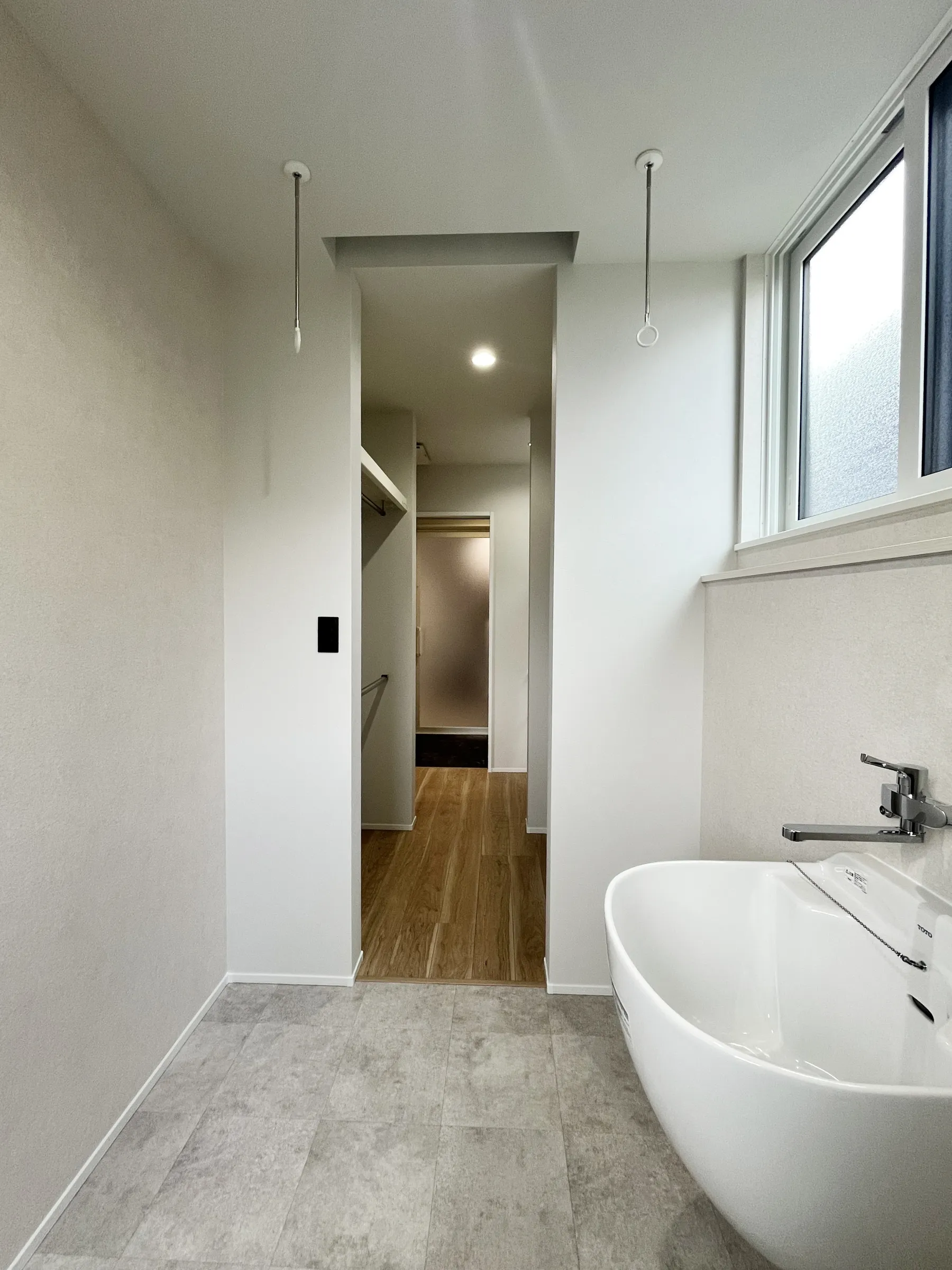 バス・洗面脱衣室・ファミリークローゼット・サンルームが一直線に配置され、「洗う/干す/片付ける」の一連の作業をまとめて行うことができる家事をしやすい動線を確保。