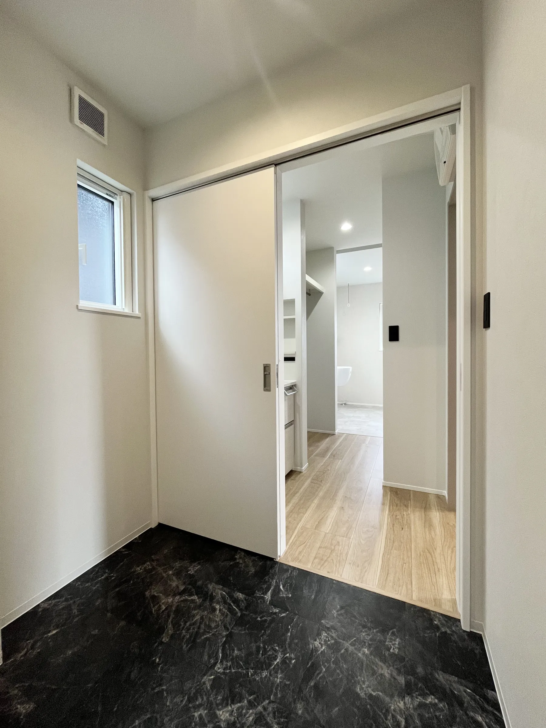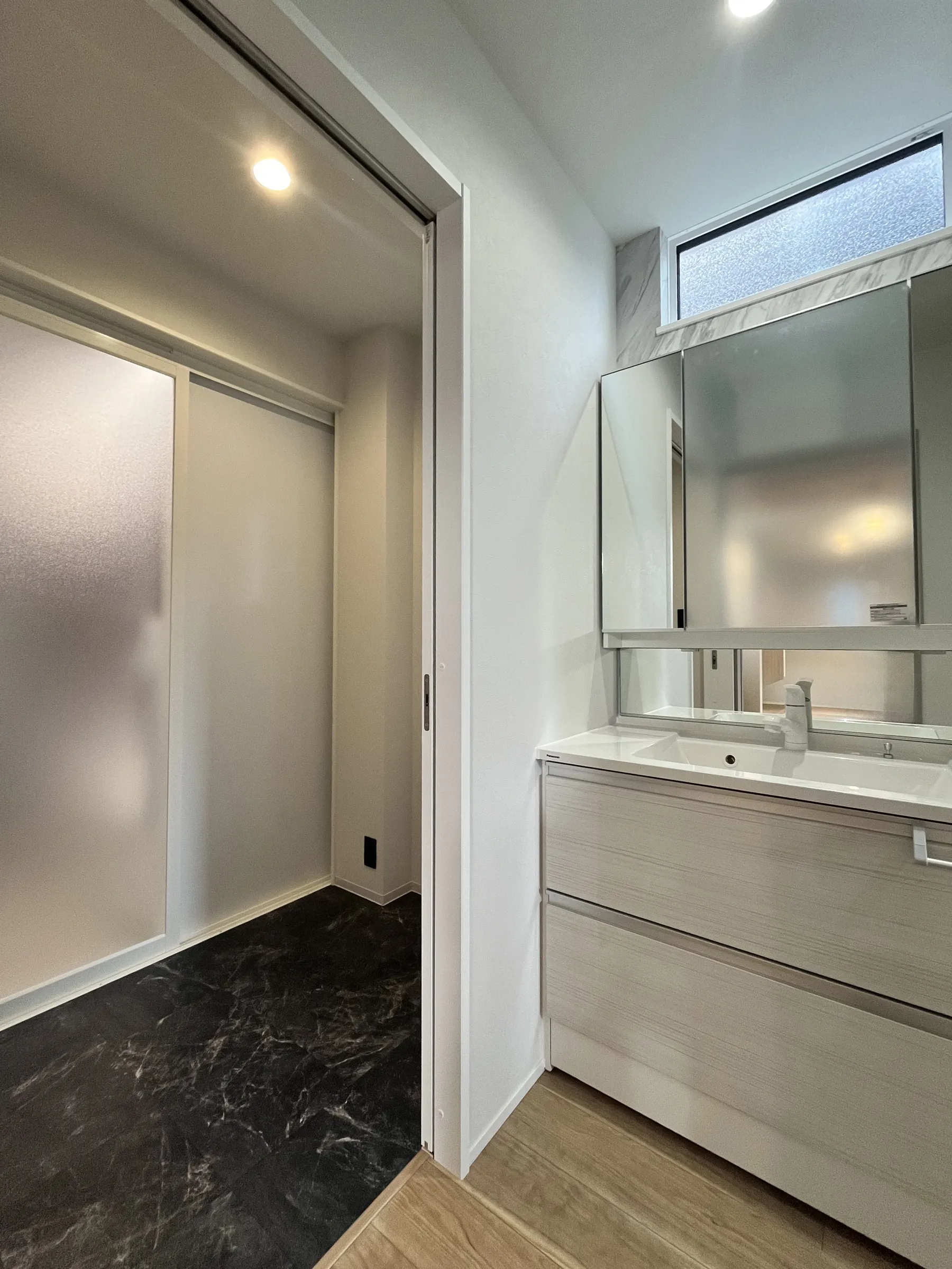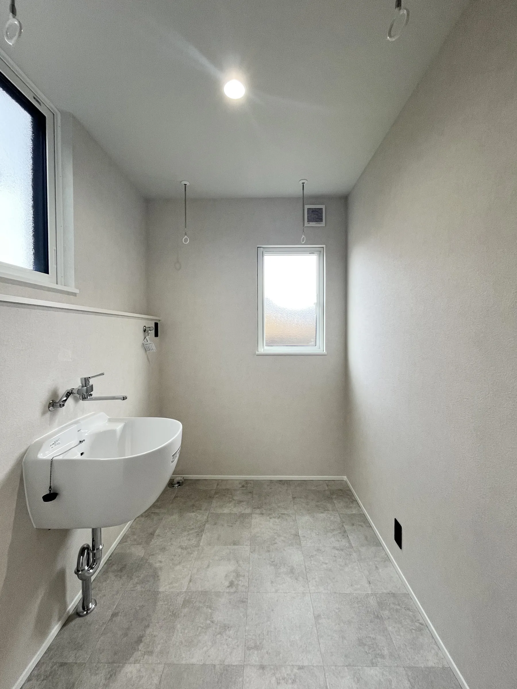 バス・洗面脱衣室・ファミリークローゼット・サンルームが一直線に配置され、「洗う/干す/片付ける」の一連の作業をまとめて行うことができる家事をしやすい動線を確保。