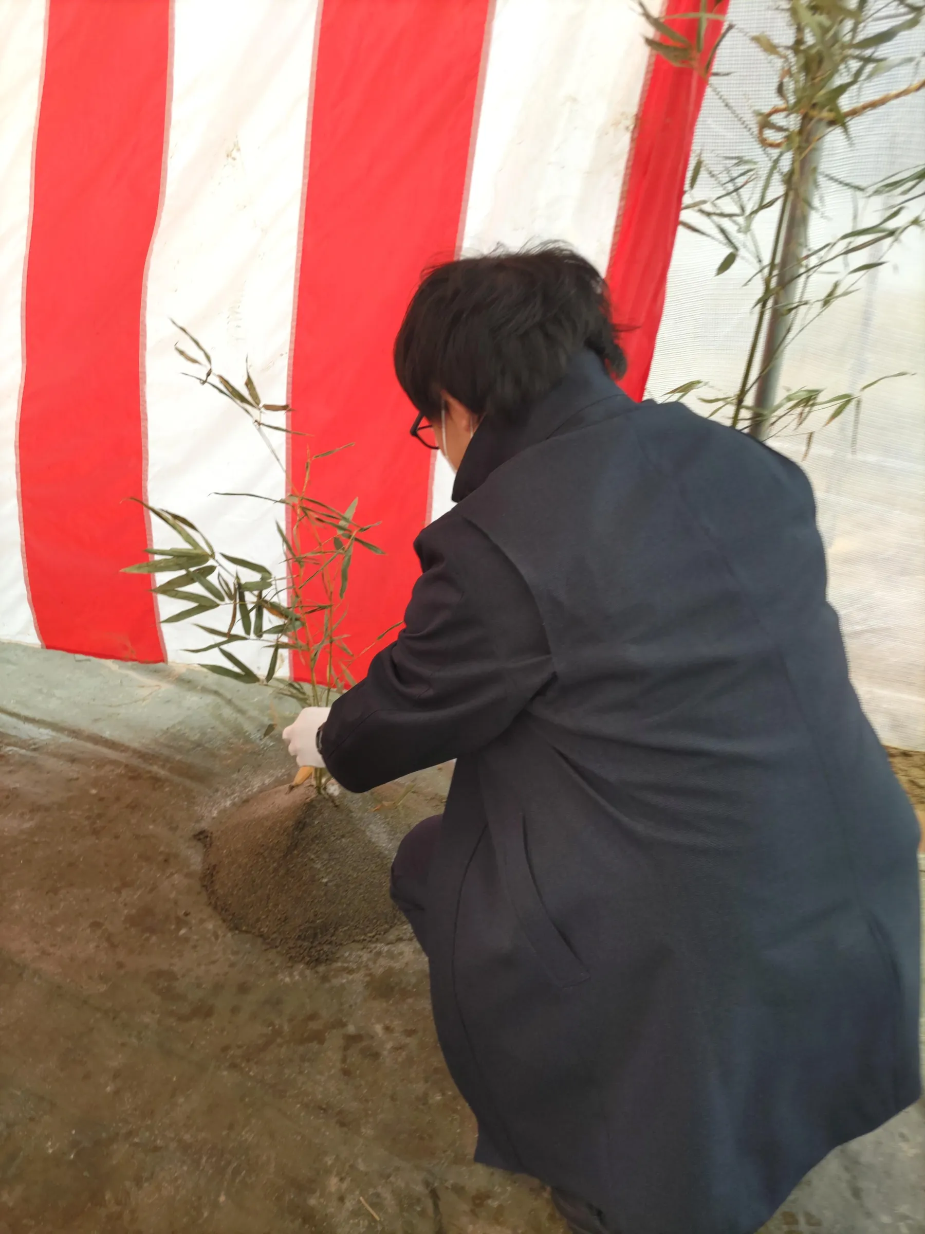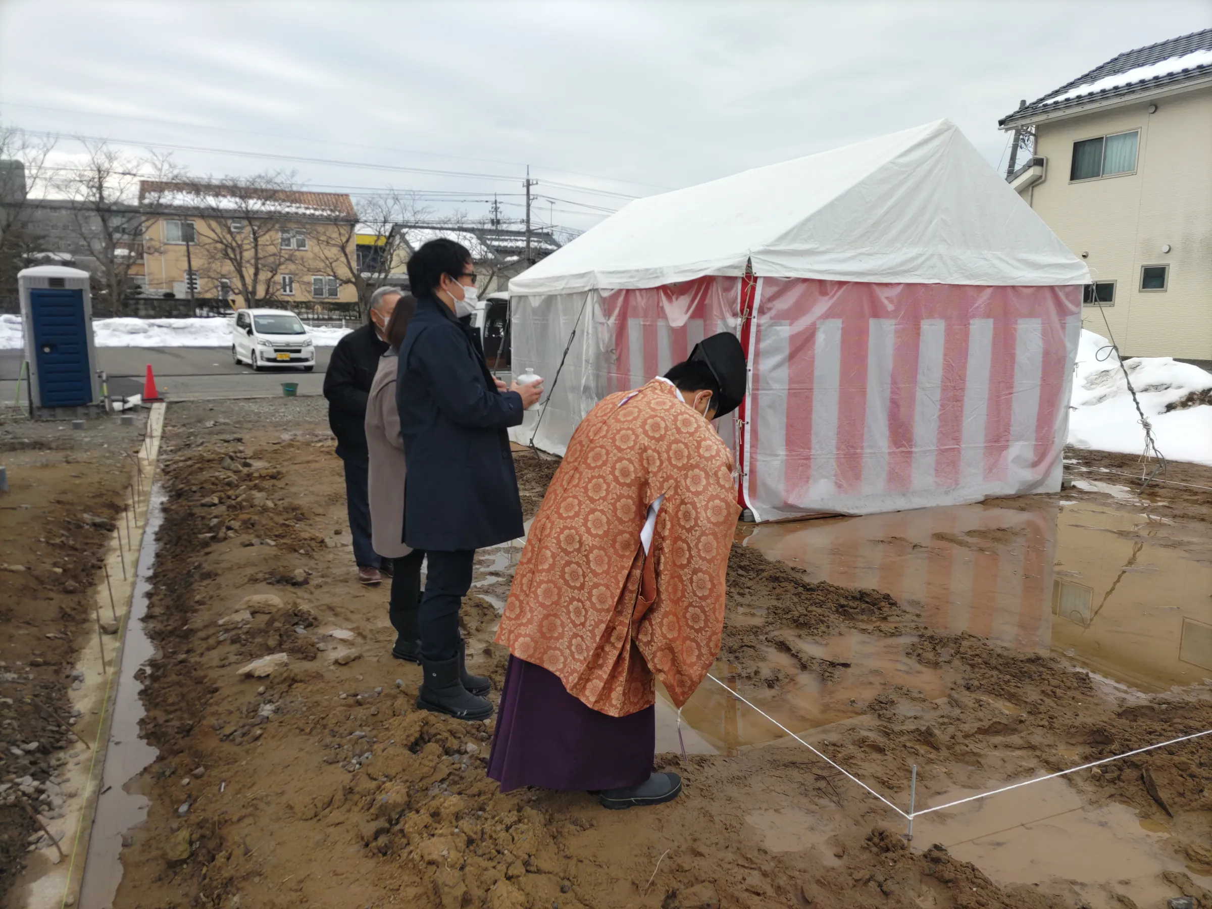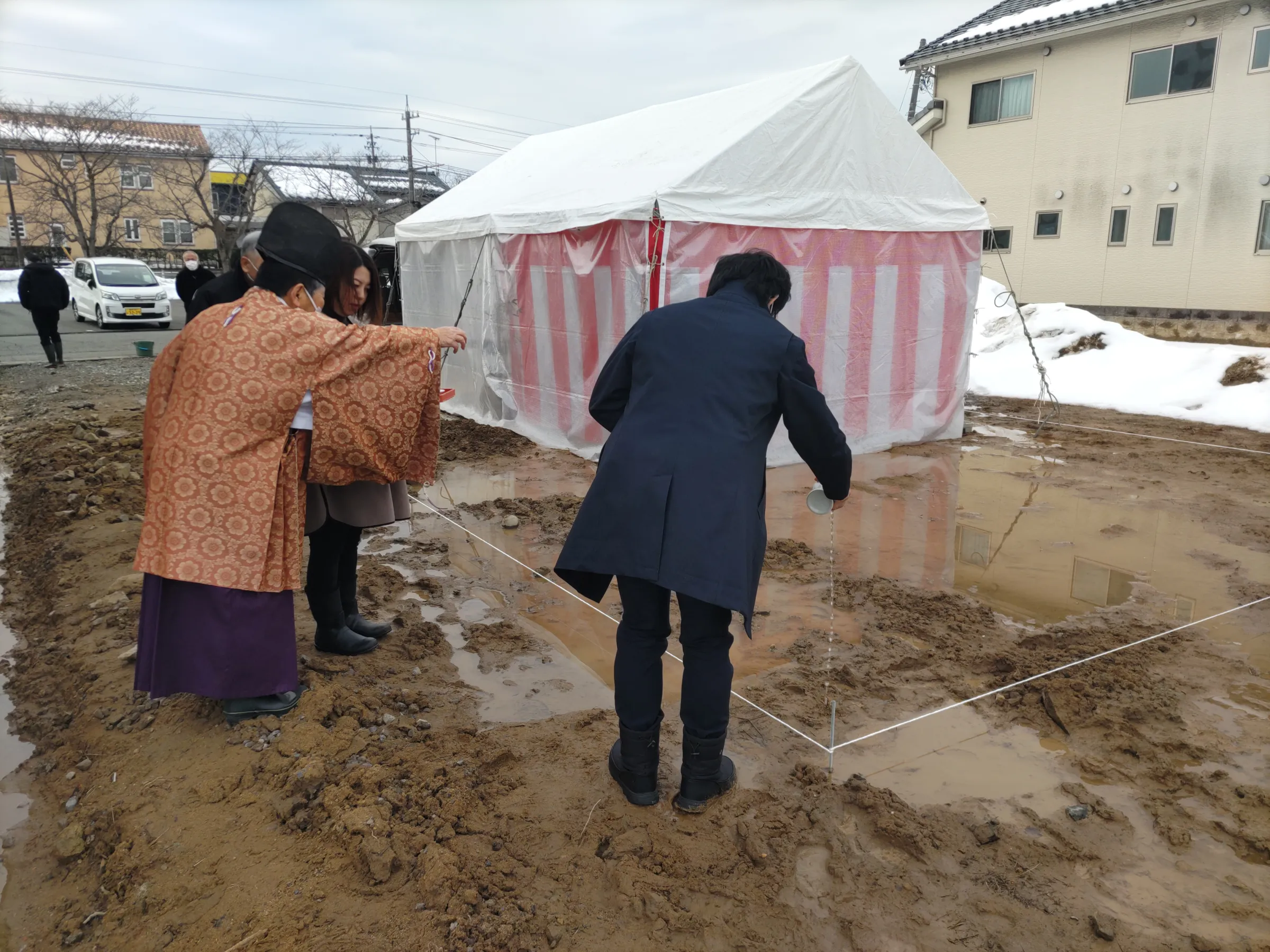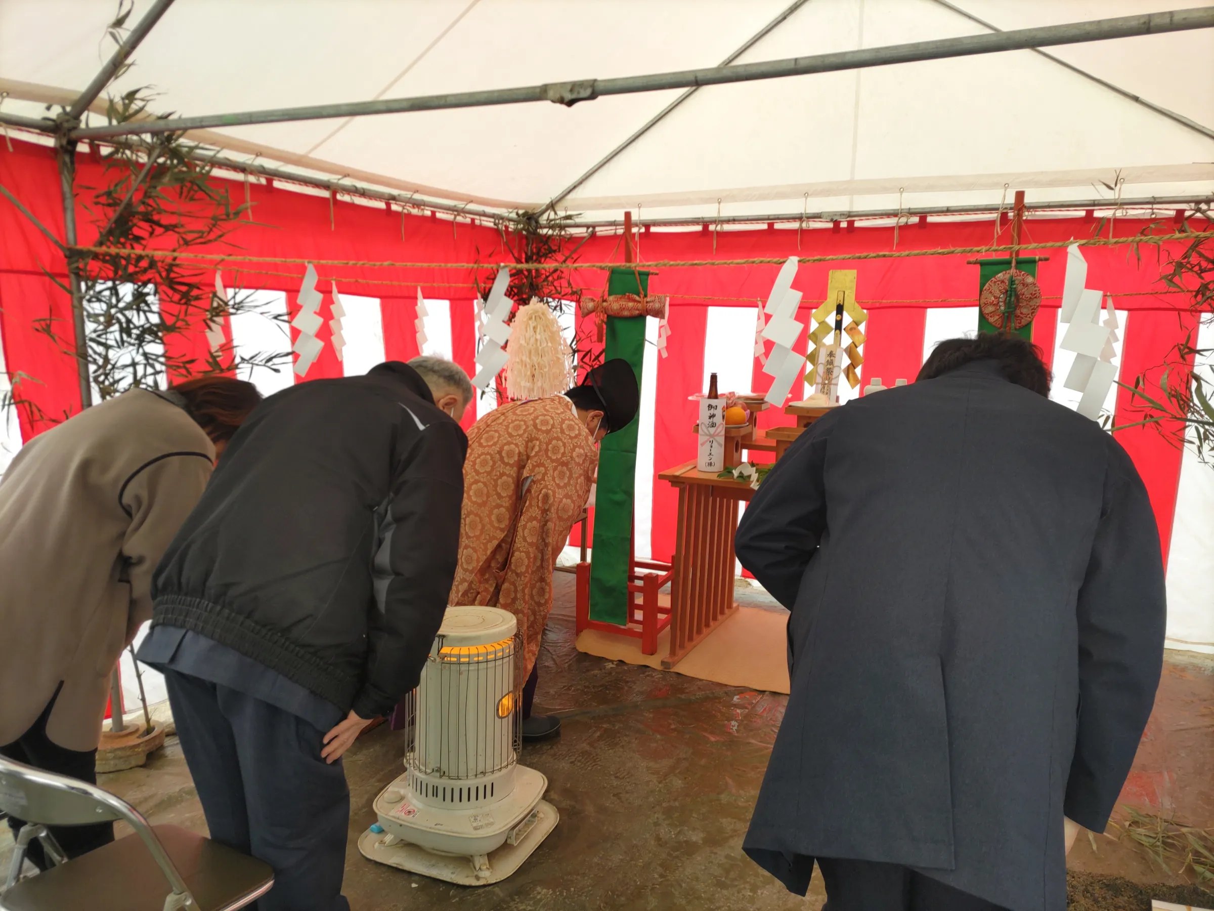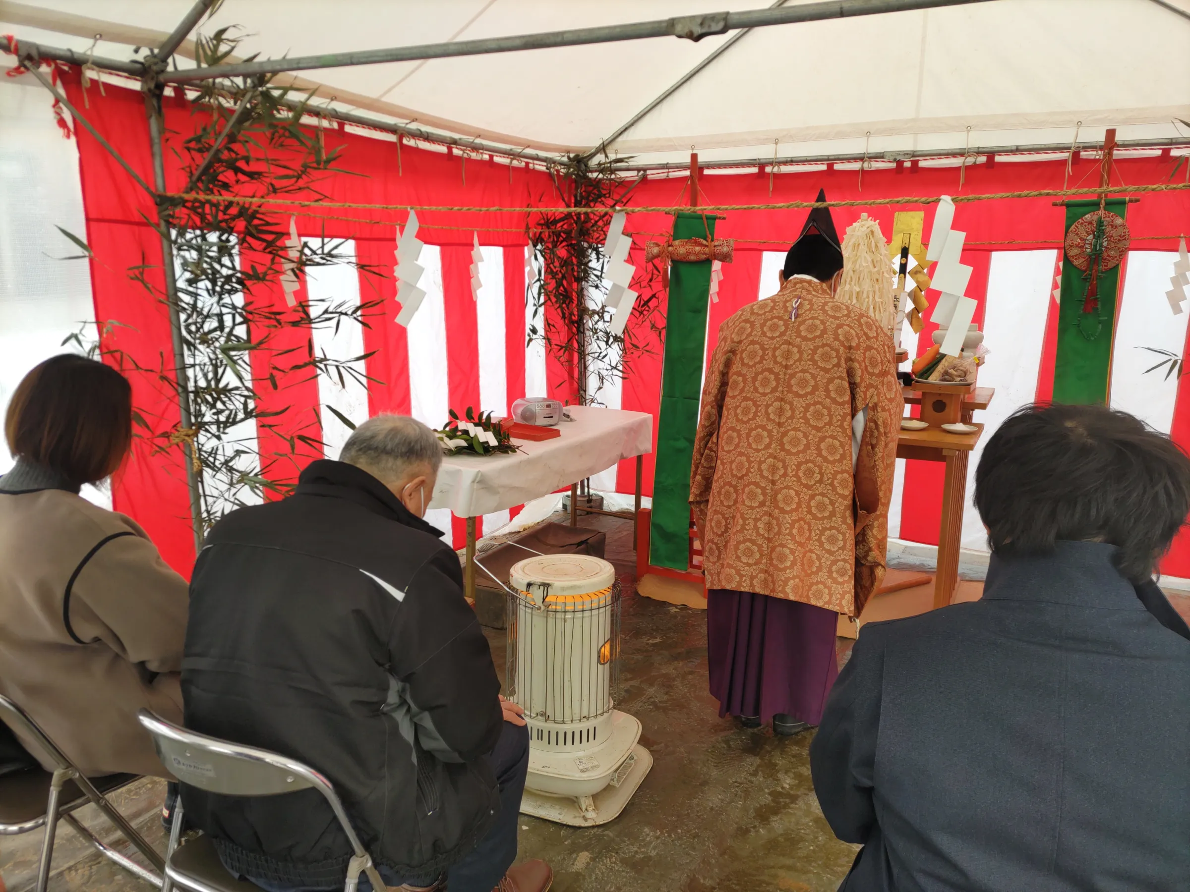 まずはこの土地の神様をお呼びする儀式を行い、建物の建つ四隅をお清めします。