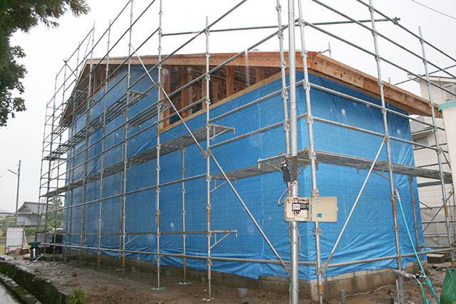 この後、屋根の下地材を張り 防水としてアスファルトルーフィングを施工します。